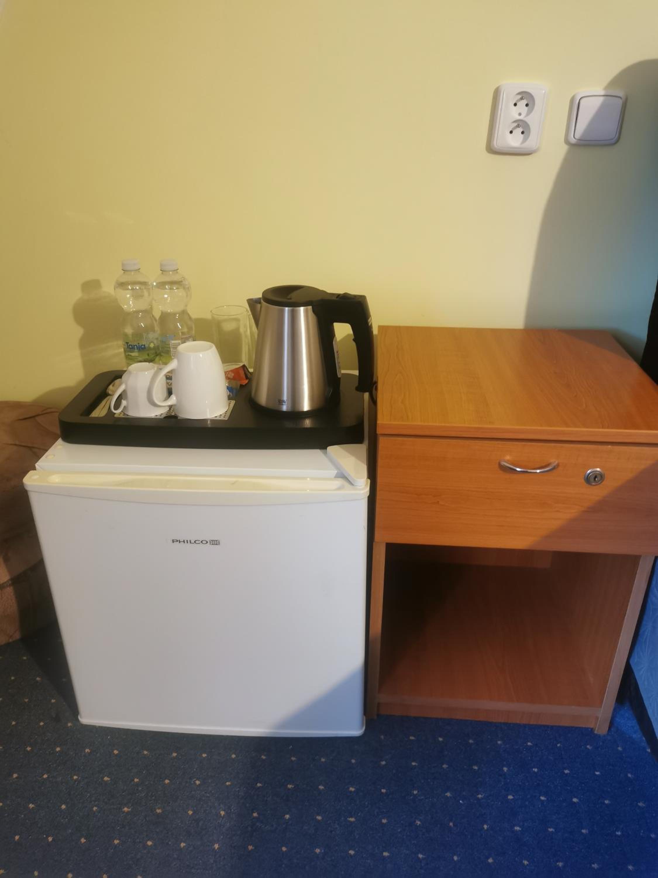 Balená voda na pokoji v ceně, lednice, rychlovarná konvice a možnost uvařit si kafe nebo čaj.