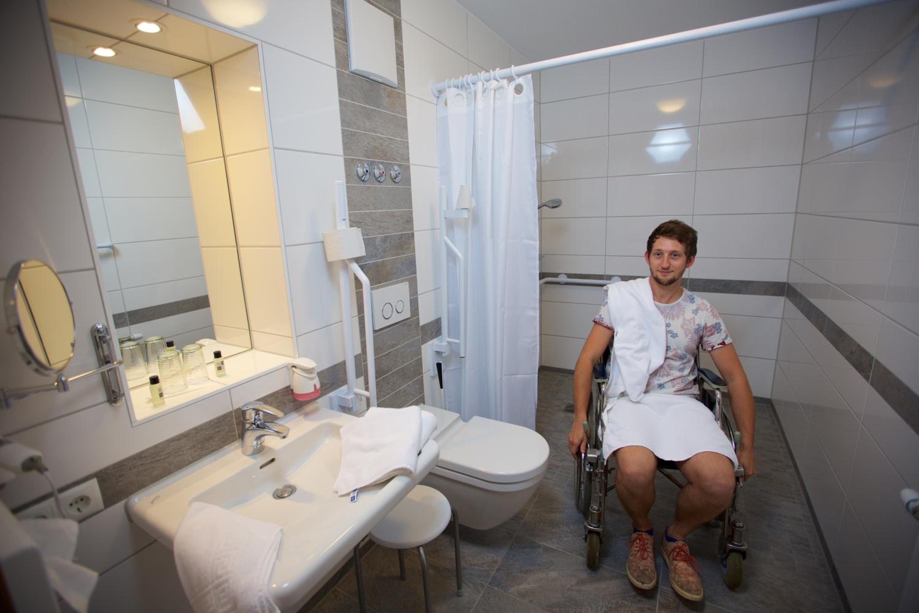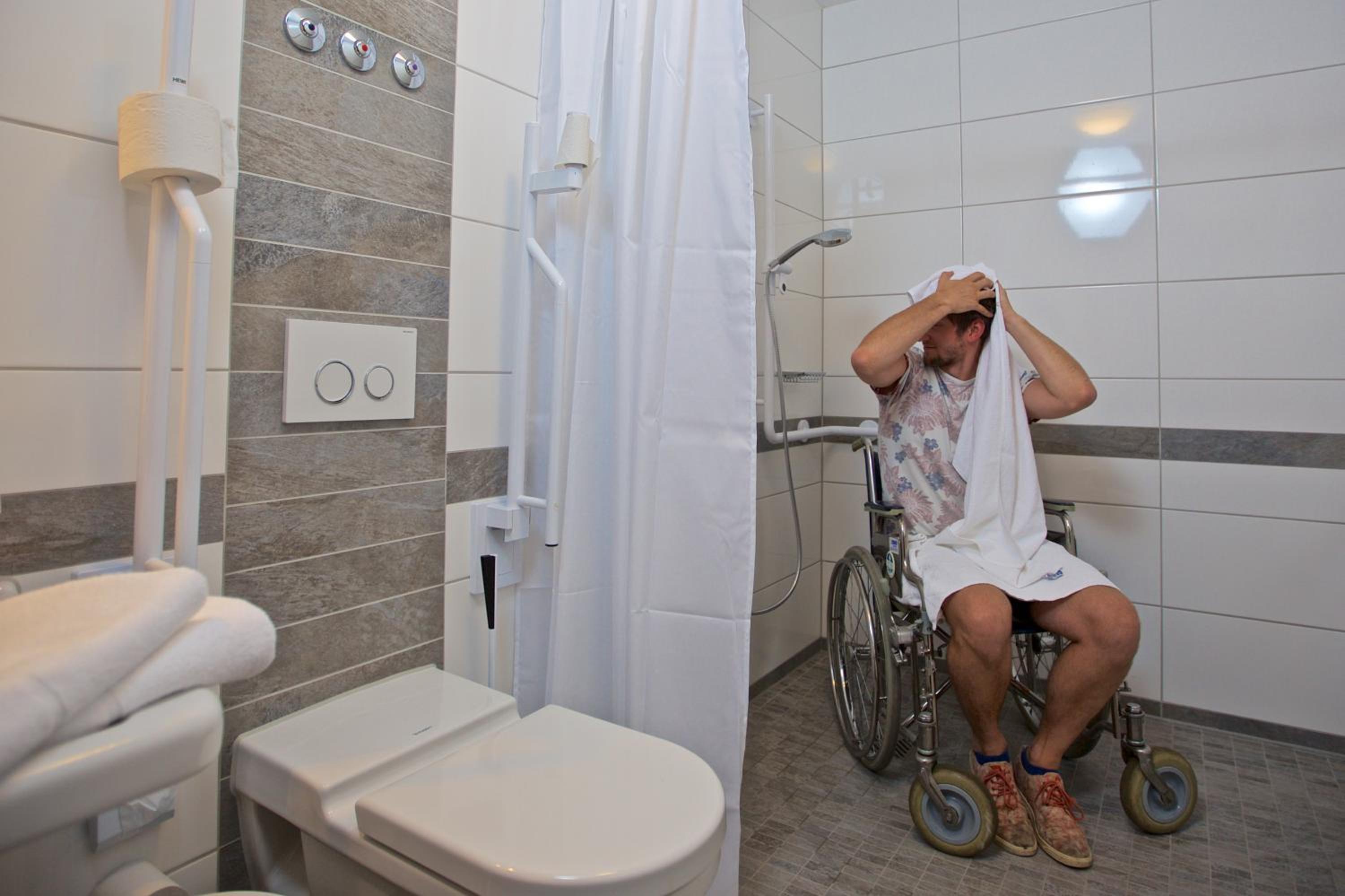 Experience comfort in our barrier-free rooms, each equipped with a flat-screen TV and a private bathroom for your relaxation.