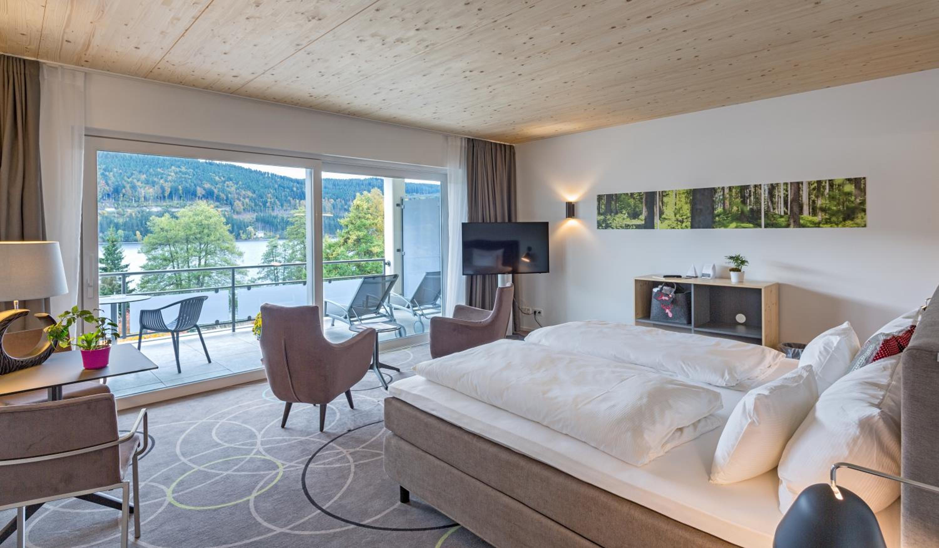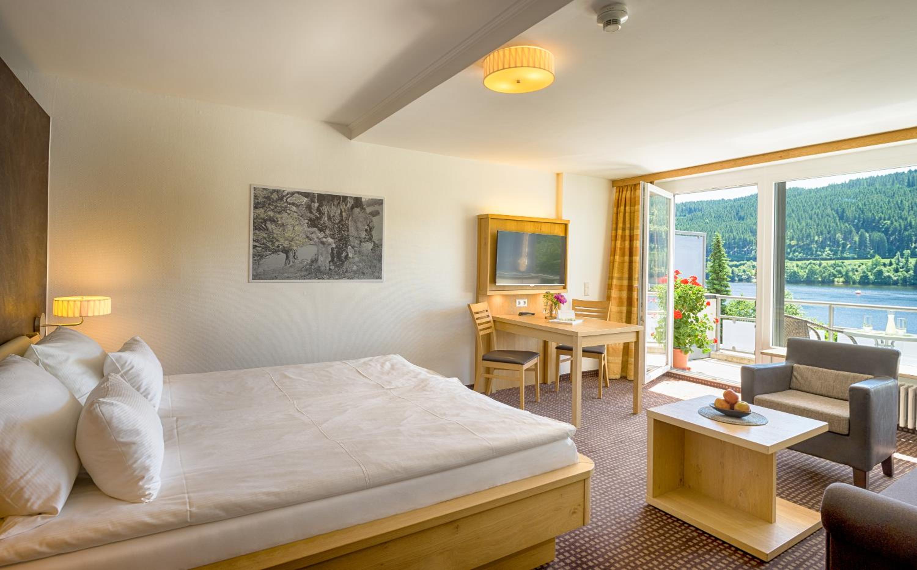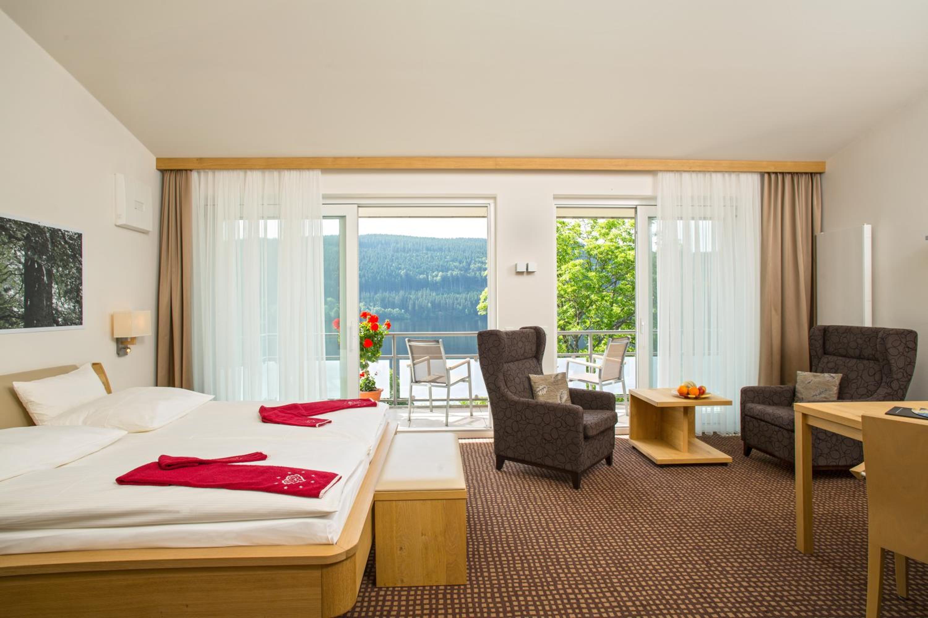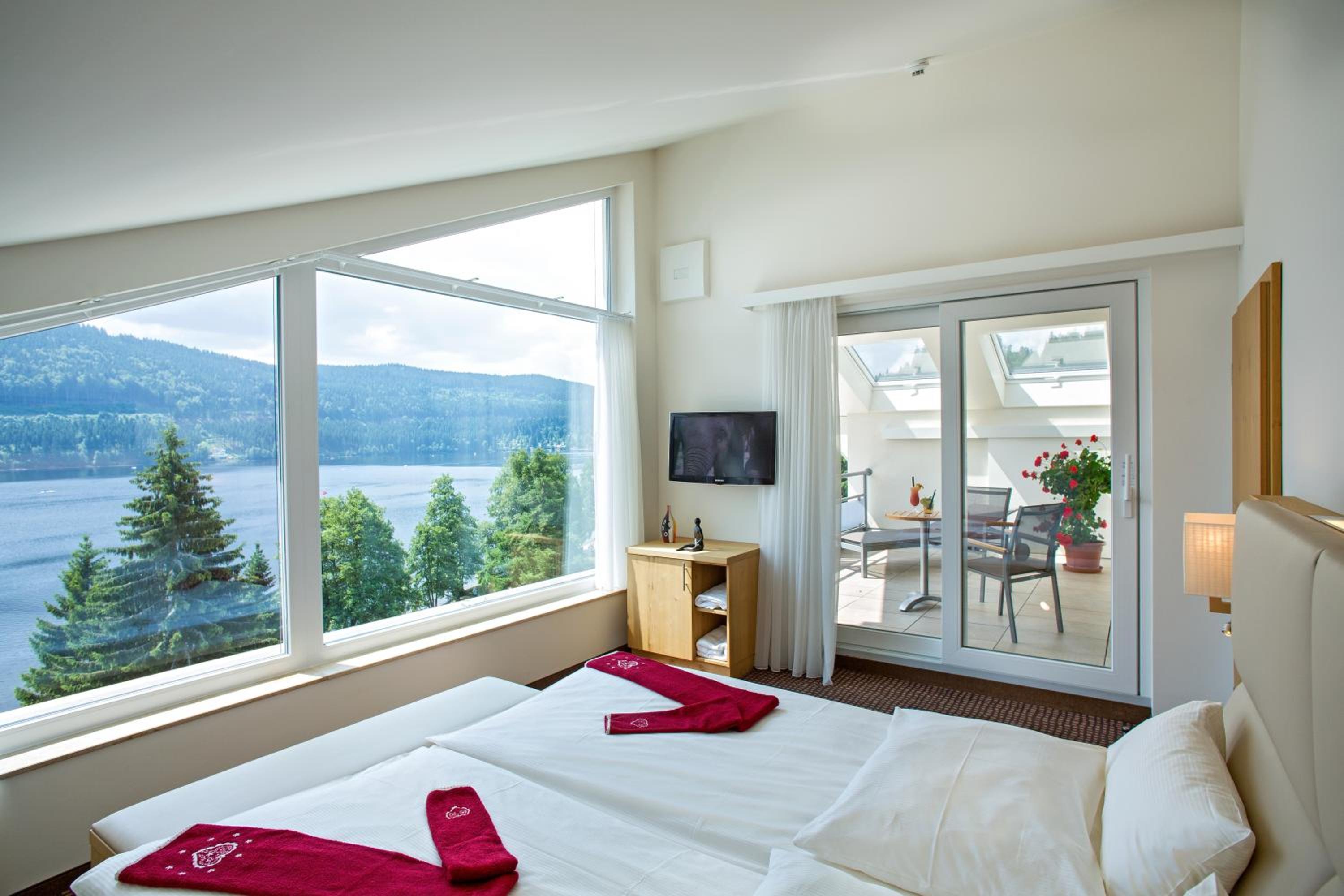 Breathtaking Views: Enjoy spacious, modern rooms with stunning views of Lake Titisee or the forest, each equipped with satellite TV and a private bathroom.