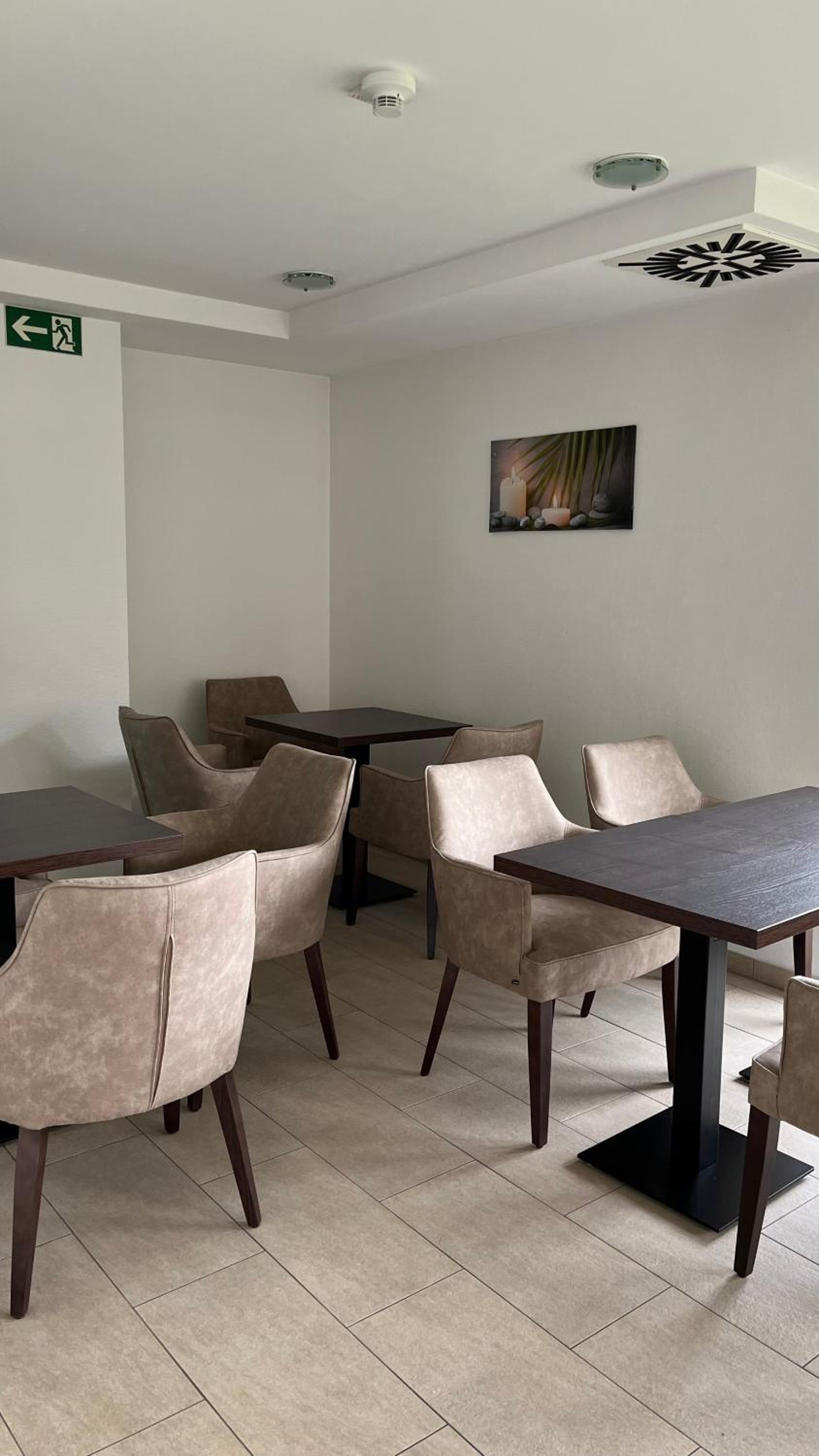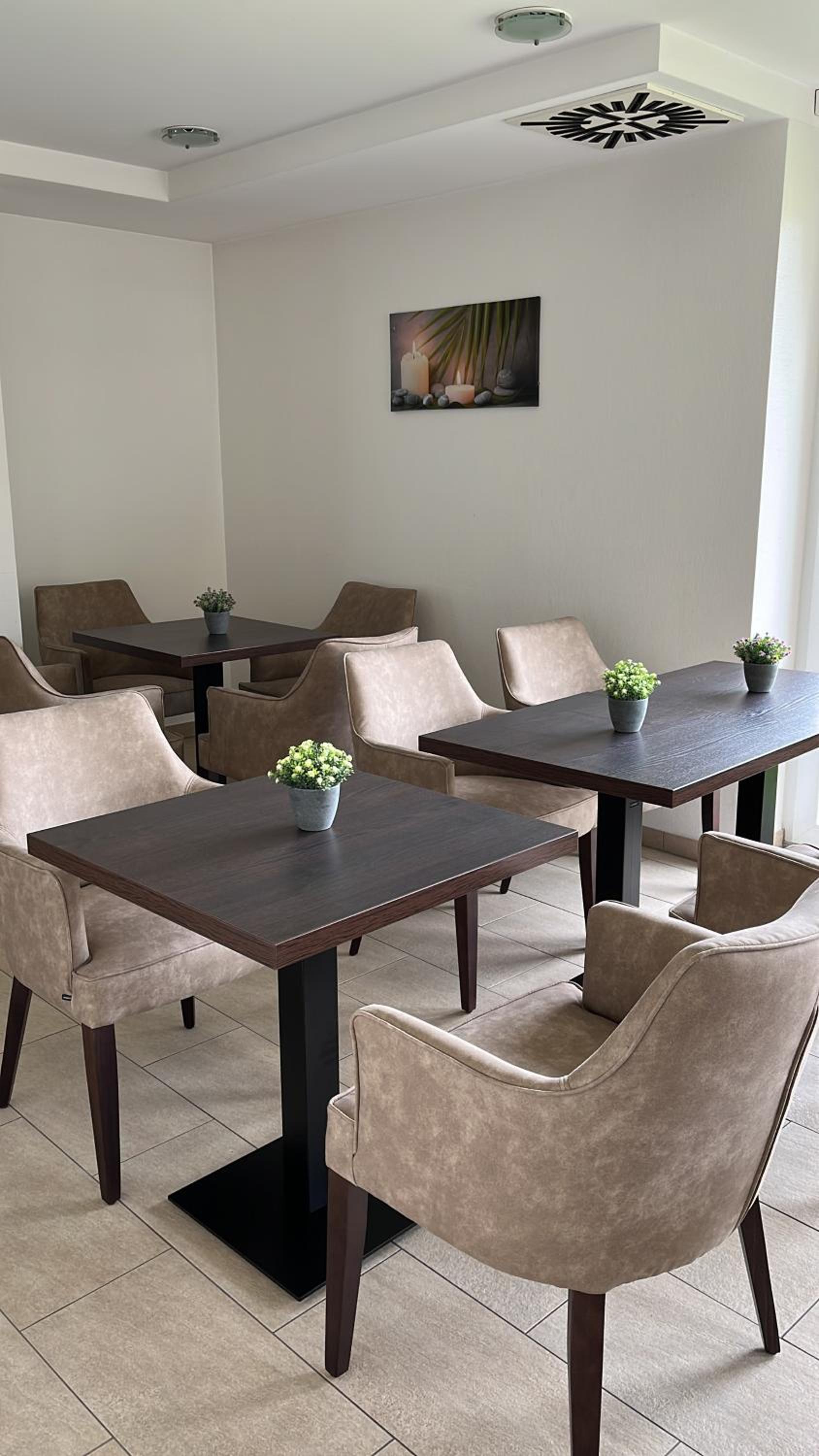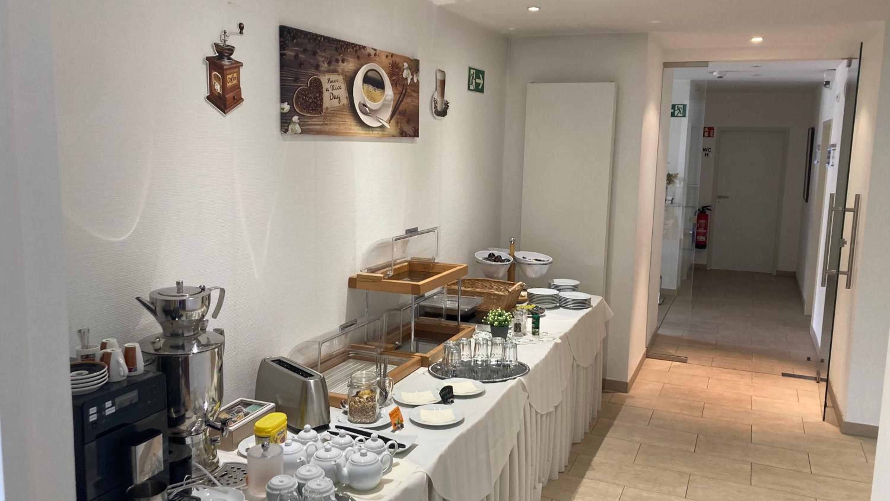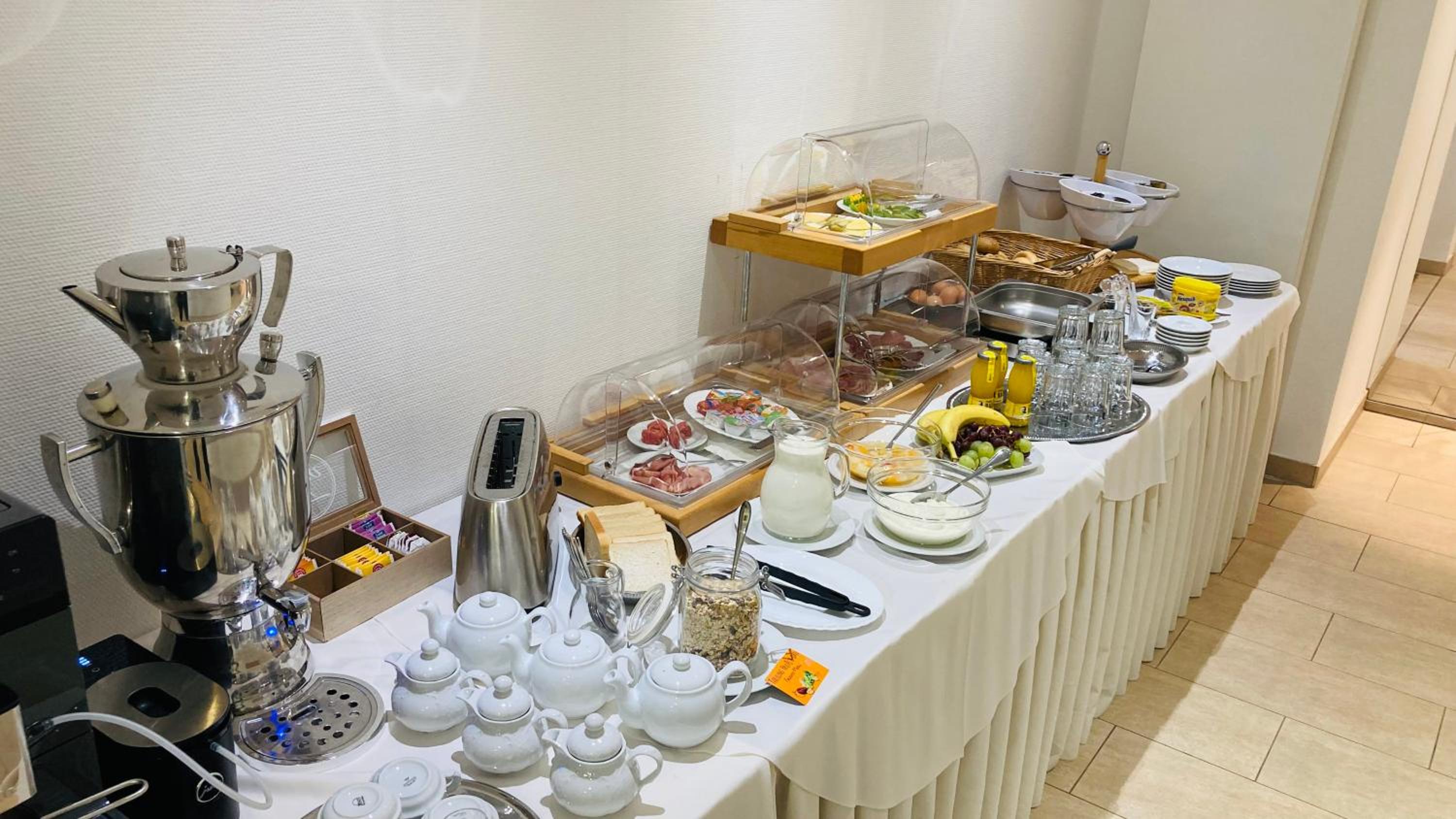 Das SB-Frühstück war sehr liebevoll vorbereitet und für uns war es eine gute Wahl. Im Aufenthaltsraum bestand die Möglichkeit sich jederzeit mit Getränken und keinen Snacks zu versorgen.