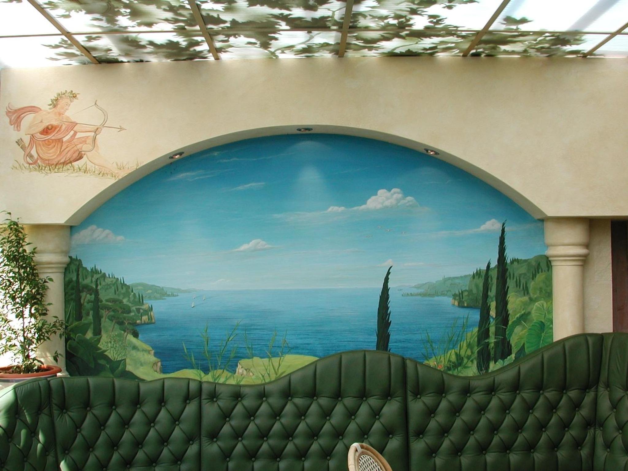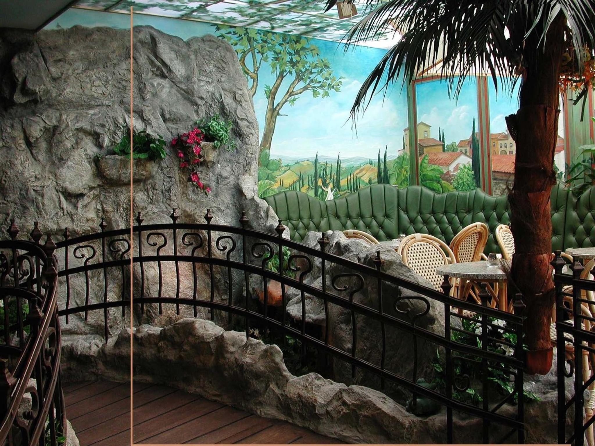 Etwas kitschige Halle mit künstlichen Bäumen