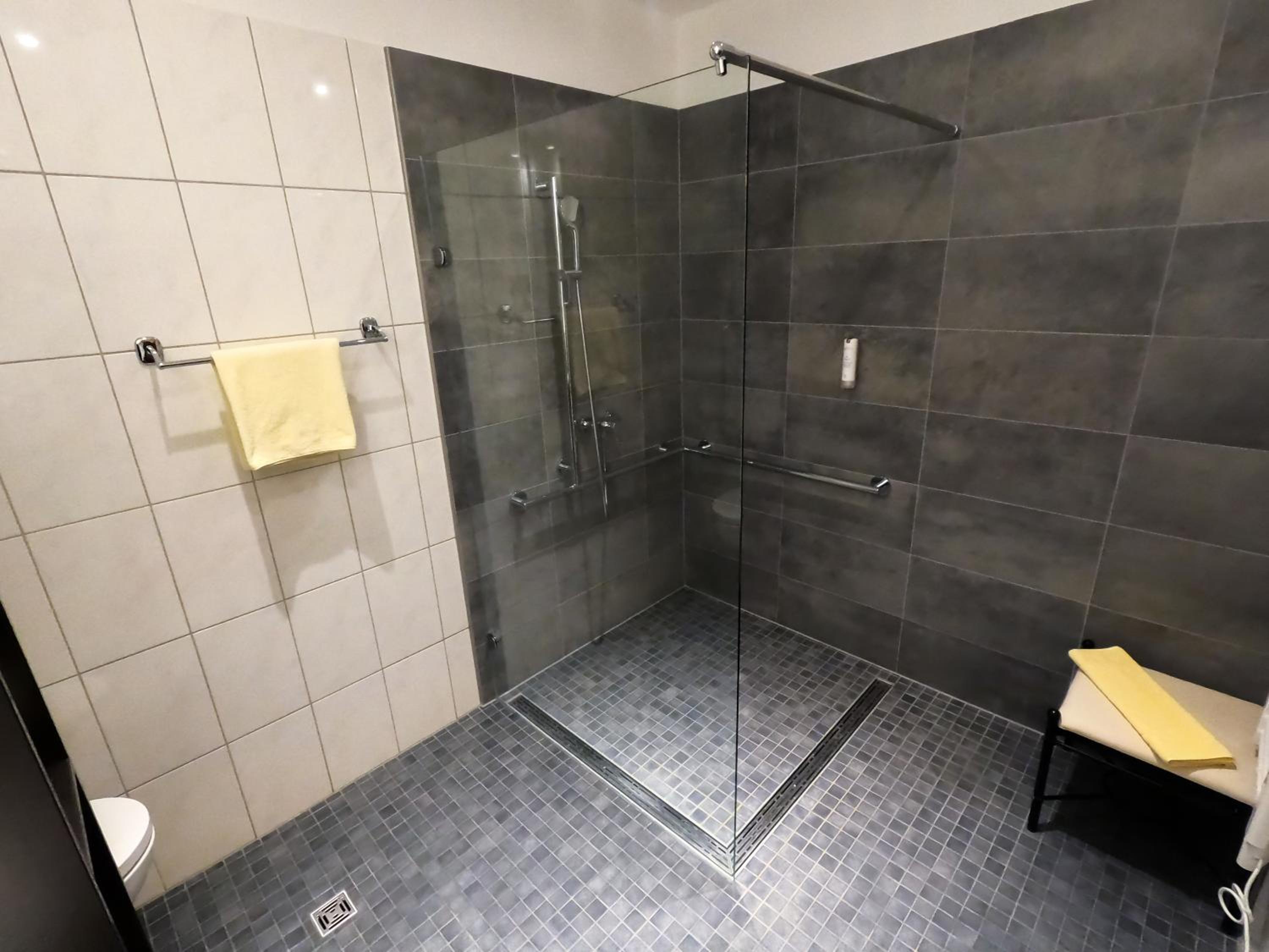 Die Glasschiebetür zum Bad schirmt die Geräusche zum Zimmer nicht ganz ab.