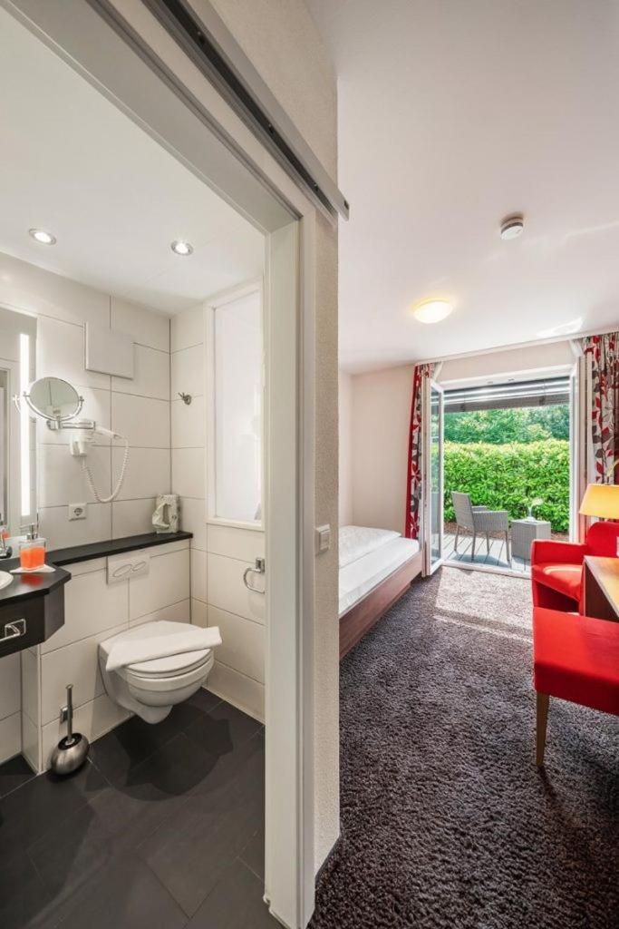Eine durchsichtige Glastür zum WC/Bad ist gegenüber der Zimmertür unangebracht