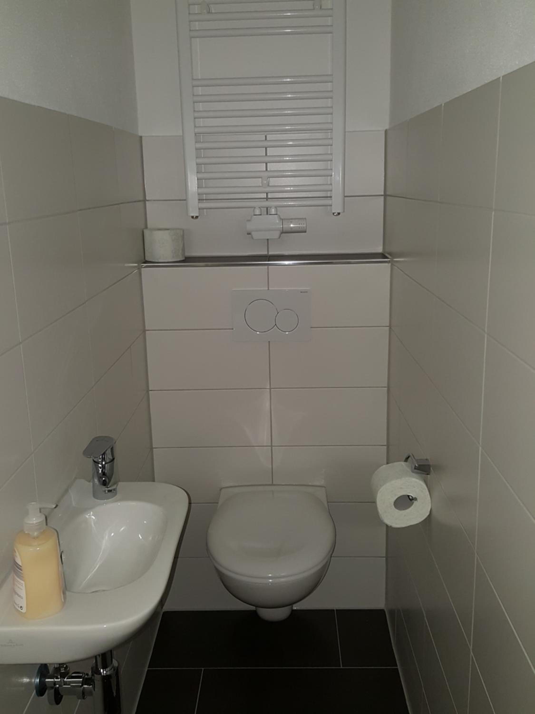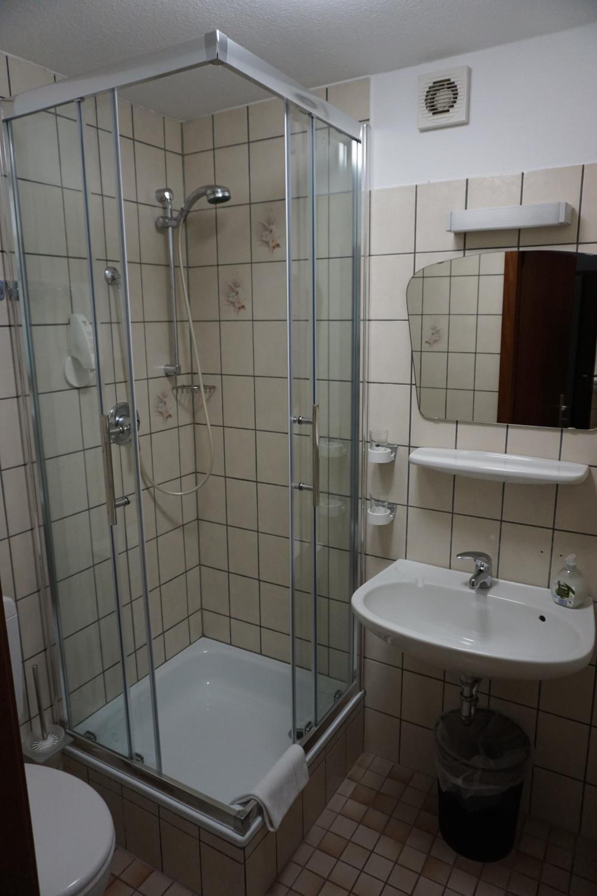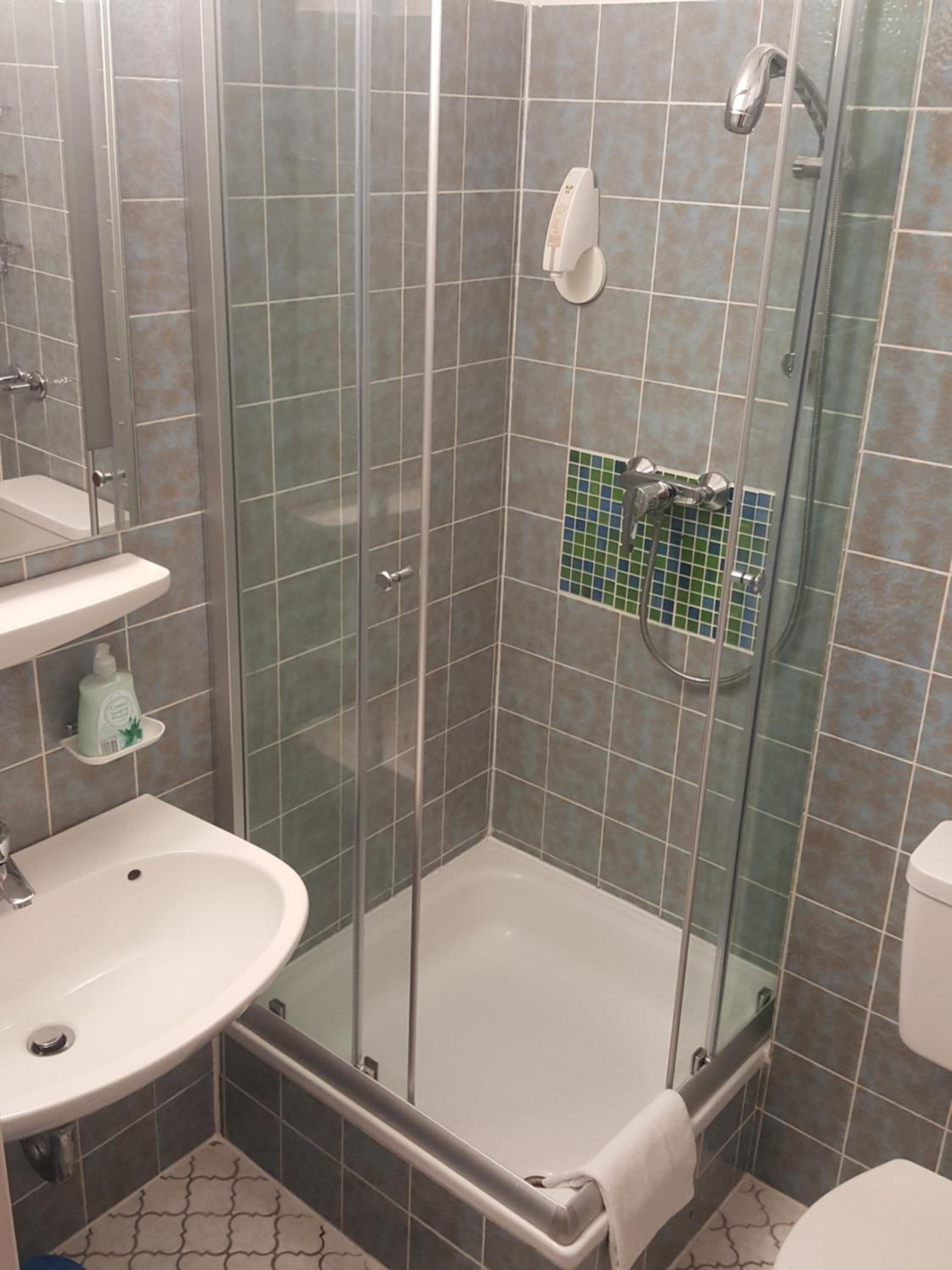 Badezimmer etwas altmodisch (alte Fließen, keine bodenlose Dusche)