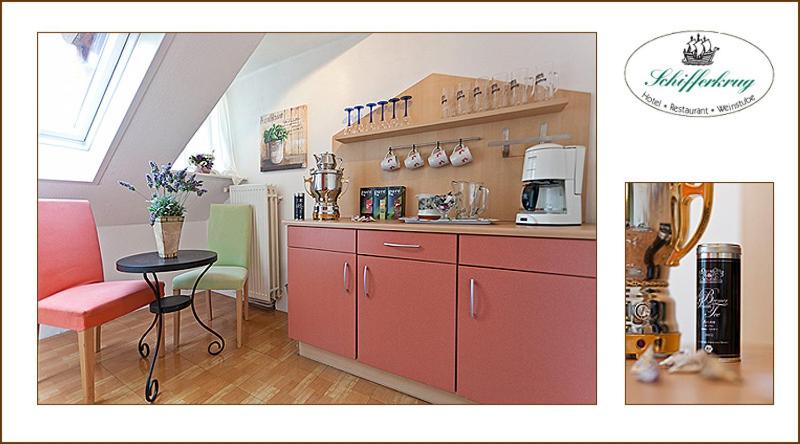 Der Schifferkrug wird mit einer Weinstube und Restaurant beworben, leider Fehlanzeige. An dem nächsten Abend mussten wir uns ein Restaurant in der Stadt suchen, sehr schade ! Wir wollten der Gemütlichkeit wegen im selben Haus essen wo wir auch untergebracht sind. Darüber muss informiert werden, dass kein Essen möglichst.