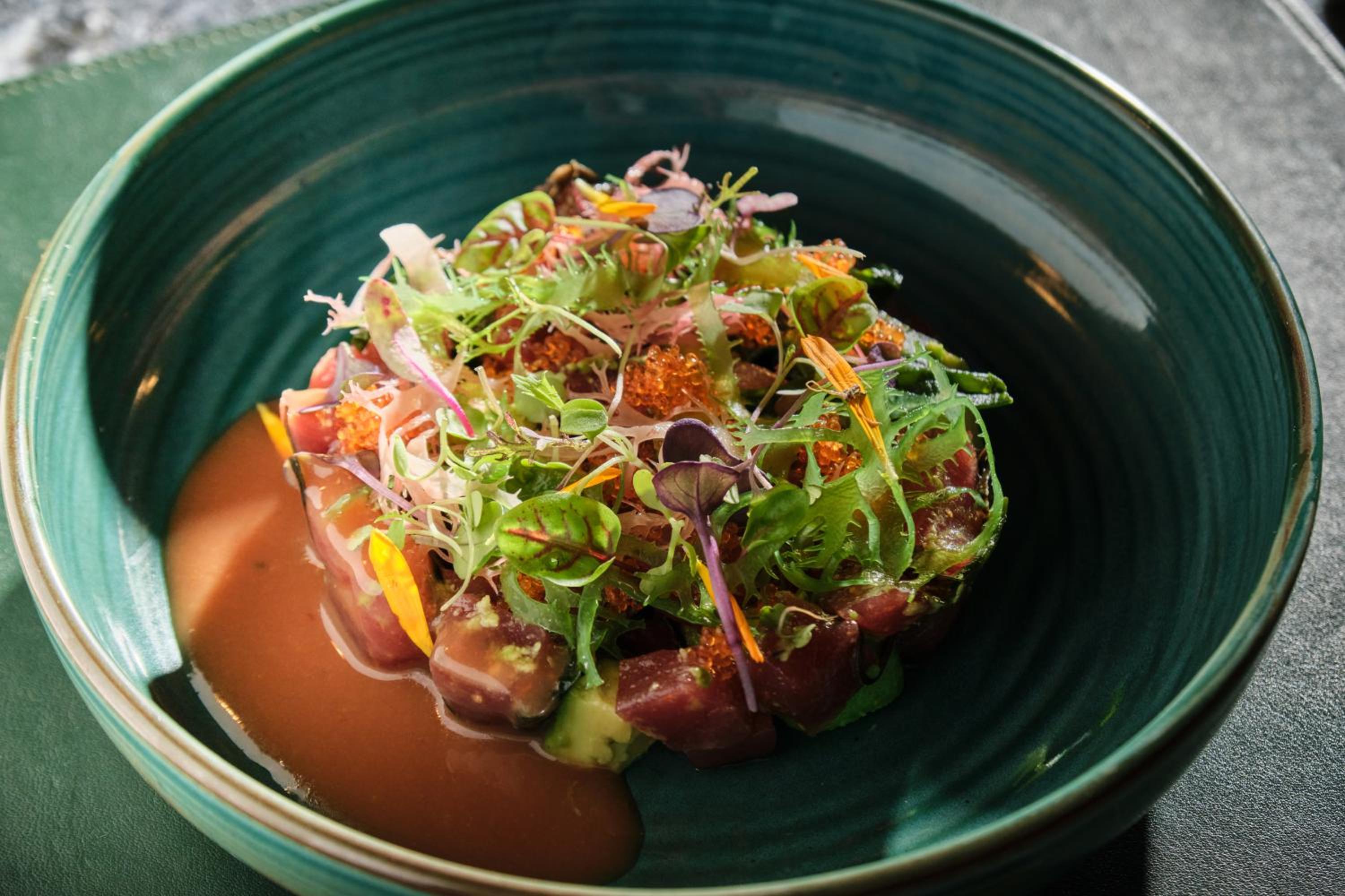 Experience a fusion of Mediterranean, Japanese, and Peruvian cuisine at De Tokio a Lima Valldemossa with breathtaking mountain views.