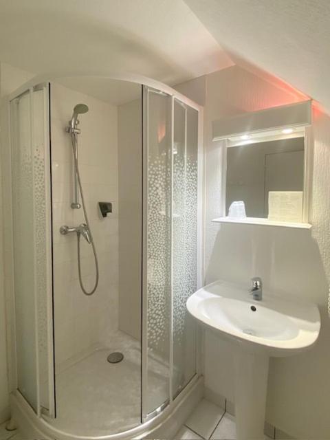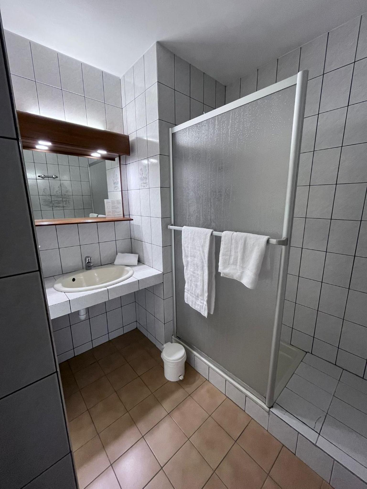 Chambre ordinaire. Douche peu spacieuse.