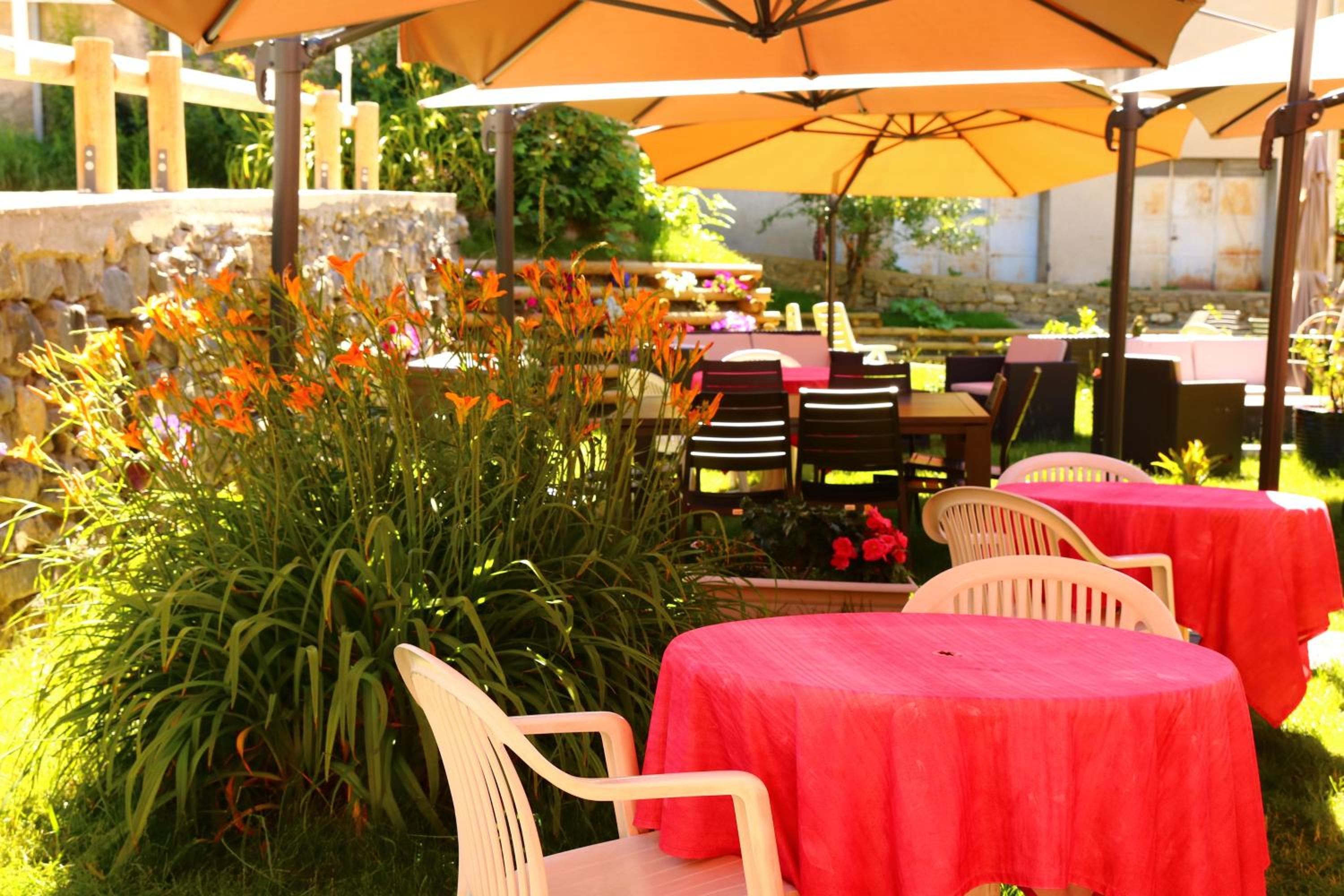 Garage pour la moto, et super bar extérieur. Bonne ambiance à l'apéro. PDJ correct.