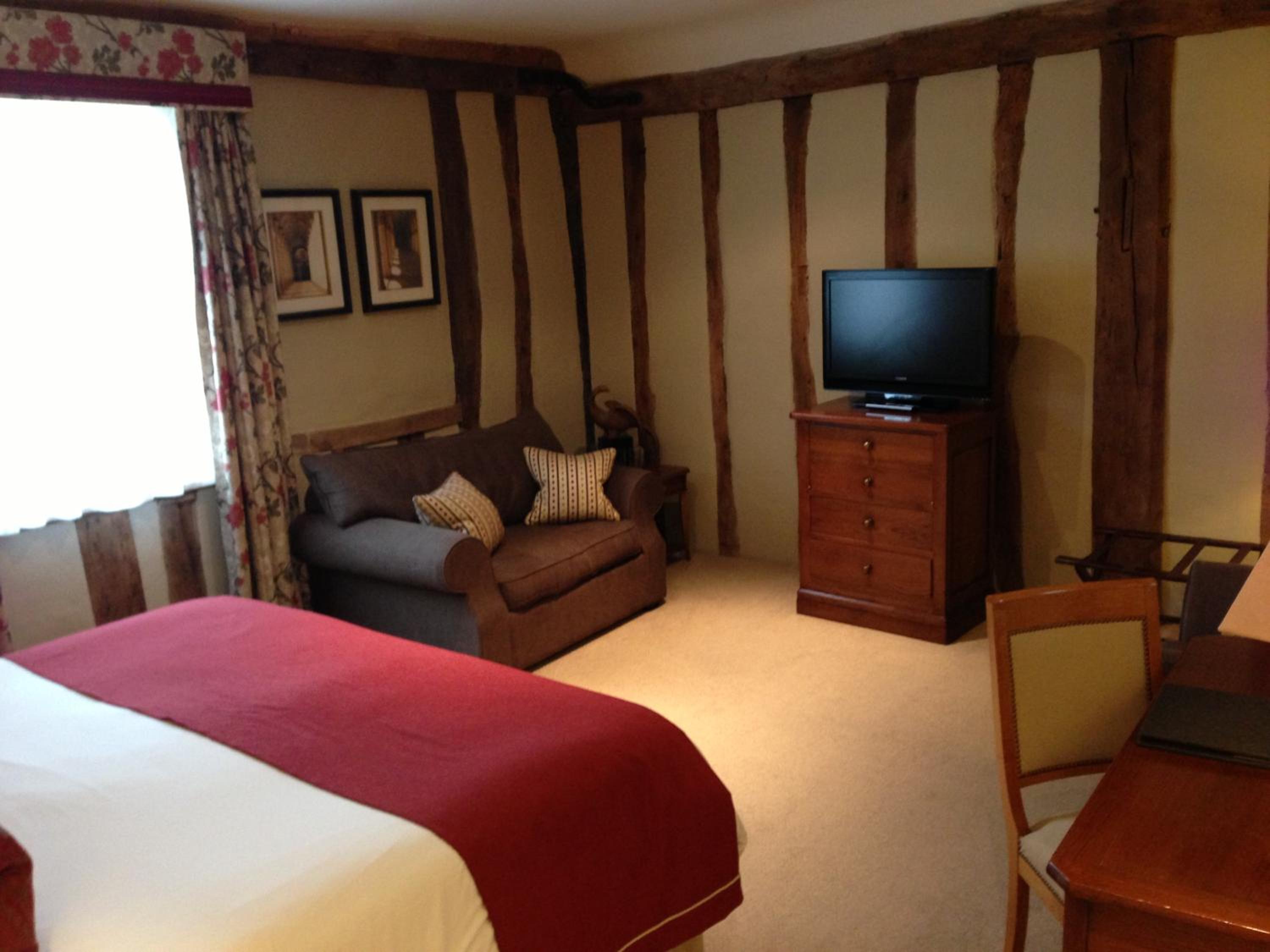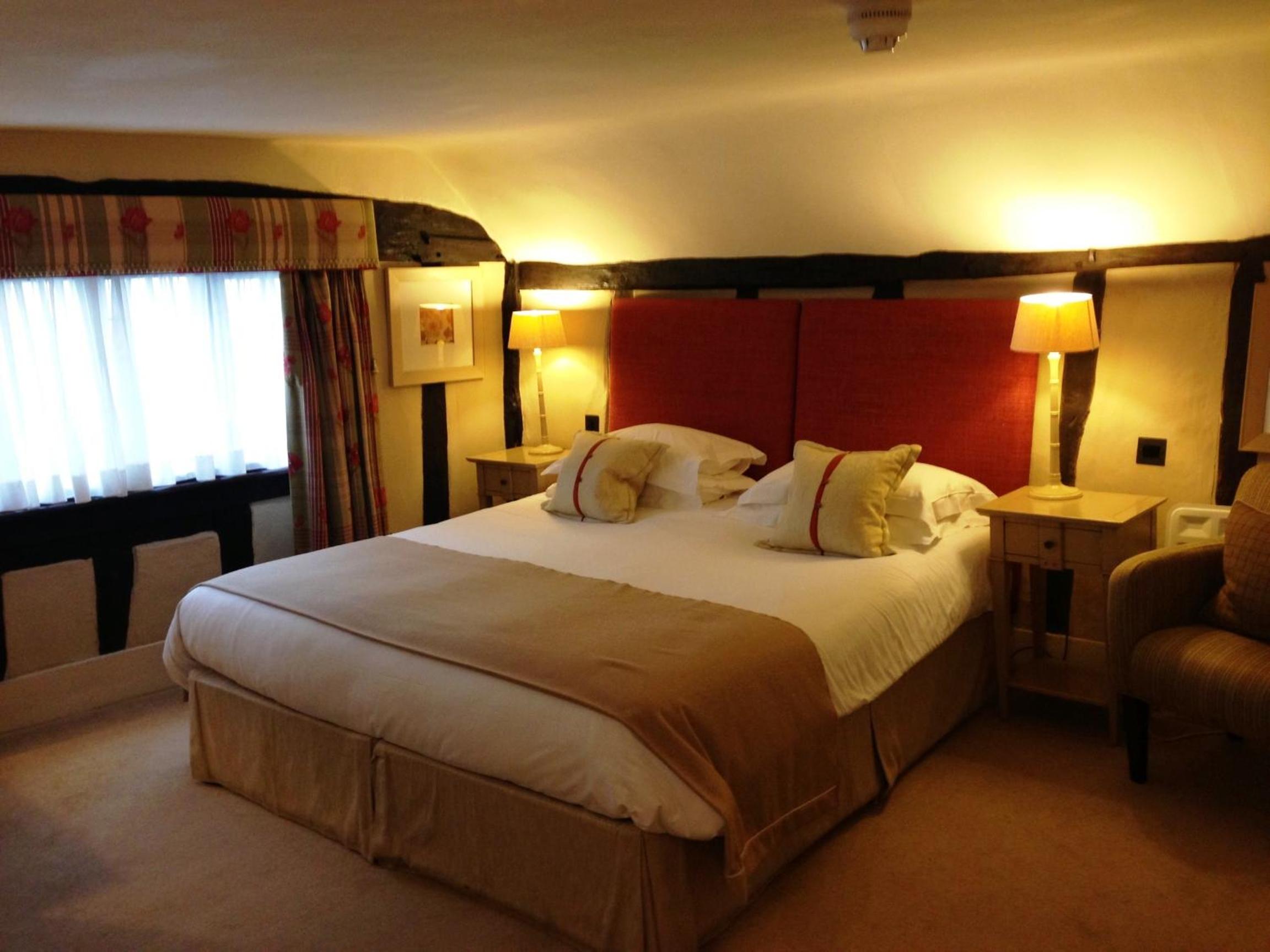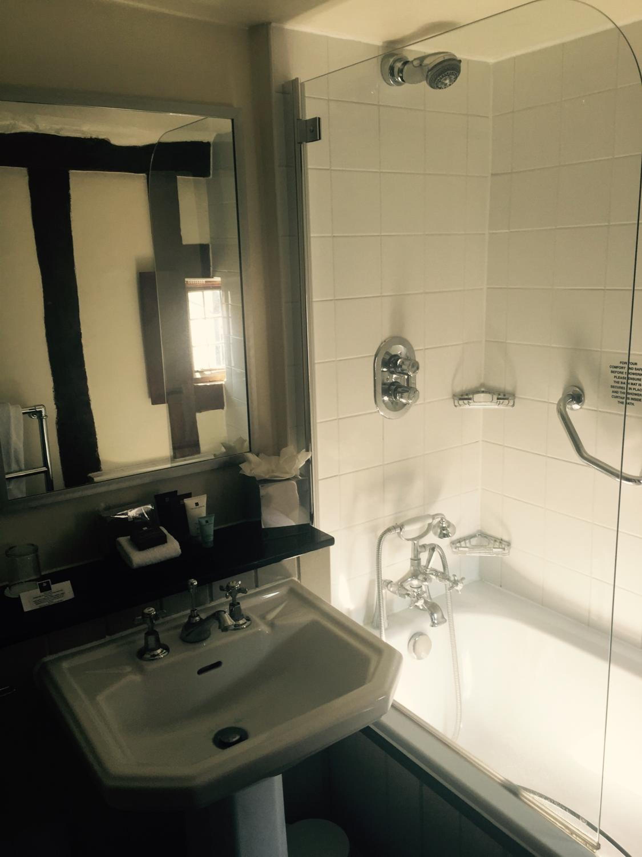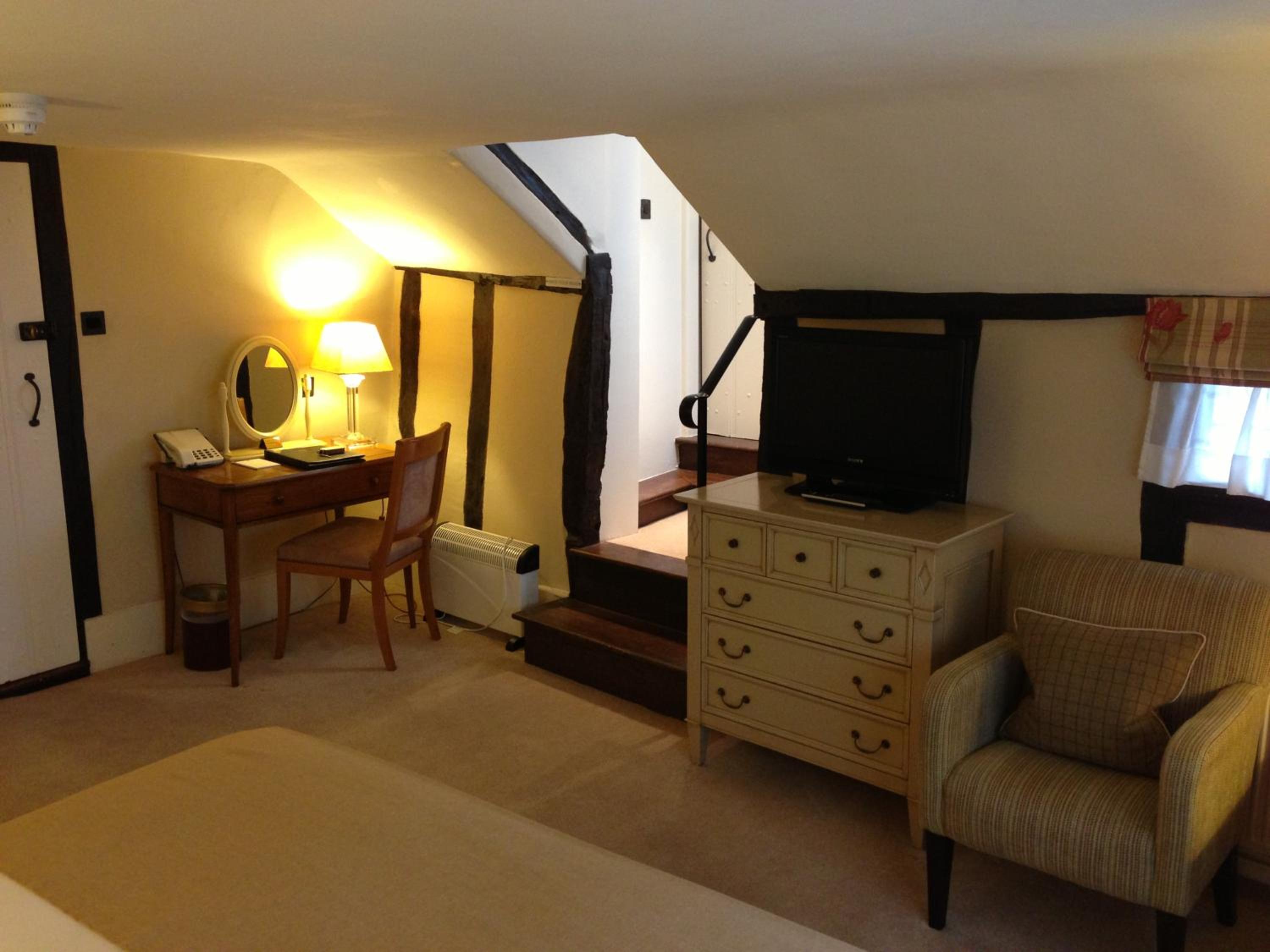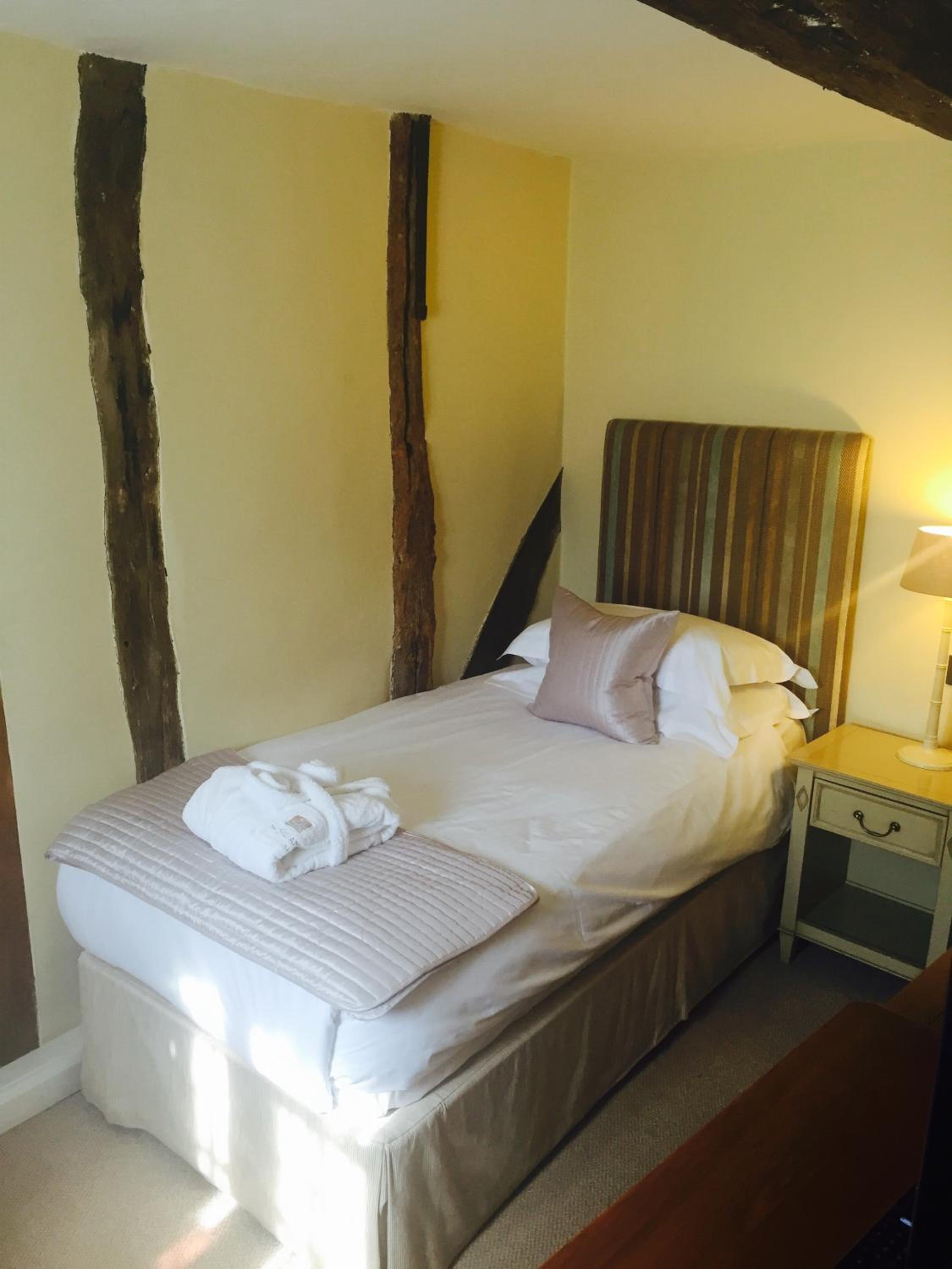 Wonderful building to explore in the heart of Lavenham. Free parking and spa on site (which we didn't use). Excellent evening meal in the amazing beamed restaurant, with very attentive staff and lovely background piano music. Breakfast also held there with a good range of food and hot options cooked to order. Our room was very clean and quiet with a smart bathroom and all the toiletries you need. Love the handmade ceramic mugs, tray and tea/coffee containers.