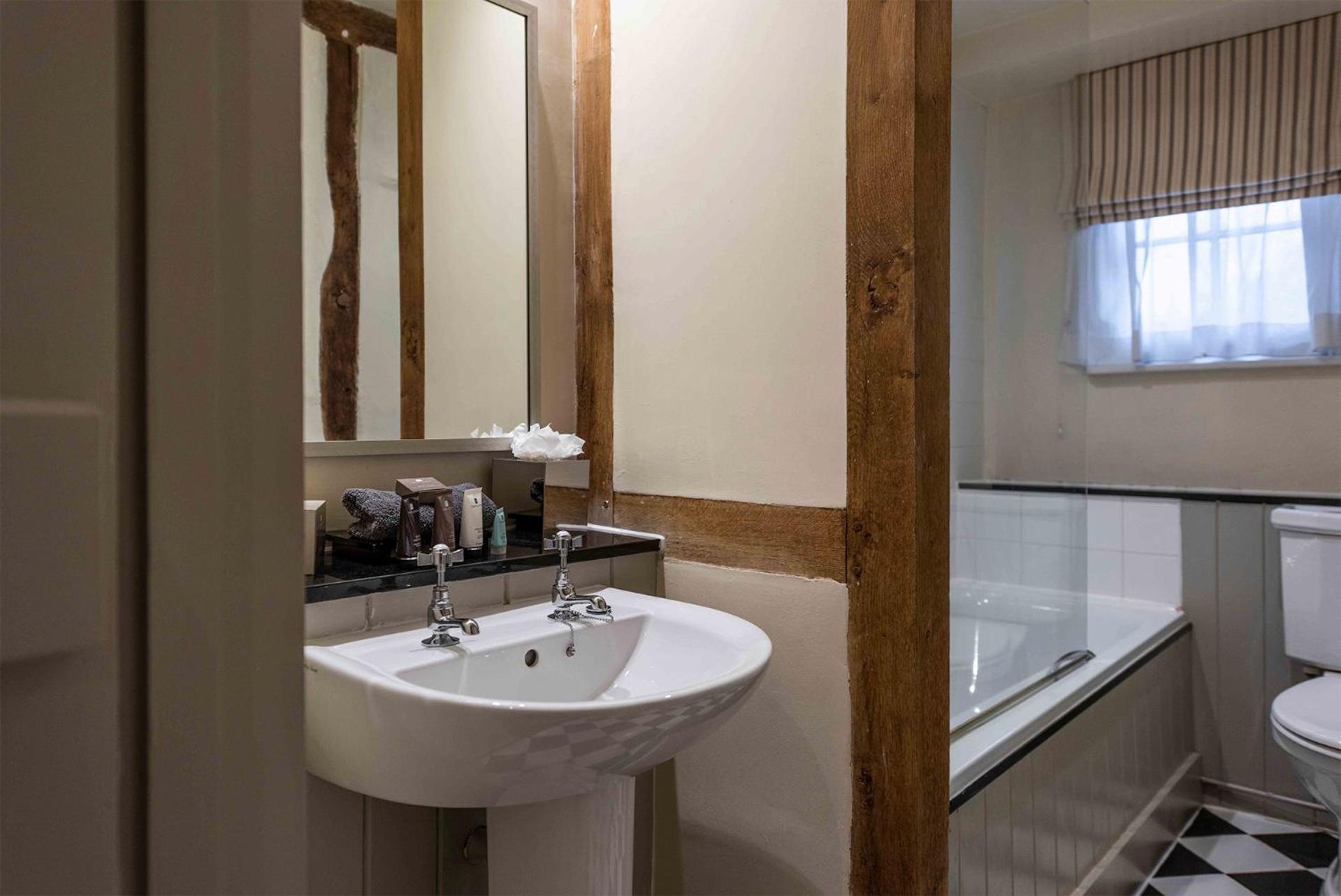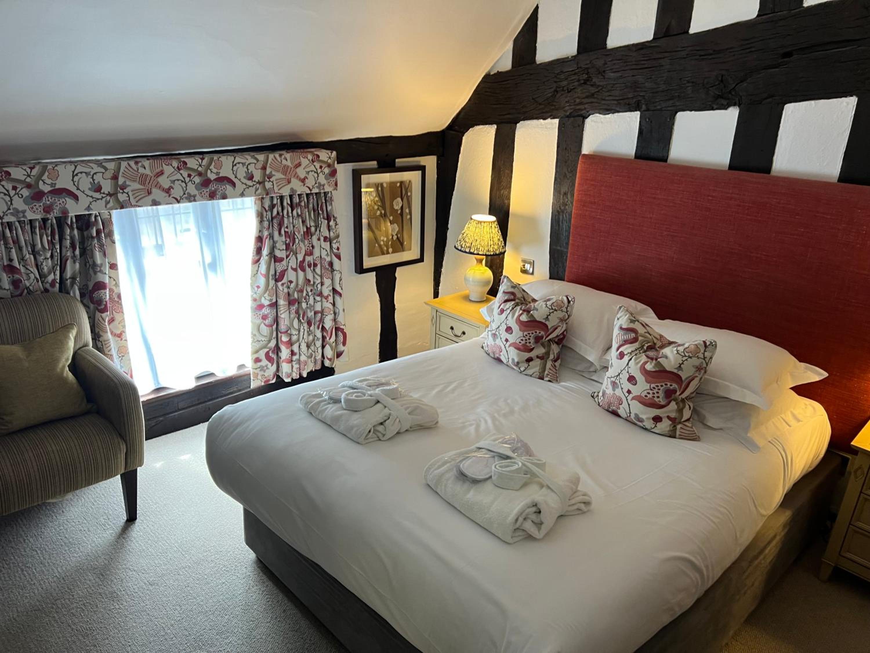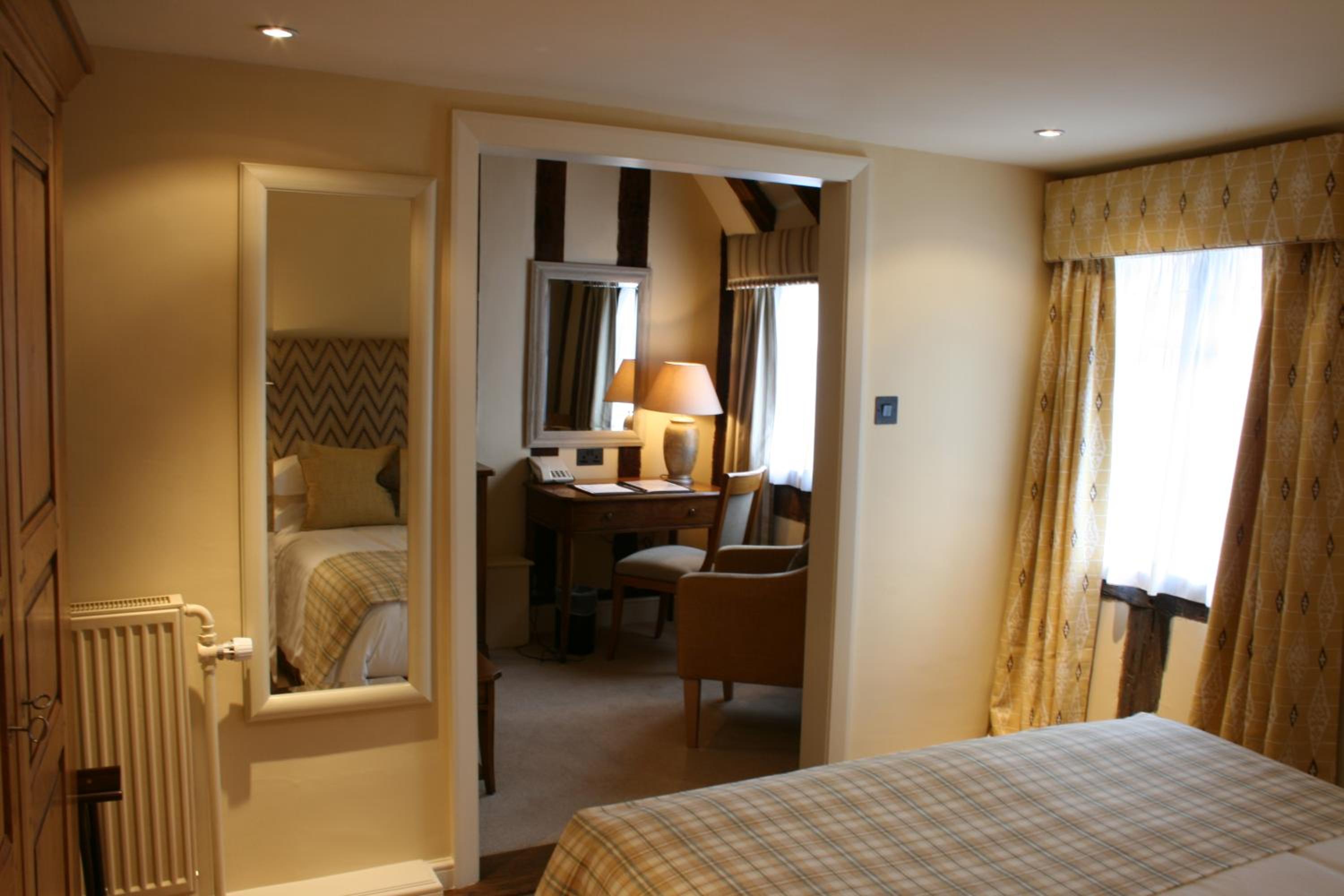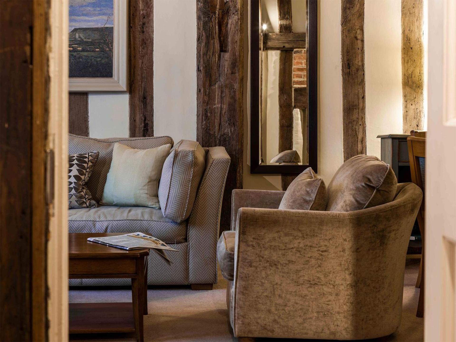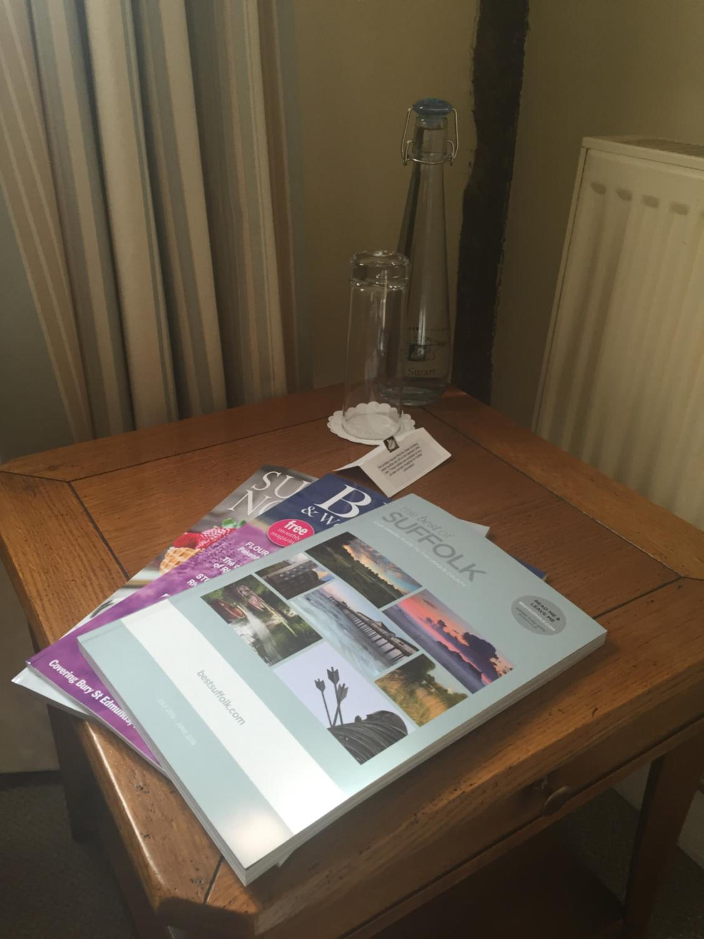 Wonderful building to explore in the heart of Lavenham. Free parking and spa on site (which we didn't use). Excellent evening meal in the amazing beamed restaurant, with very attentive staff and lovely background piano music. Breakfast also held there with a good range of food and hot options cooked to order. Our room was very clean and quiet with a smart bathroom and all the toiletries you need. Love the handmade ceramic mugs, tray and tea/coffee containers.