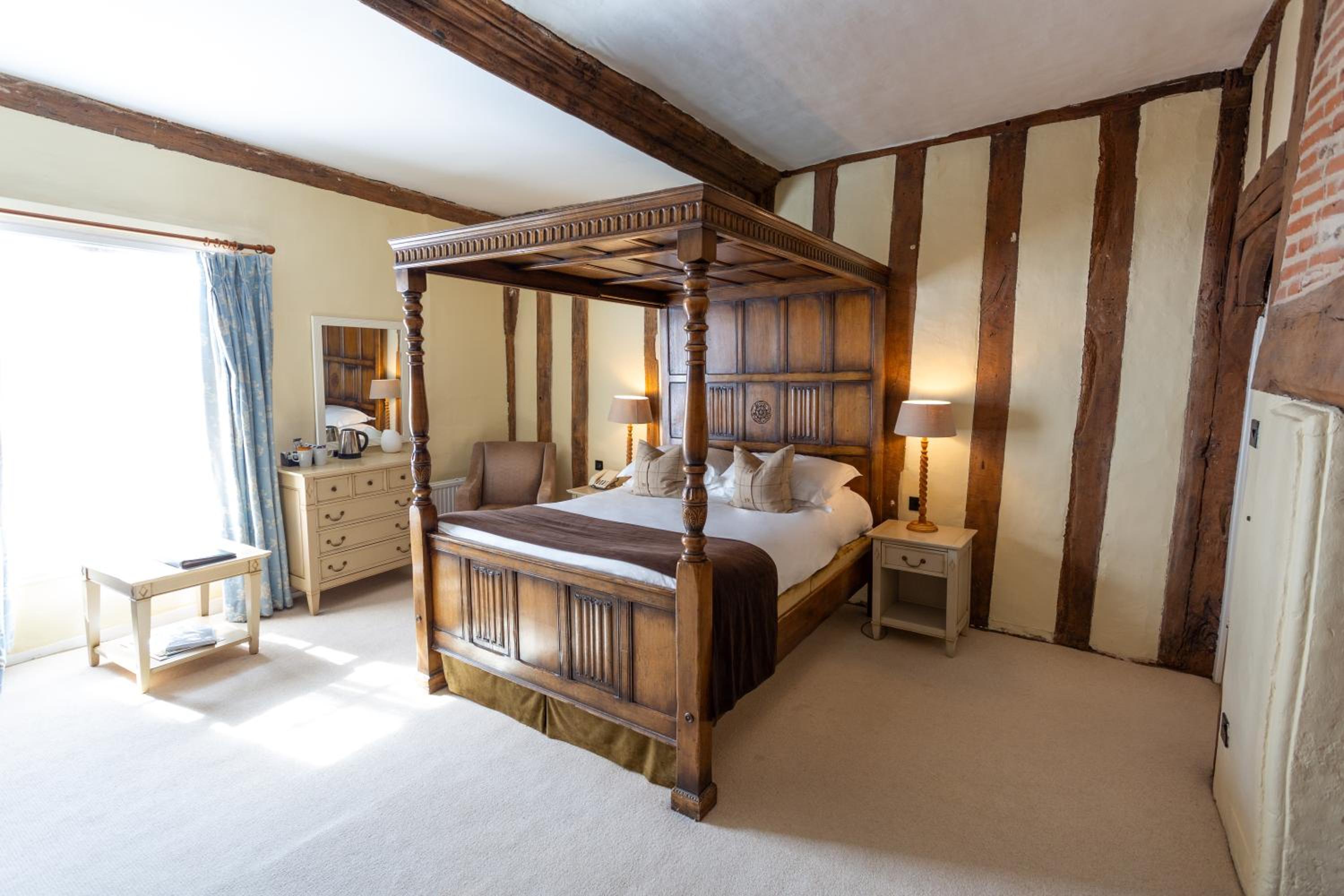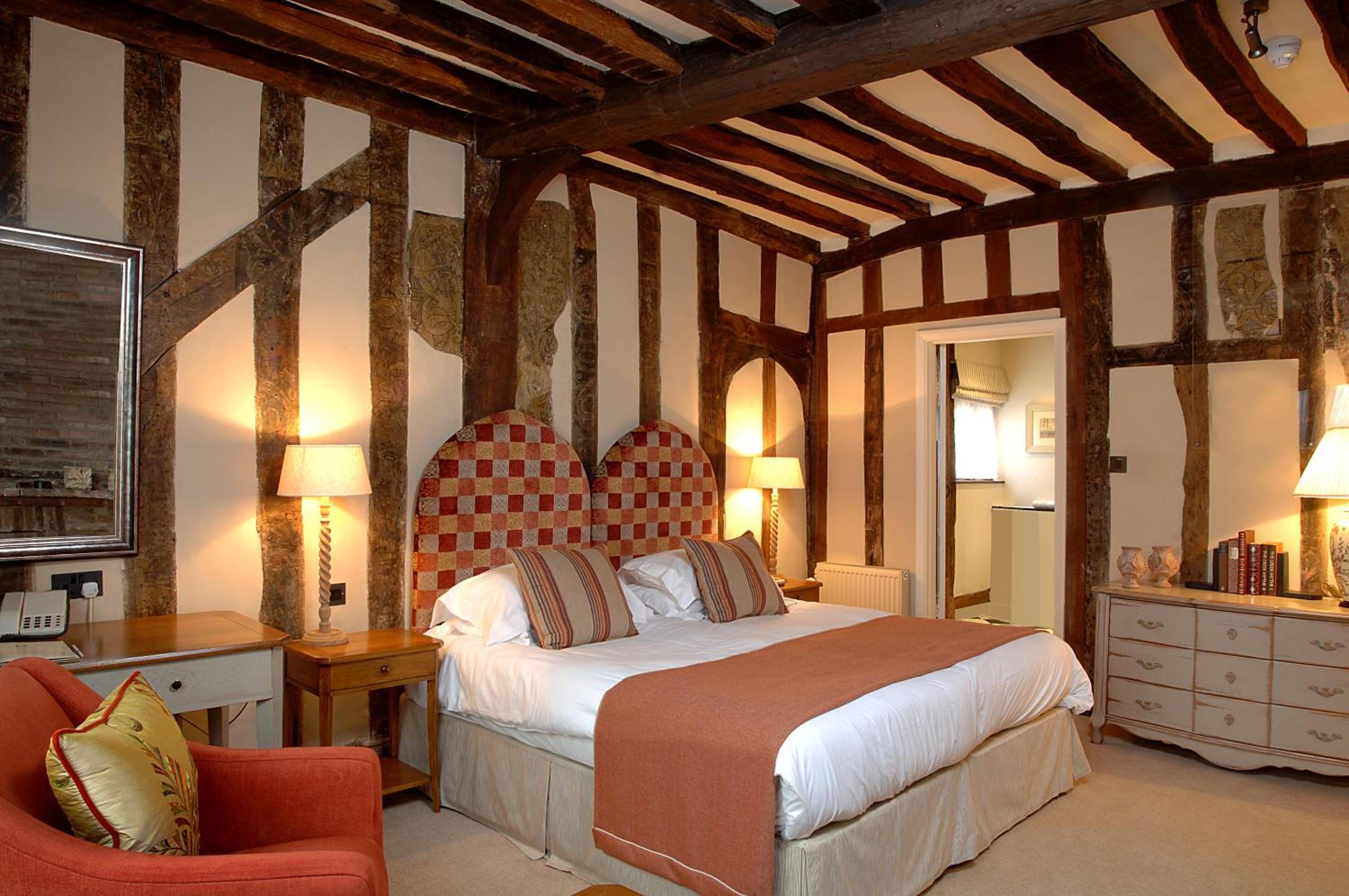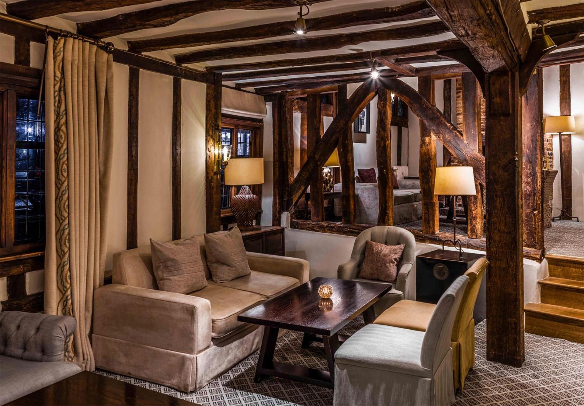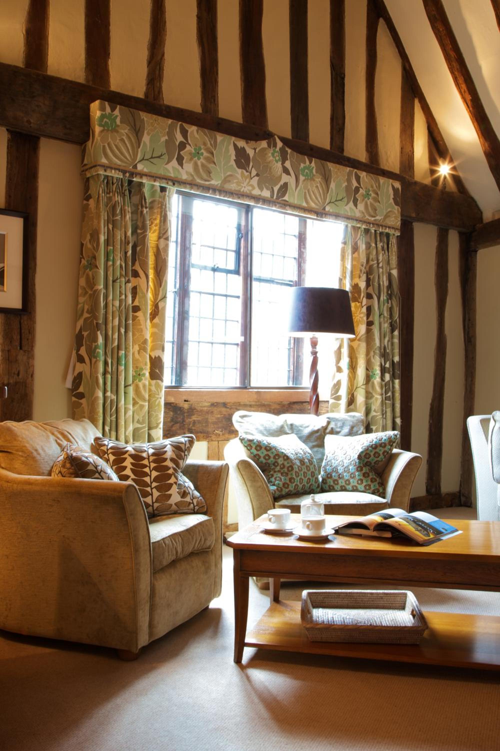 Wonderful building to explore in the heart of Lavenham. Free parking and spa on site (which we didn't use). Excellent evening meal in the amazing beamed restaurant, with very attentive staff and lovely background piano music. Breakfast also held there with a good range of food and hot options cooked to order. Our room was very clean and quiet with a smart bathroom and all the toiletries you need. Love the handmade ceramic mugs, tray and tea/coffee containers.