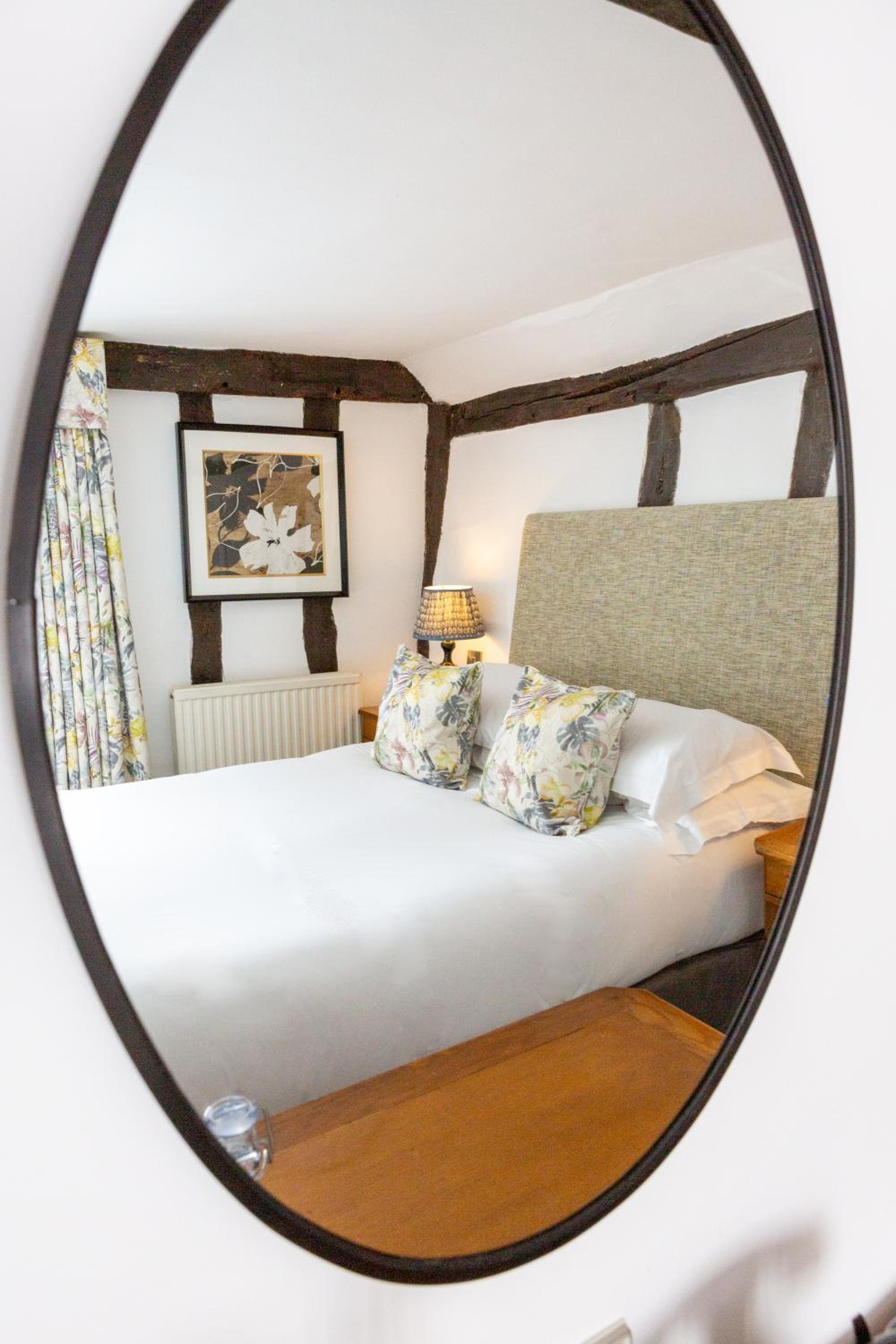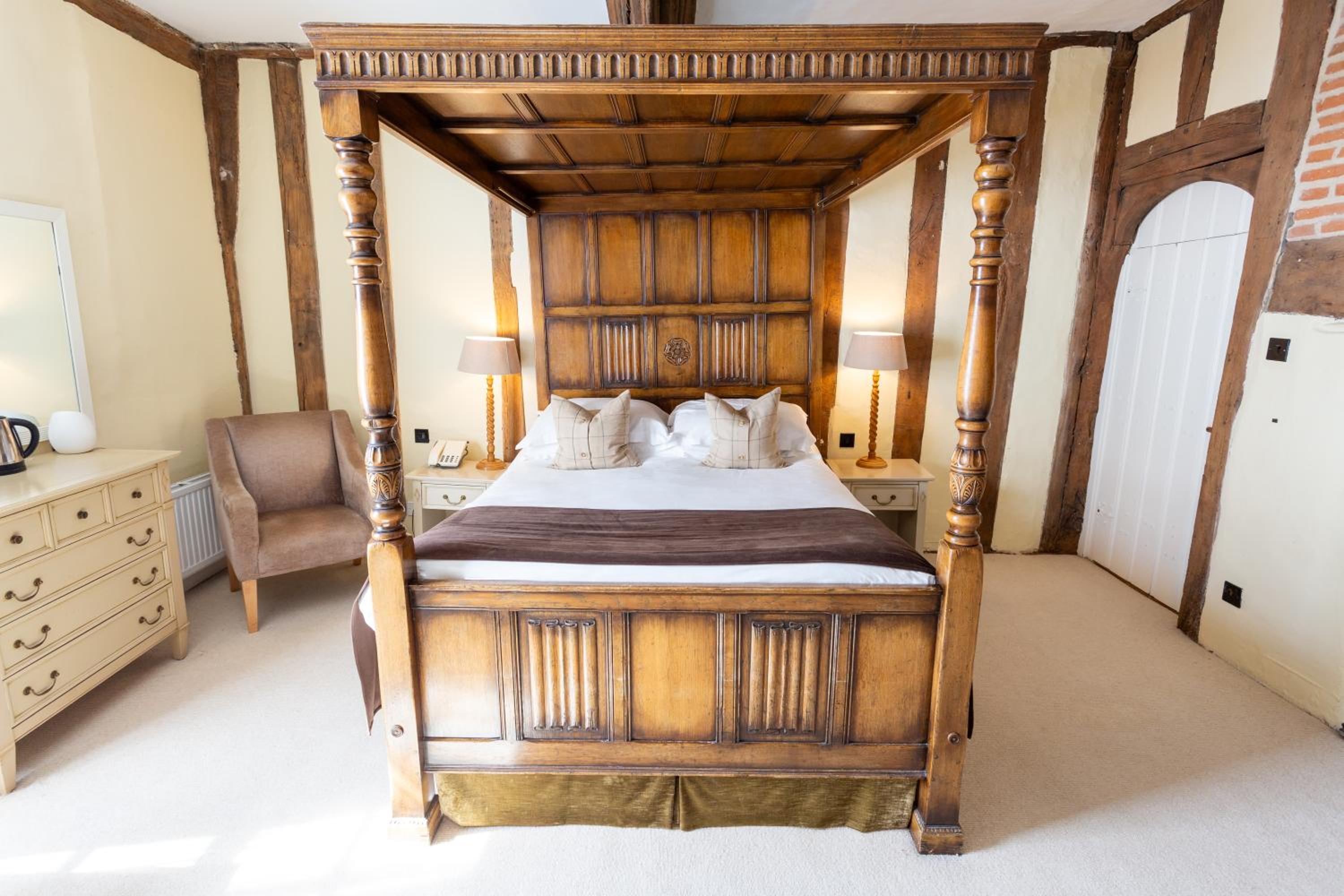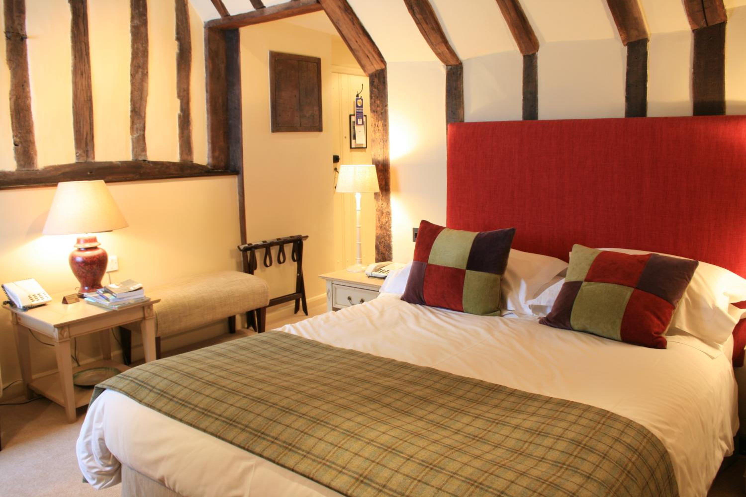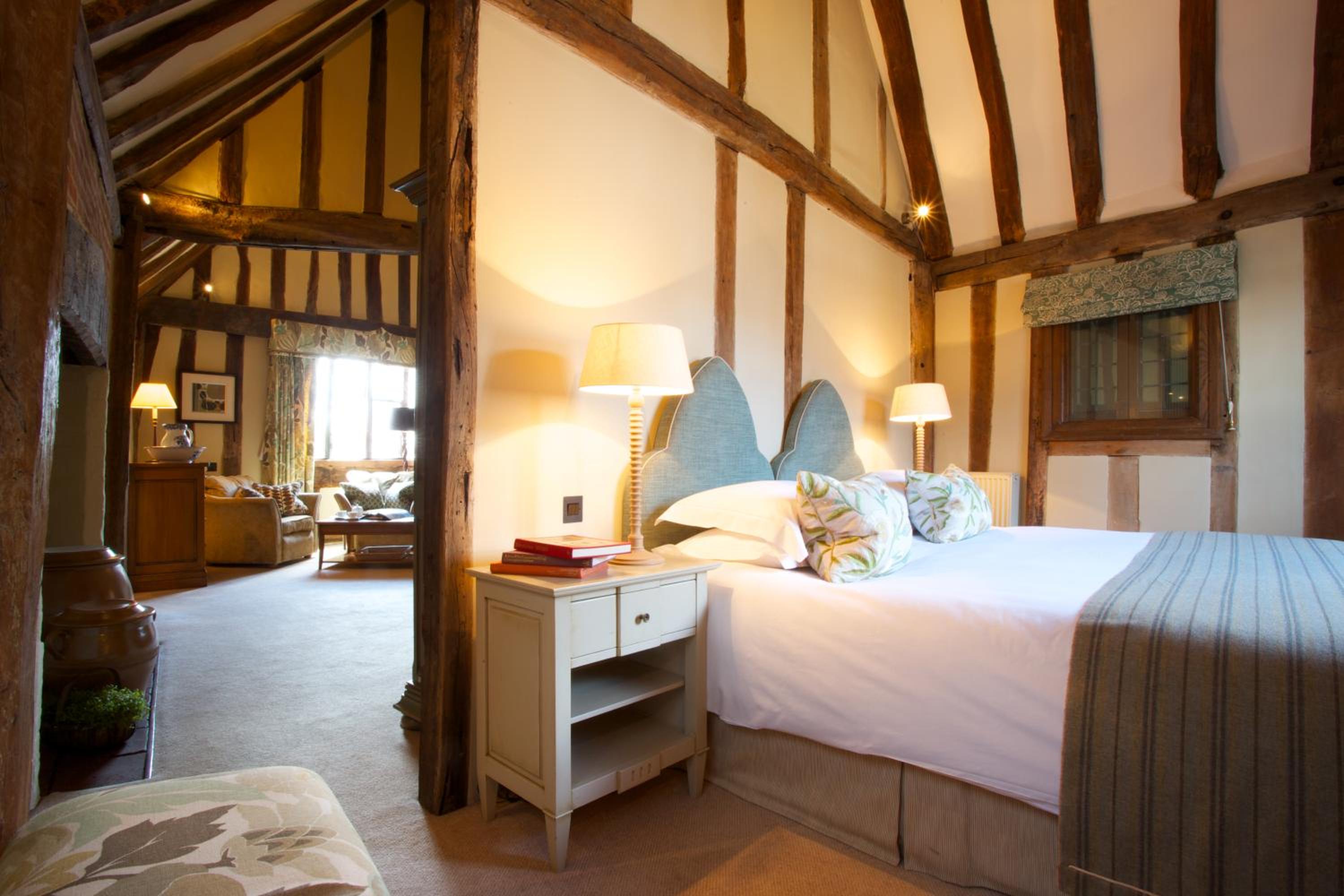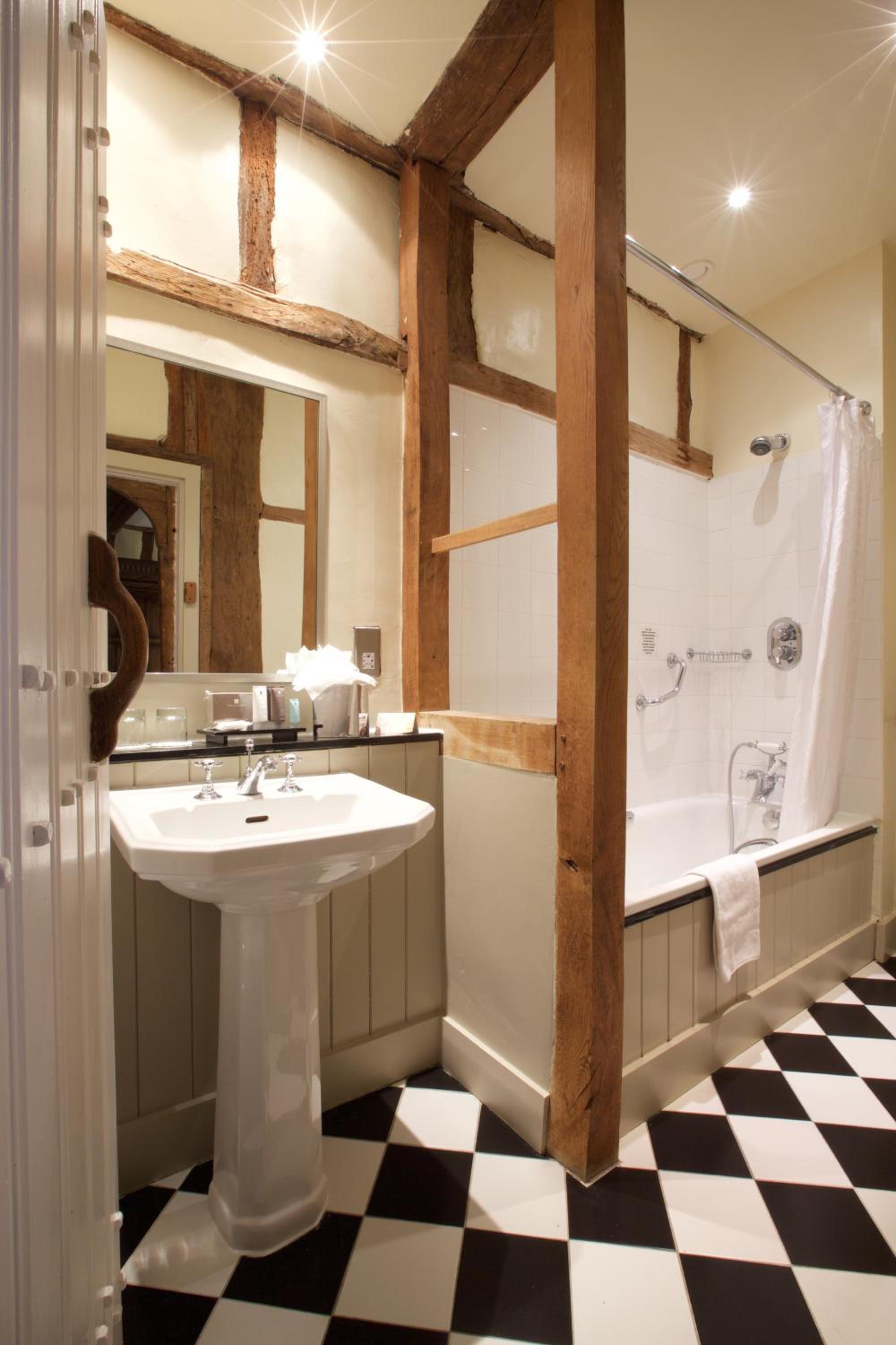 Wonderful building to explore in the heart of Lavenham. Free parking and spa on site (which we didn't use). Excellent evening meal in the amazing beamed restaurant, with very attentive staff and lovely background piano music. Breakfast also held there with a good range of food and hot options cooked to order. Our room was very clean and quiet with a smart bathroom and all the toiletries you need. Love the handmade ceramic mugs, tray and tea/coffee containers.