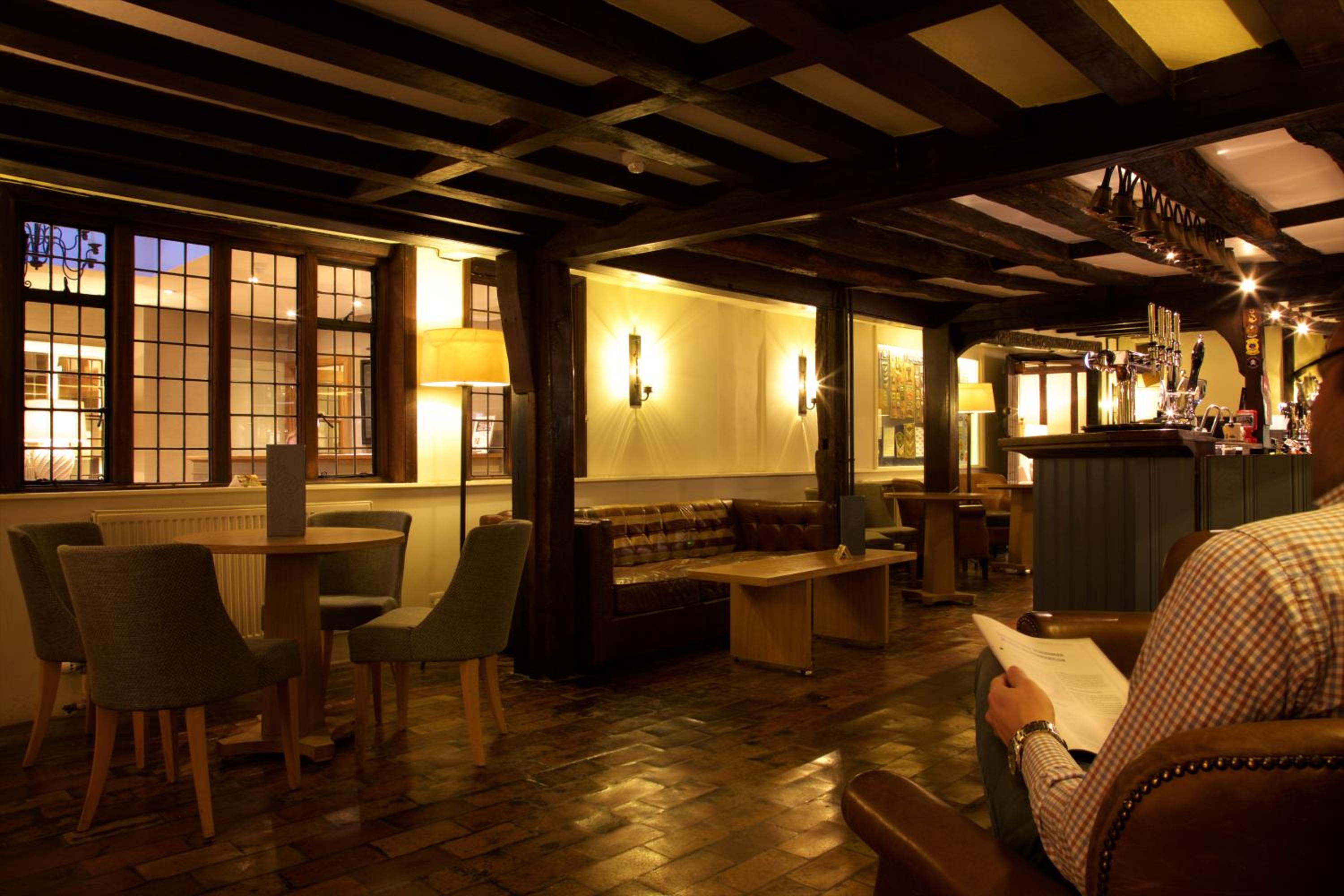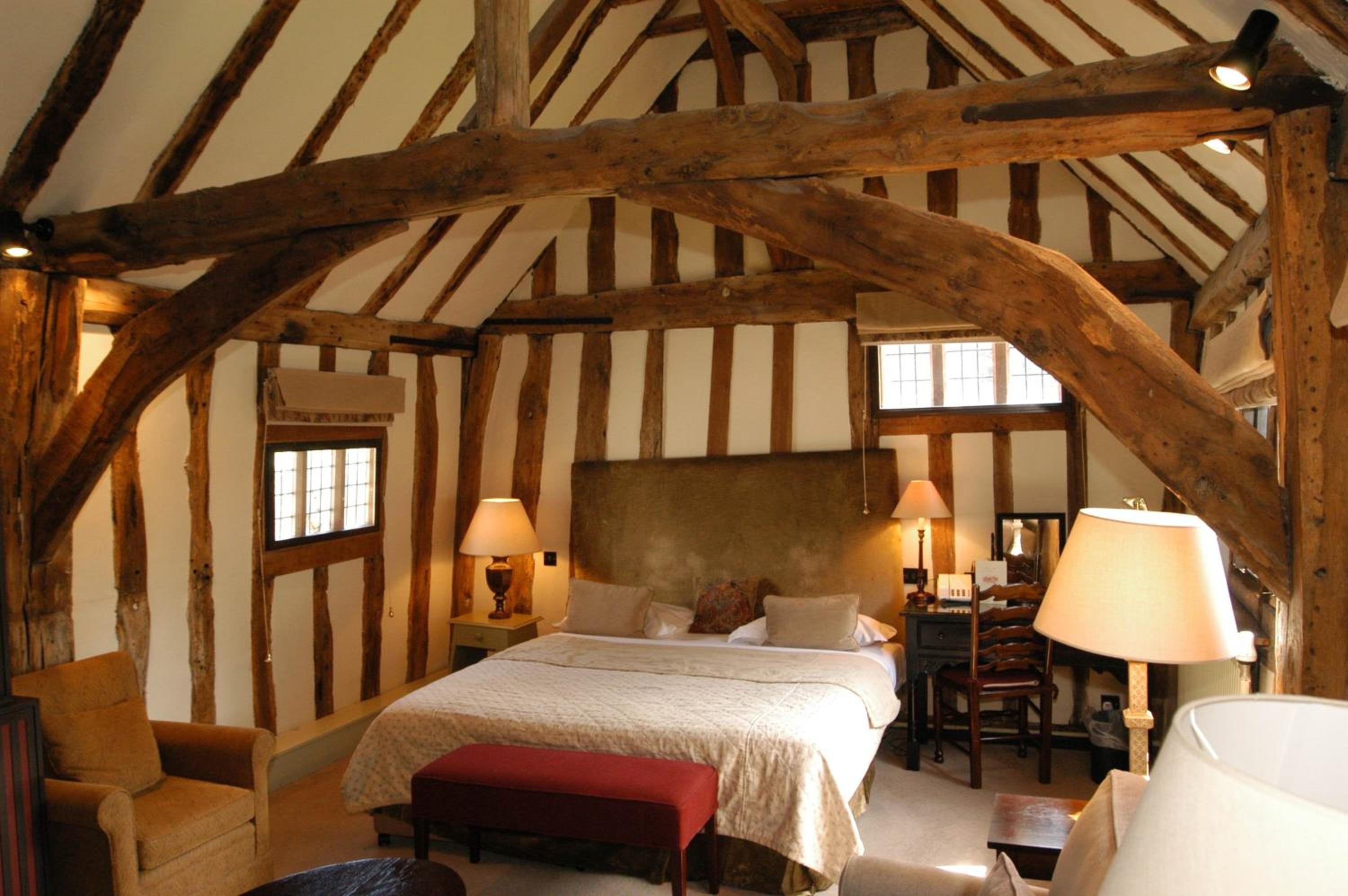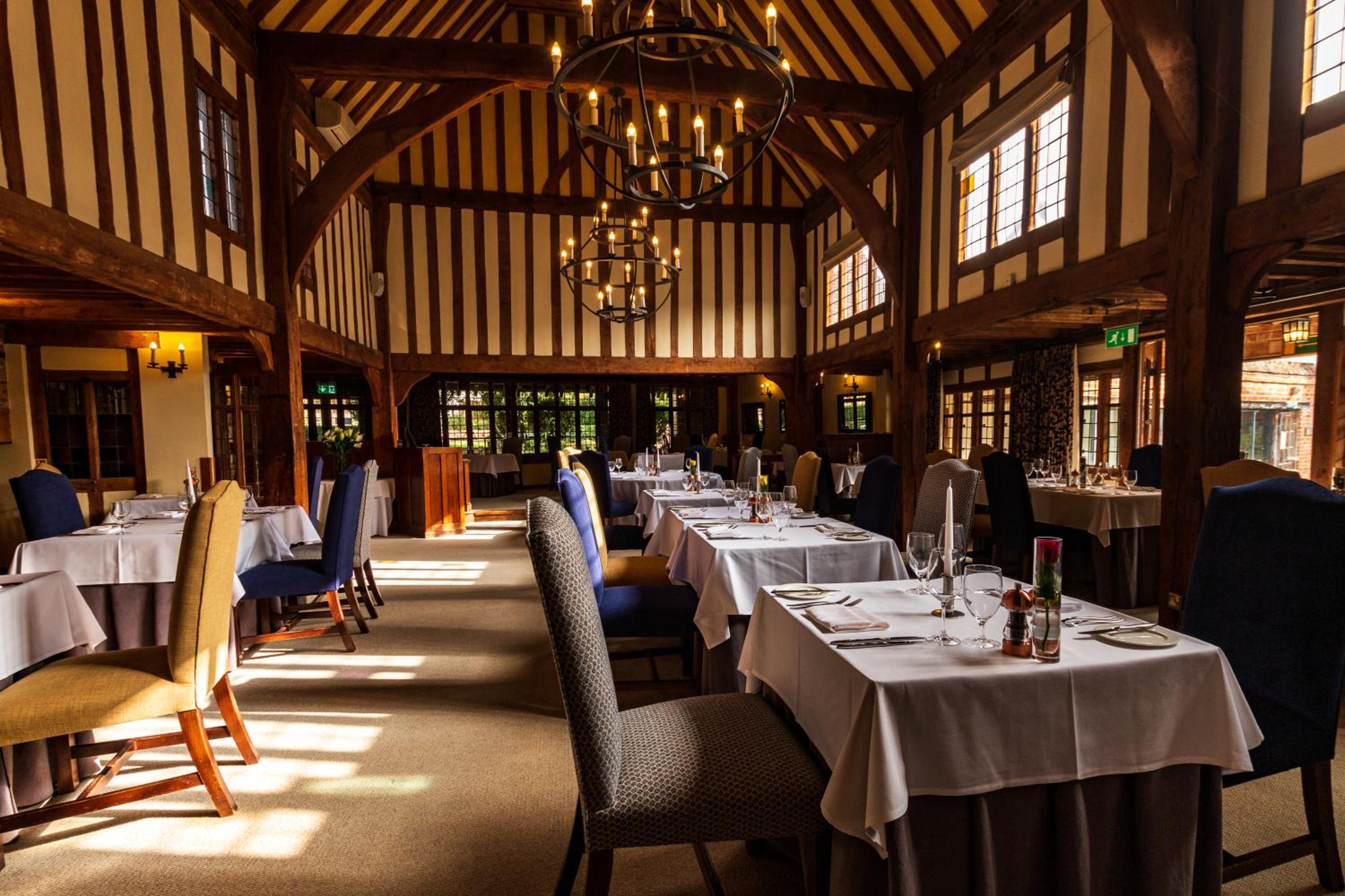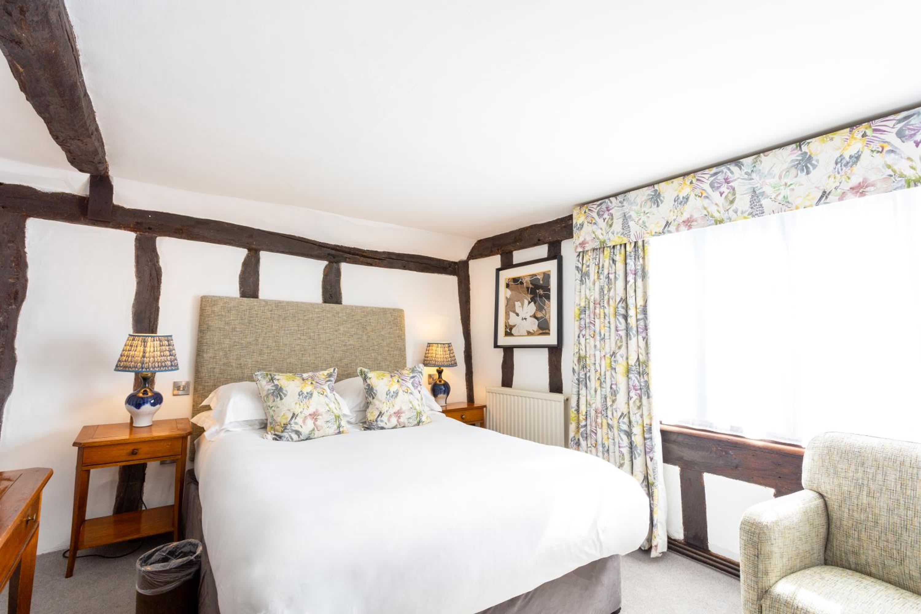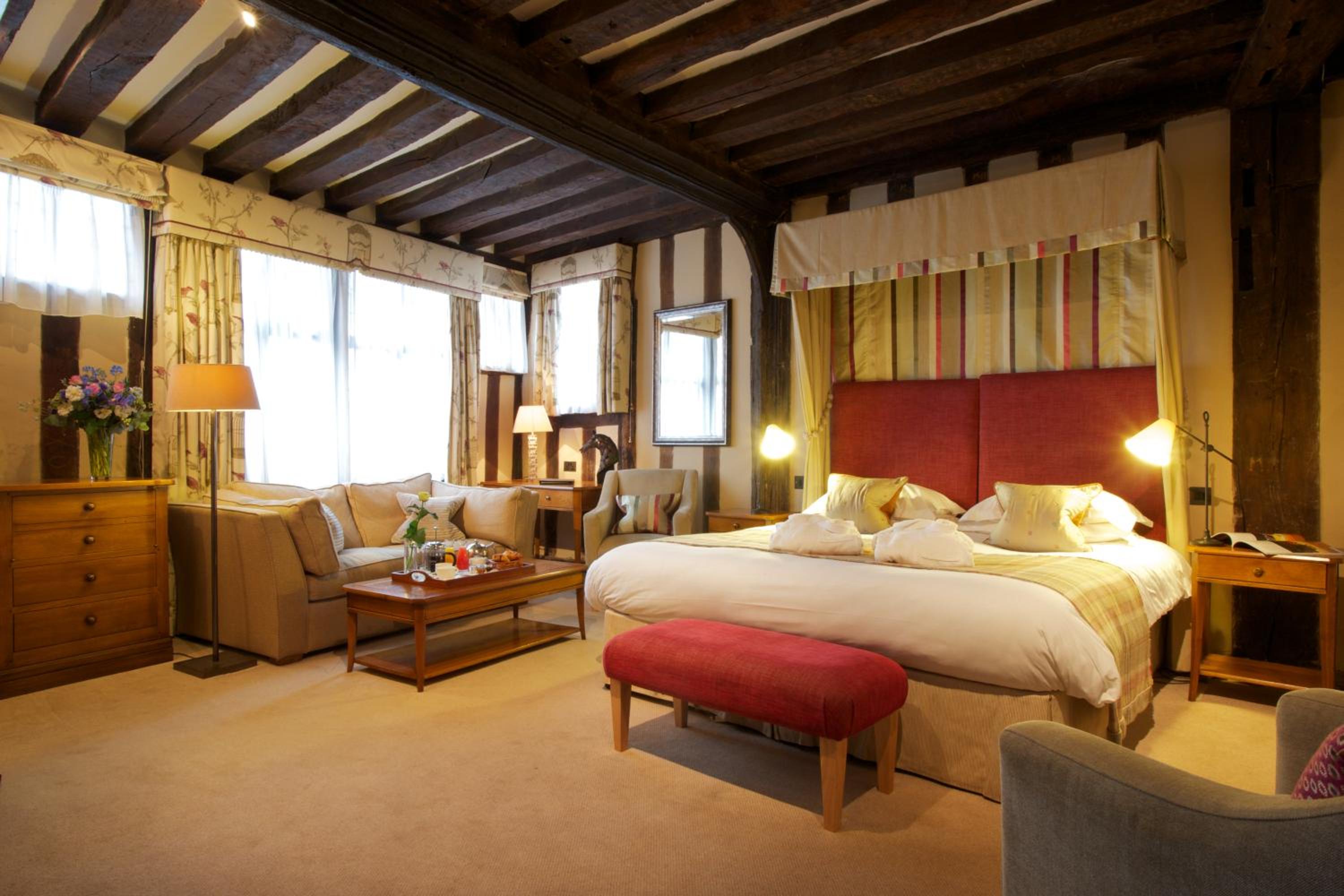 Wonderful building to explore in the heart of Lavenham. Free parking and spa on site (which we didn't use). Excellent evening meal in the amazing beamed restaurant, with very attentive staff and lovely background piano music. Breakfast also held there with a good range of food and hot options cooked to order. Our room was very clean and quiet with a smart bathroom and all the toiletries you need. Love the handmade ceramic mugs, tray and tea/coffee containers.