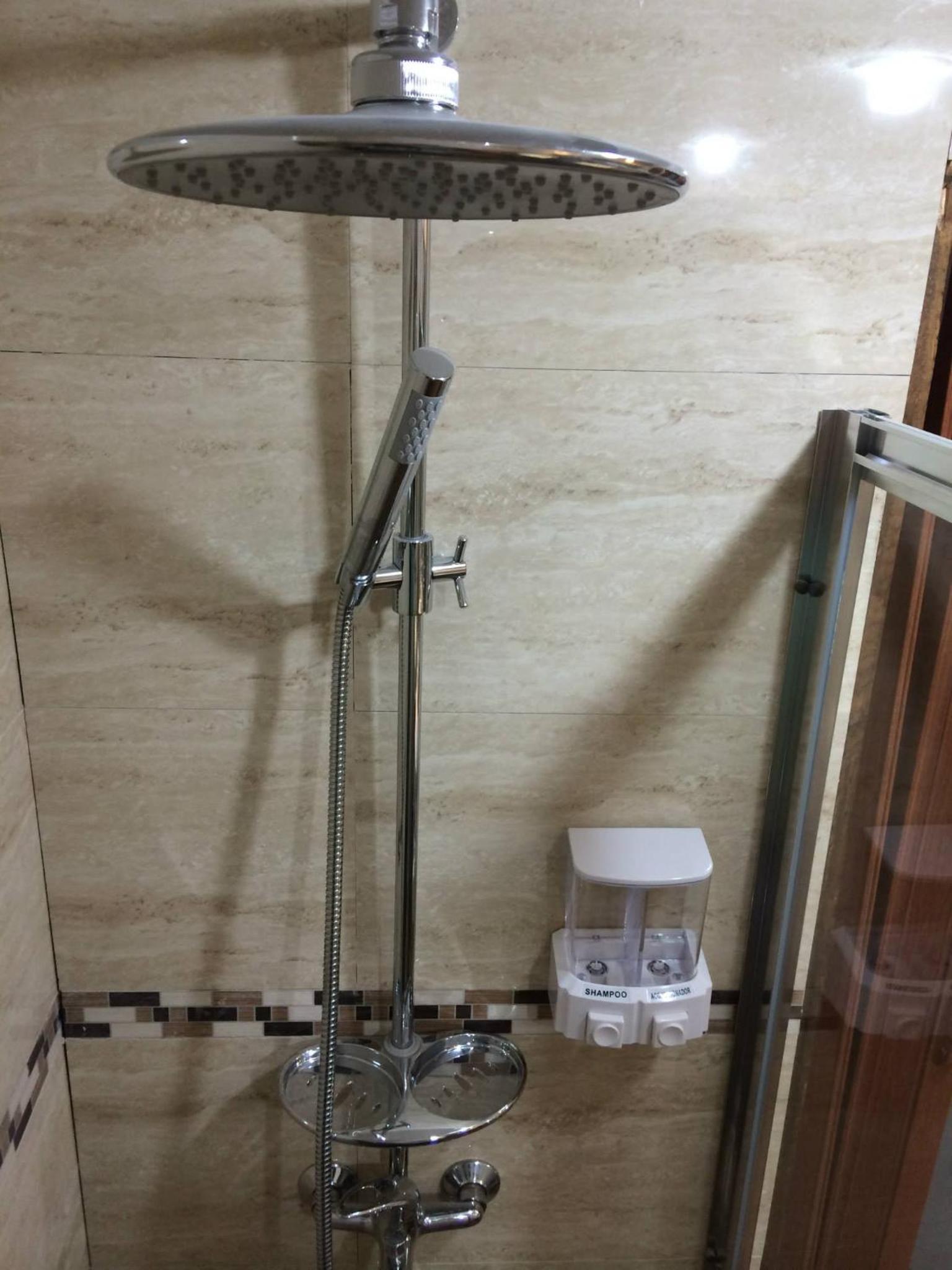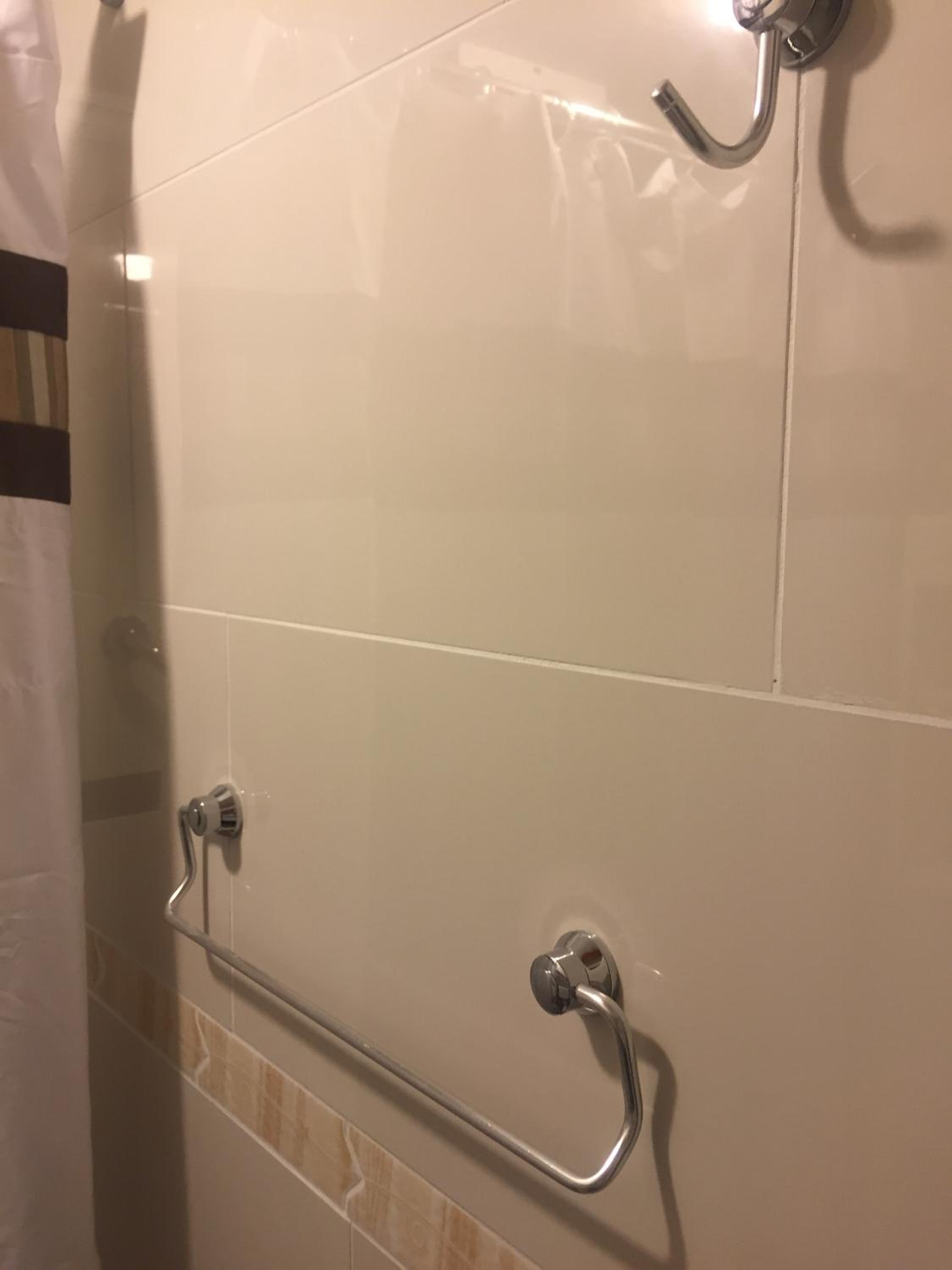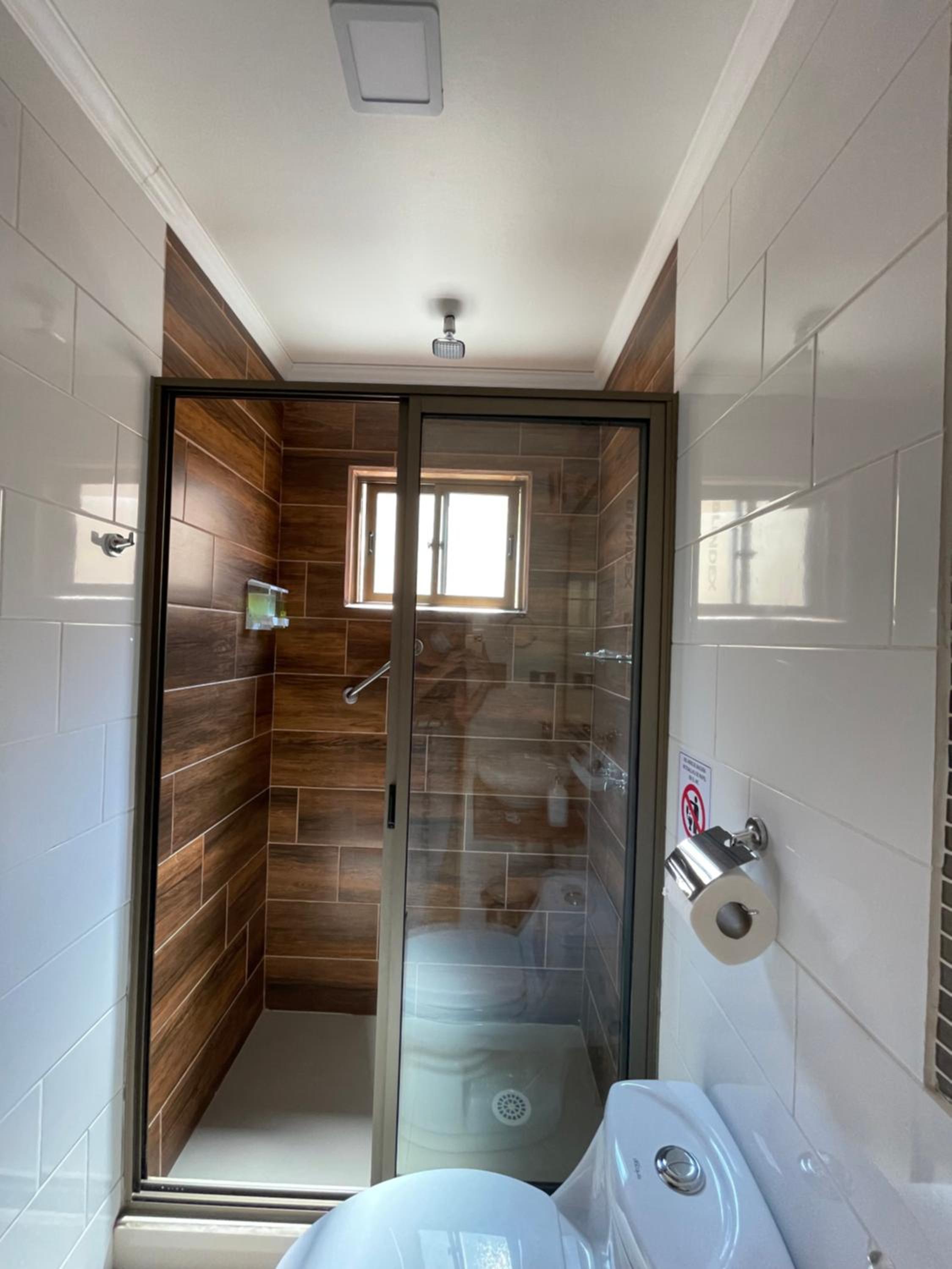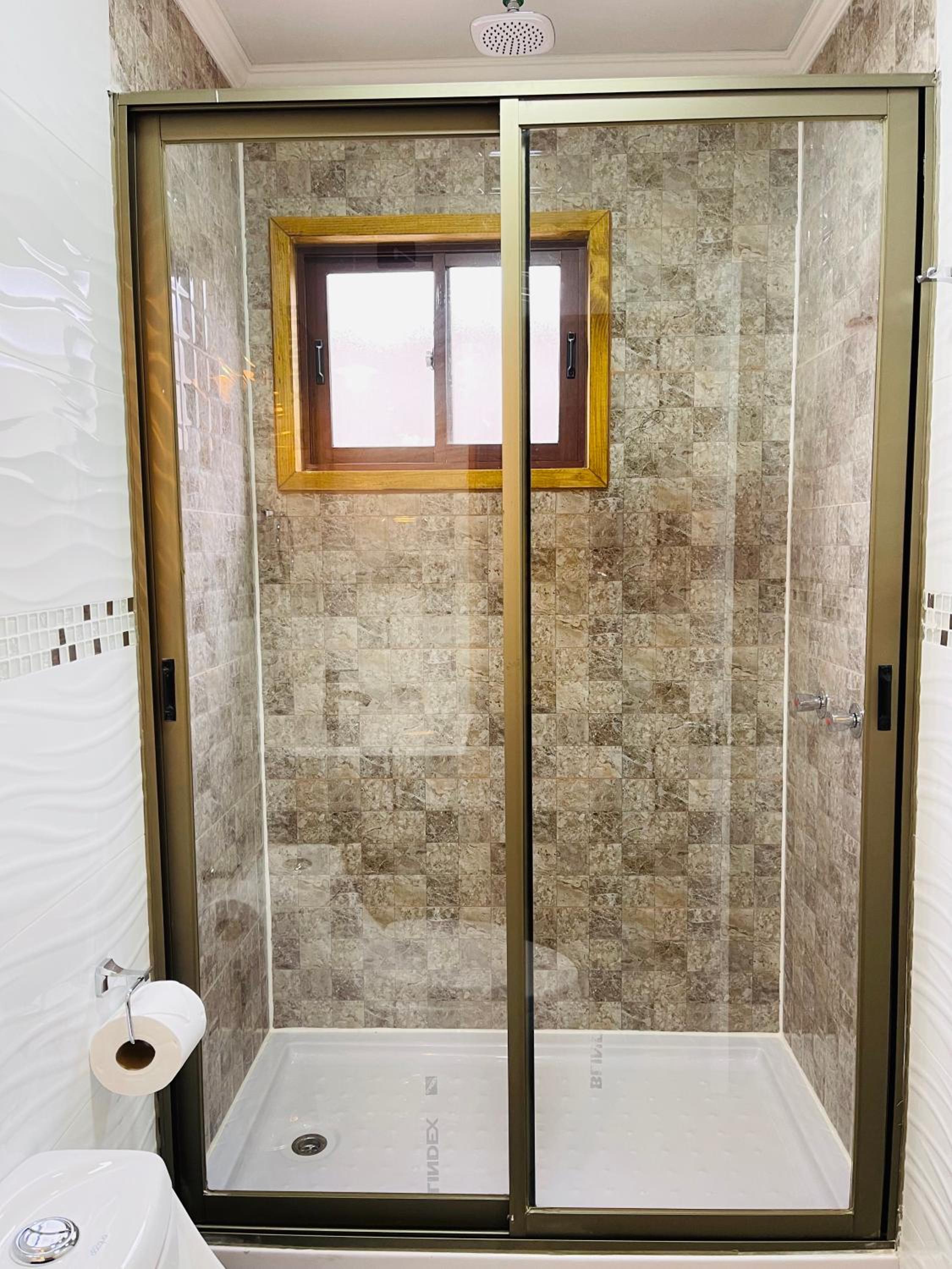 La ducha incomoda y habitación sin ventana y como medida contra incendio una mangera conectada a una llave a la salida de la habitación