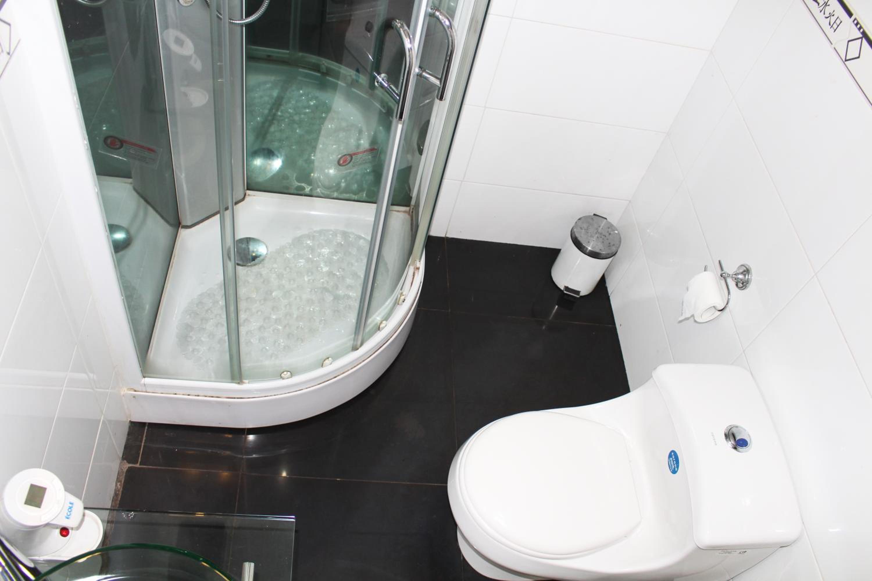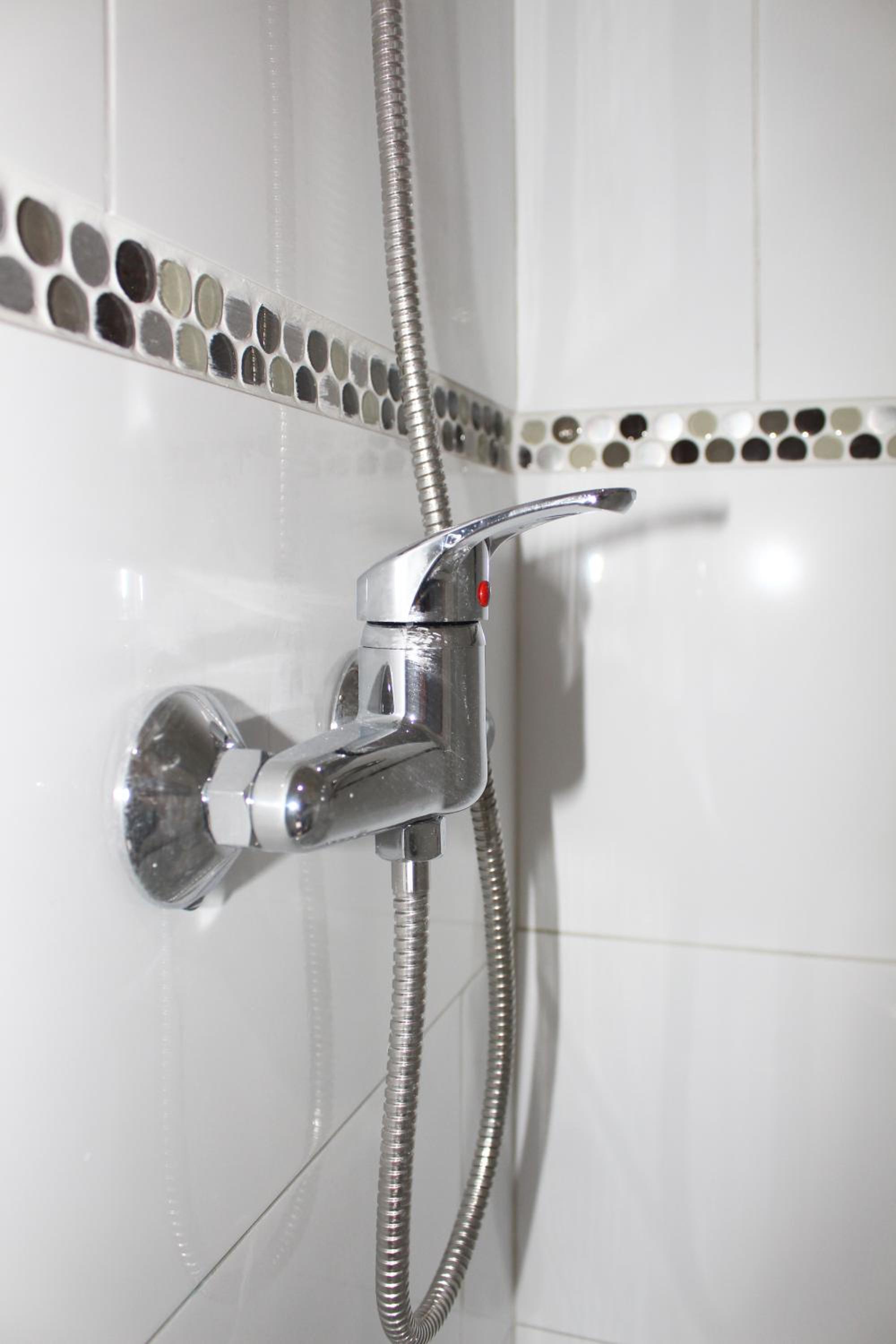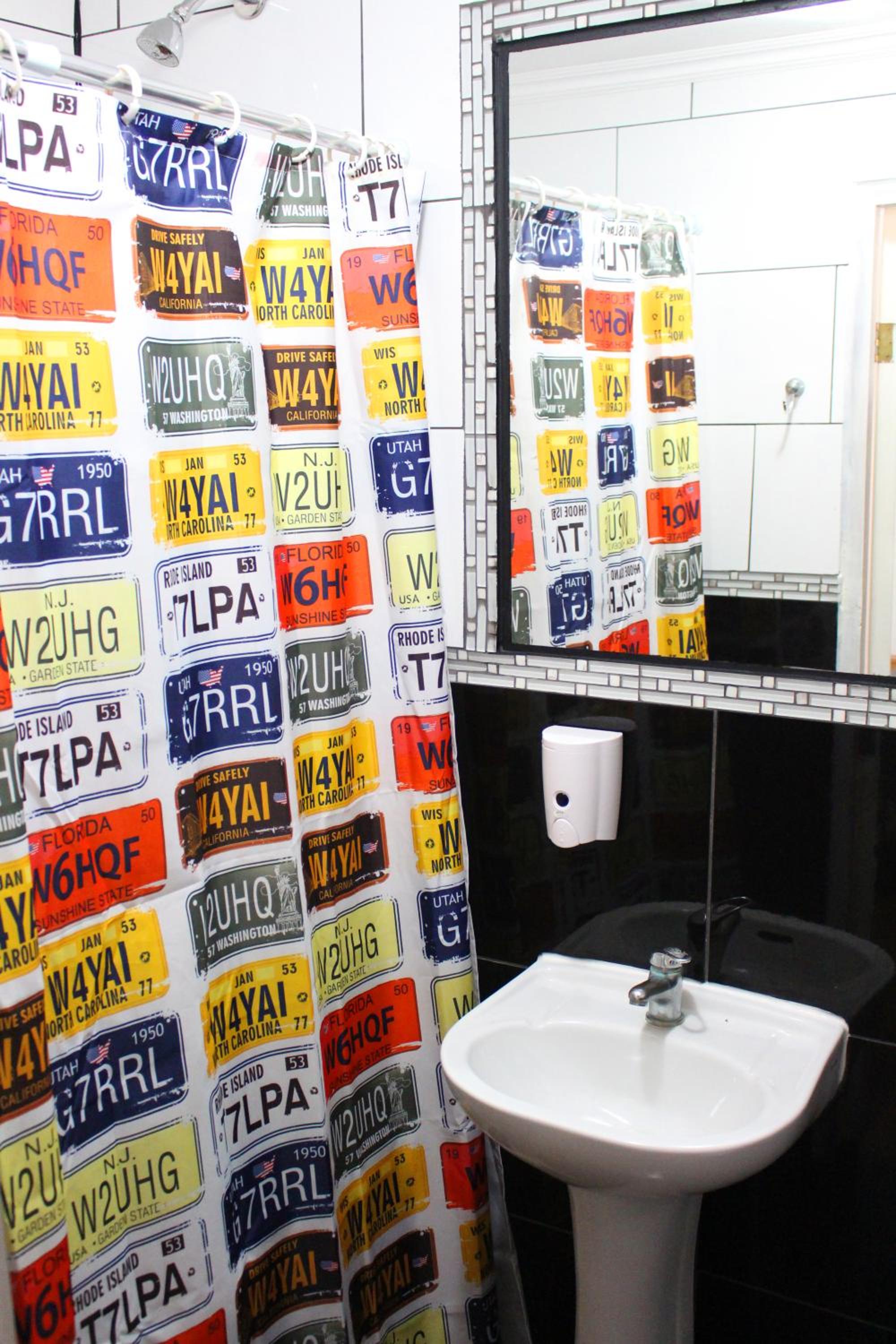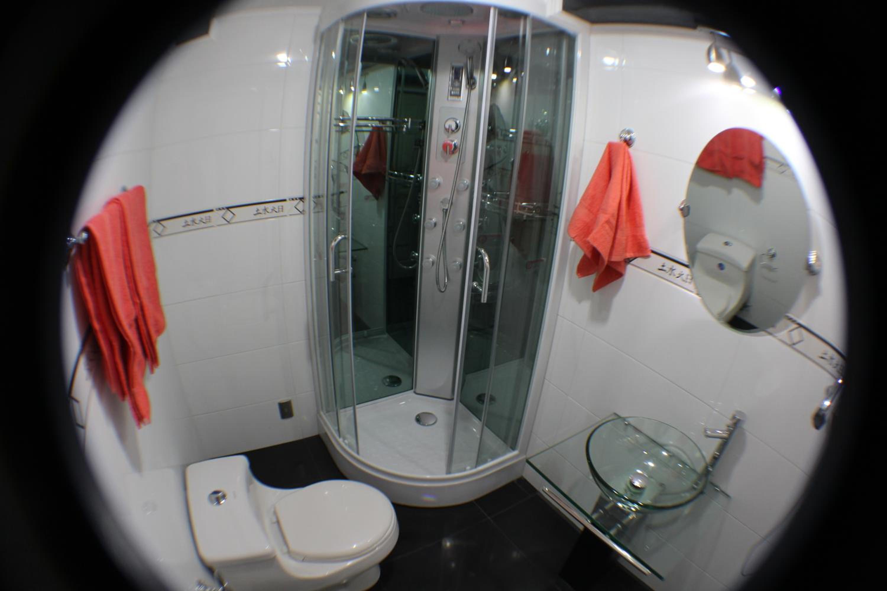 La ducha incomoda y habitación sin ventana y como medida contra incendio una mangera conectada a una llave a la salida de la habitación