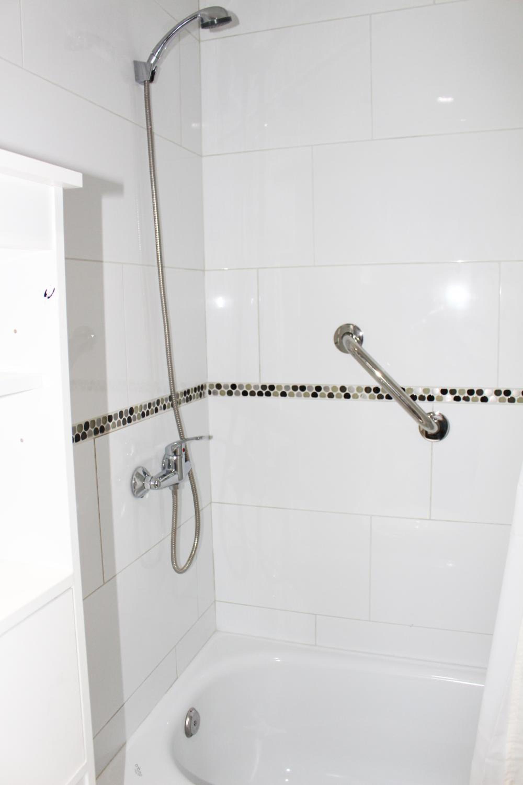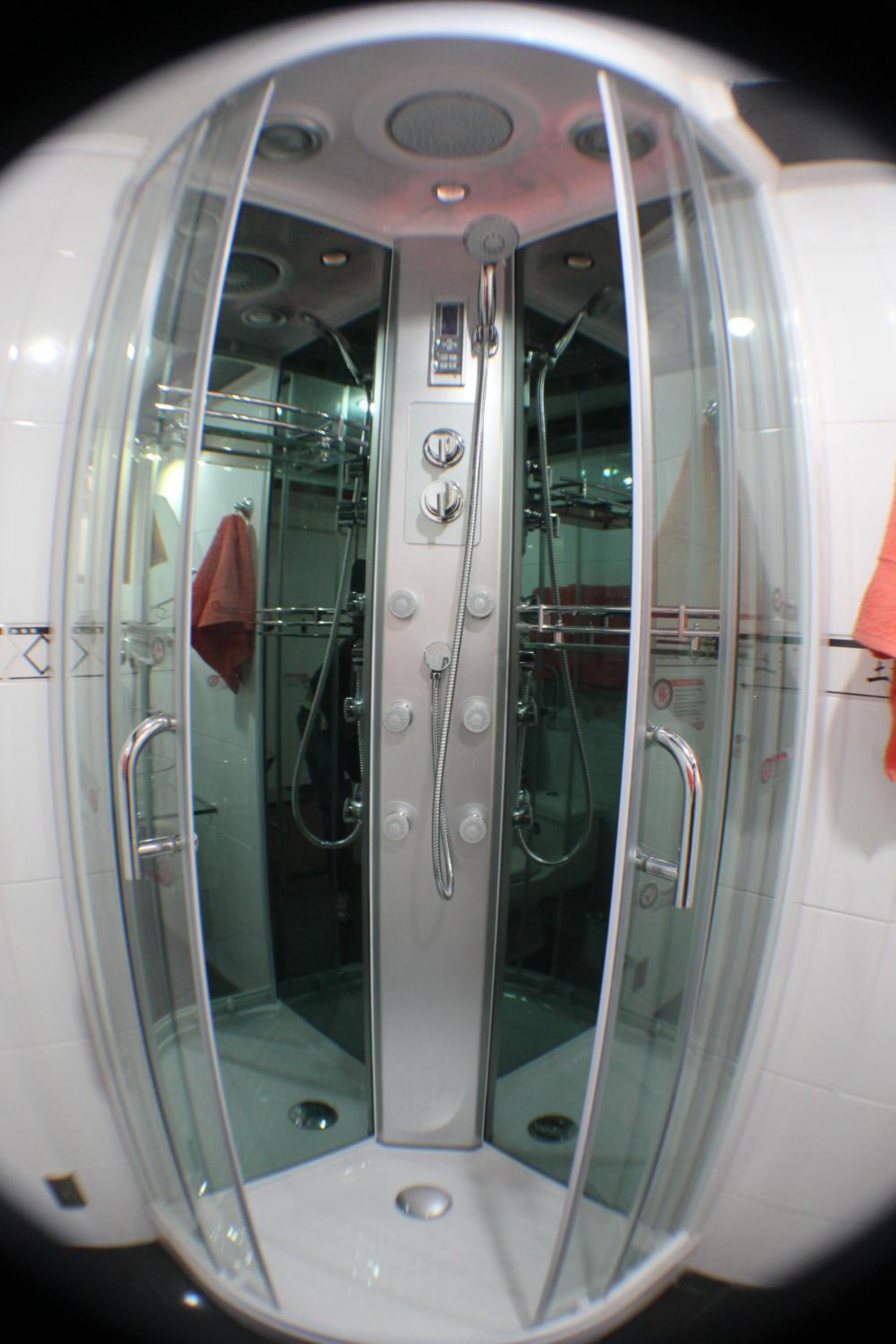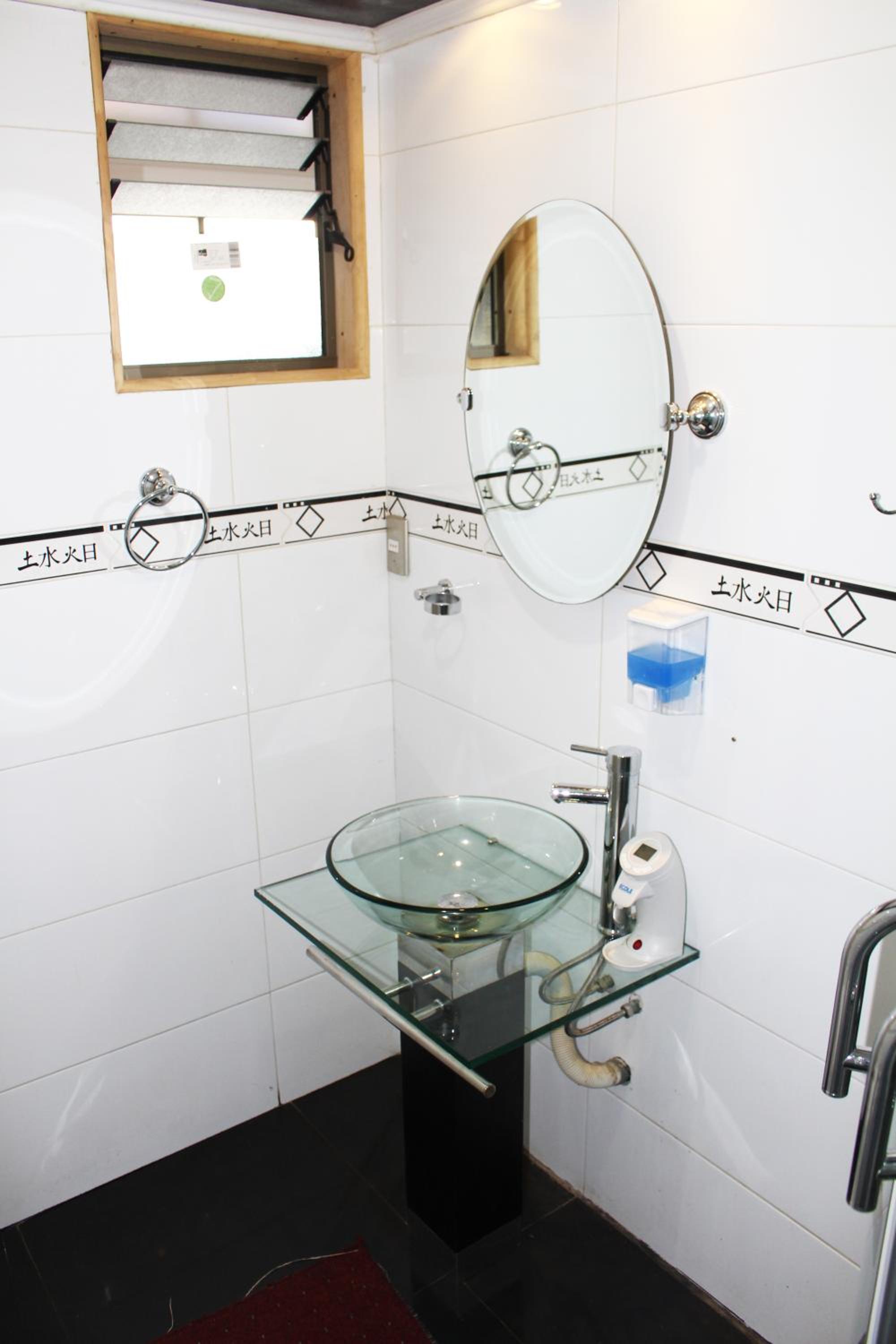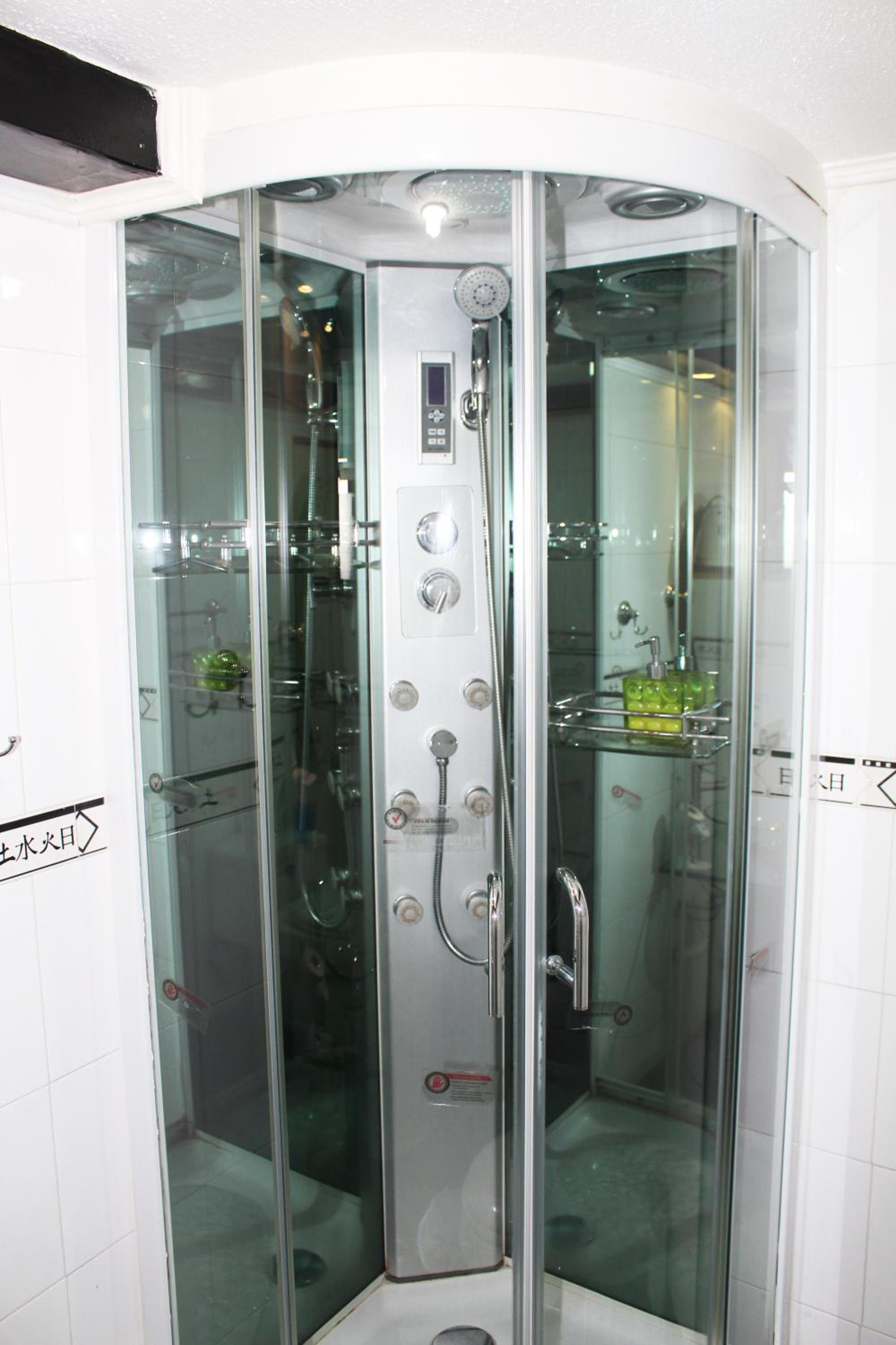 La ducha incomoda y habitación sin ventana y como medida contra incendio una mangera conectada a una llave a la salida de la habitación