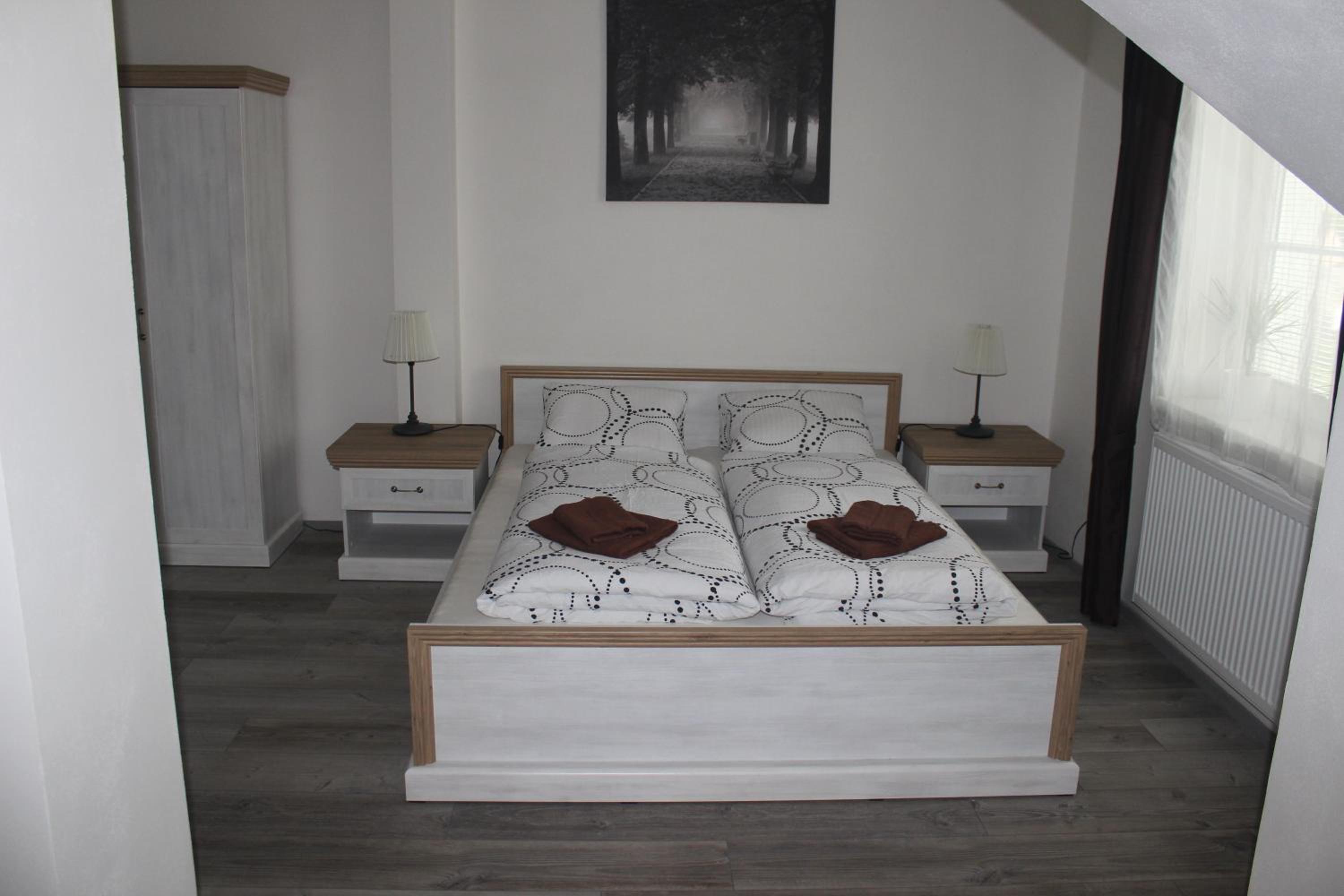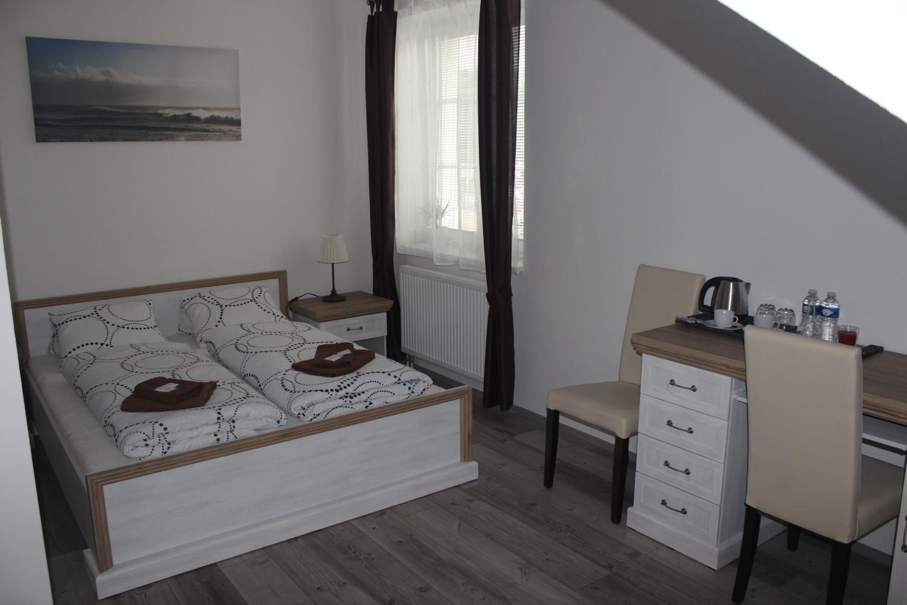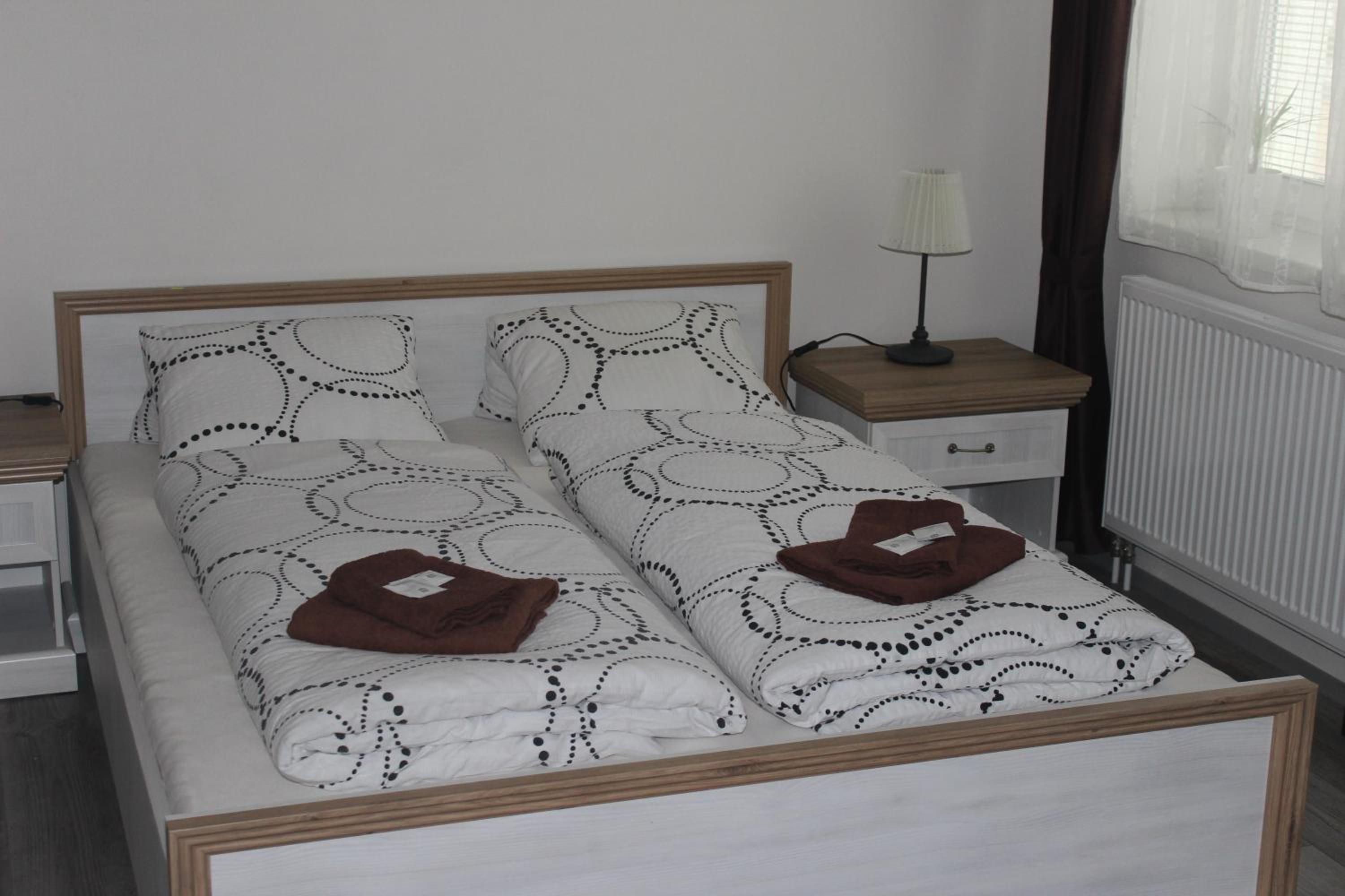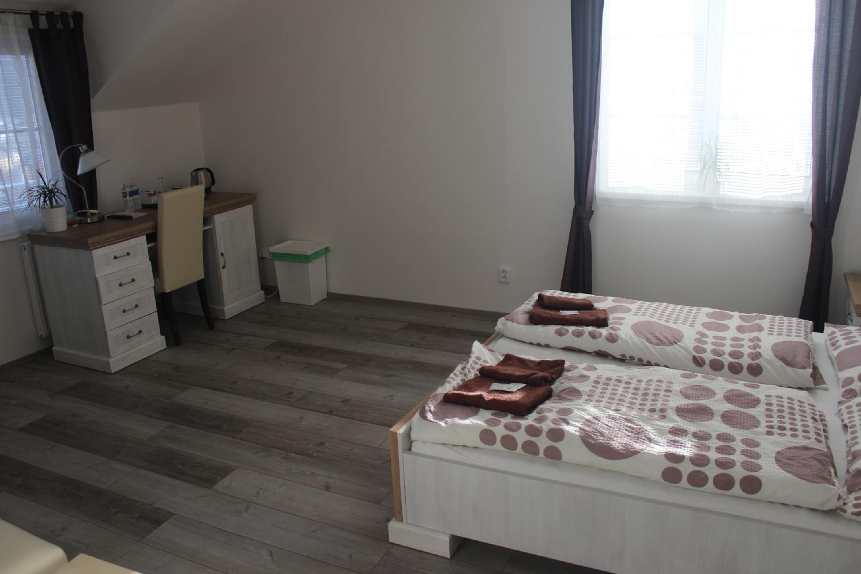 Hezký čistý pokoj, pohodlné postele, lednička na pokoji.