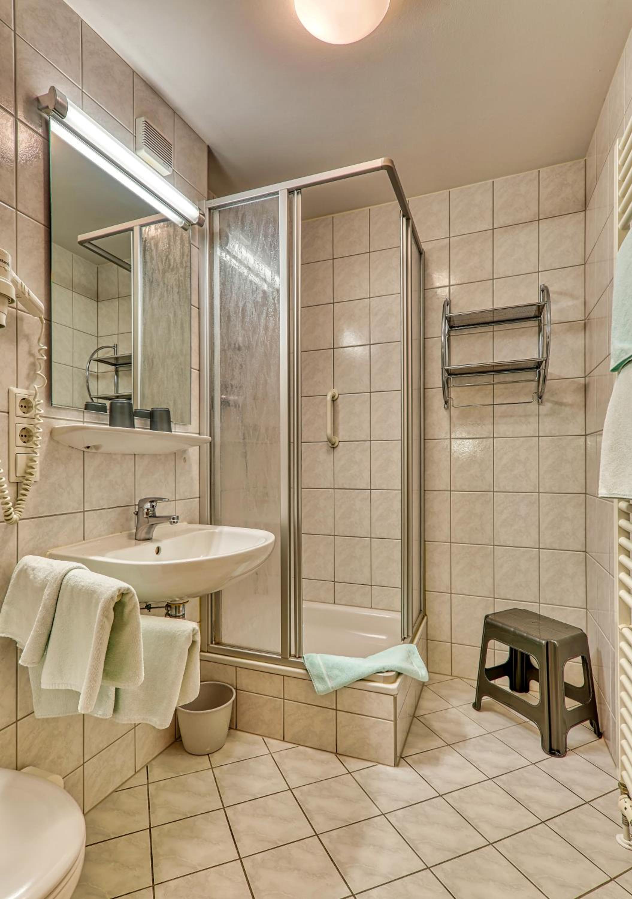 Das geräumige Zimmer, Badezimmer mit Türe getrennt. Die ruhige und trotzdem zentrale Lage und die Nähe zum Thermalbad!