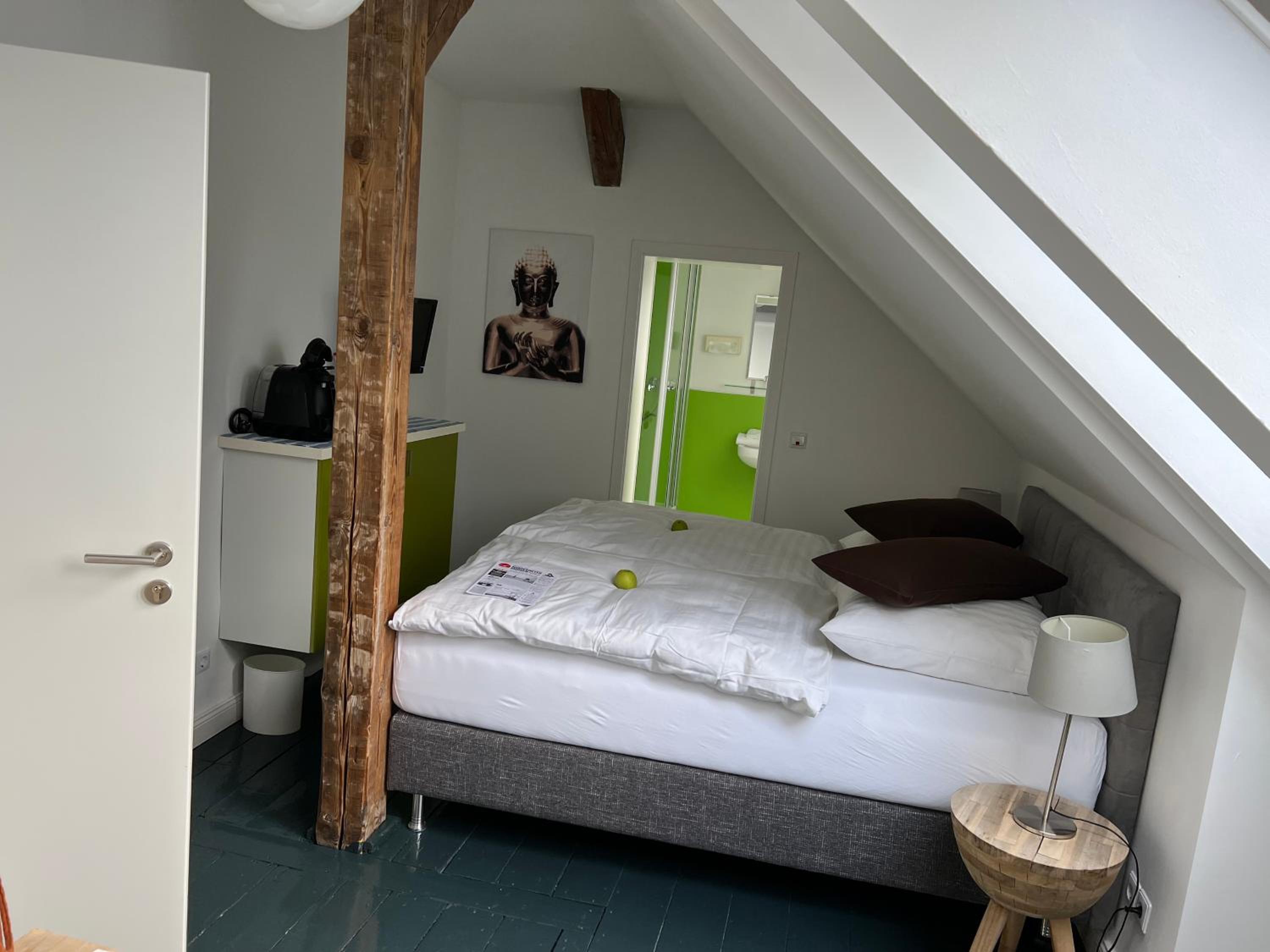 Der Empfang war sehr freundlich, wir haben direkt das Zimmer bekommen, wunderbare Atmosphäre im Haus, ein hervorragendes Frühstück im gemütlichen Ambiente, perfekte Lage, nettes Entgegenkommen bei bei Extrawünschen,Wir kommen sehr gerne mal wieder