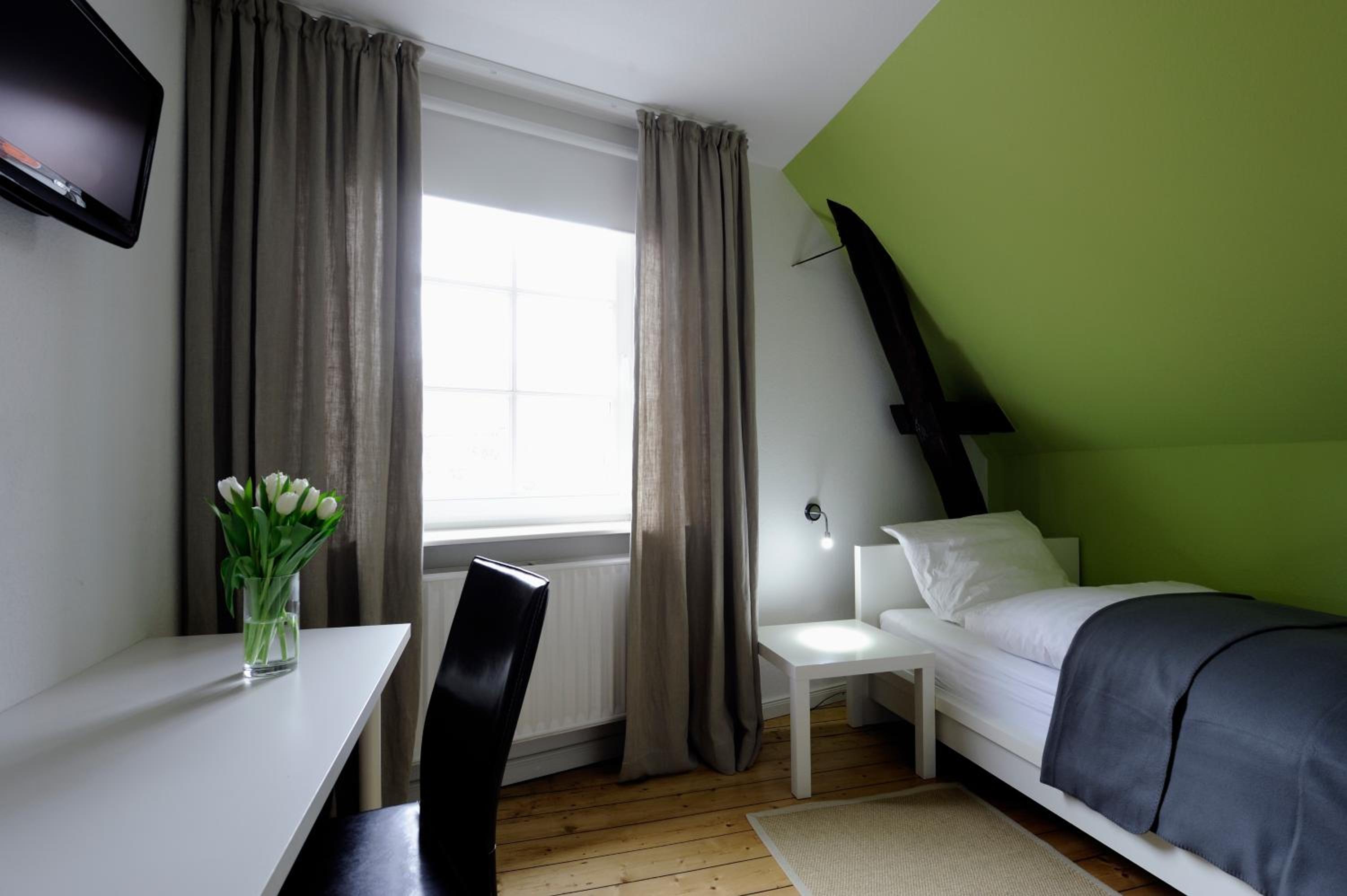 Die Lage ist sehr schön gelegen. Die Innenstadt ist direkt daneben. Es ist aber trotzdem sehr ruhig. Es gibt Parkmöglichkeiten in der Nähe. Das Personal ist sehr nett. Man kann sich jeder Zeit einen Tee kochen.