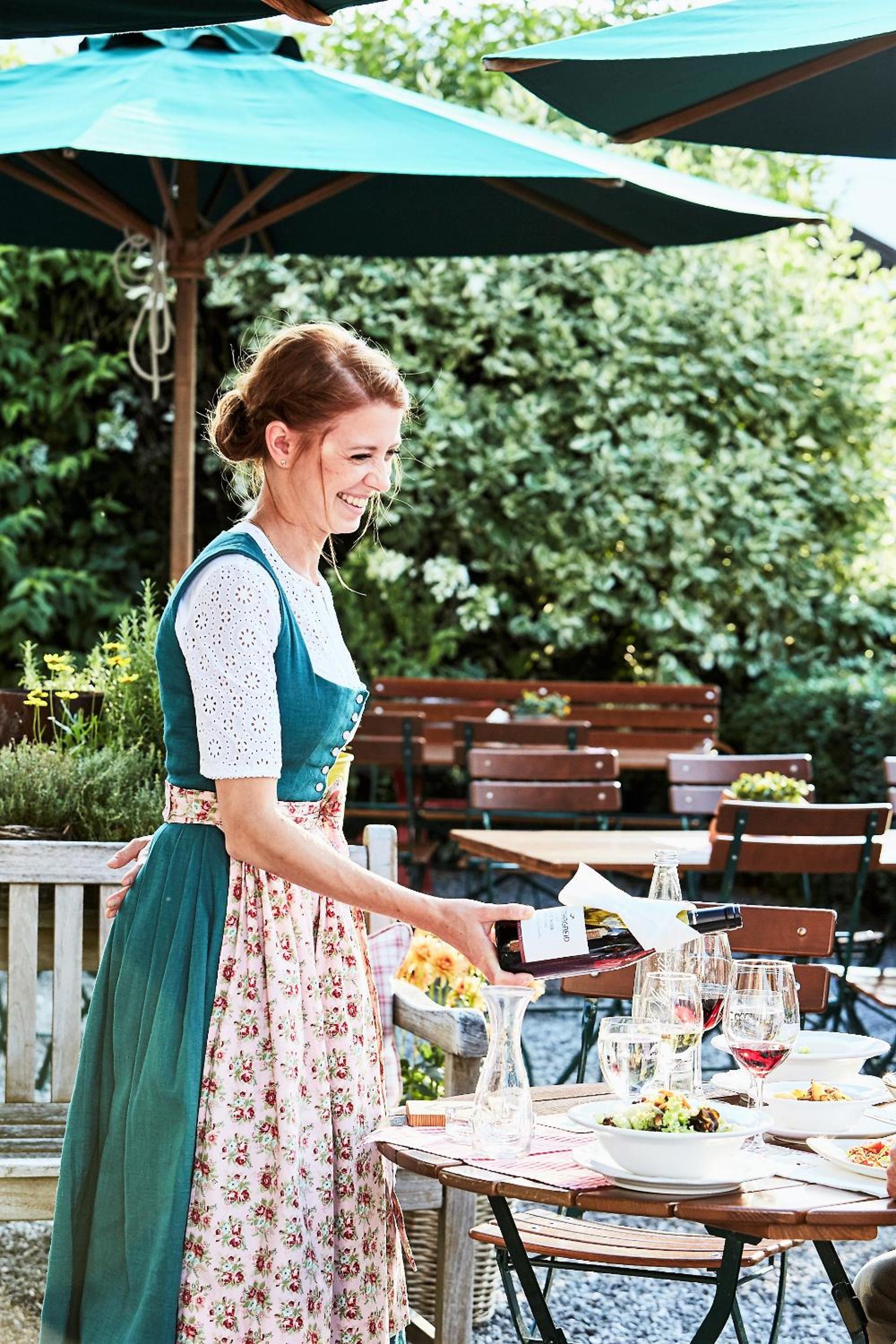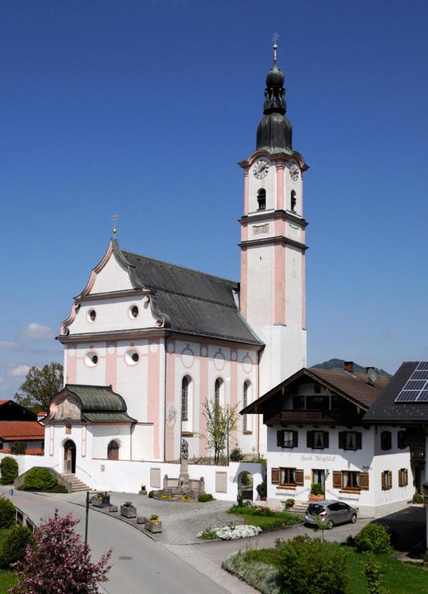 Idyllic Beer Garden: Unwind in our picturesque beer garden with stunning views of the Flintsbach Baroque church, the perfect spot to enjoy a refreshing drink and soak in the serene atmosphere.