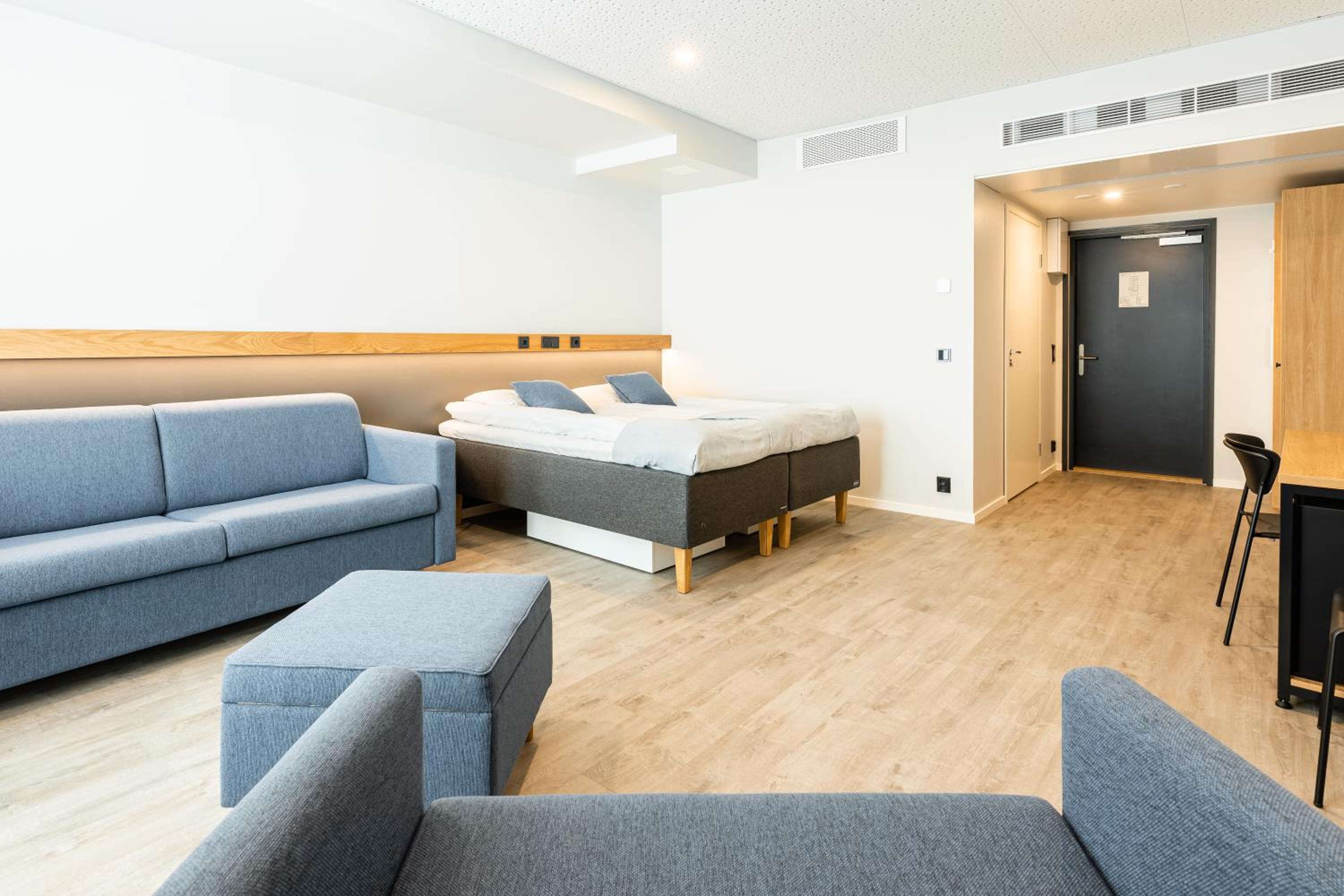 Room has simple and logical layout, enough space even to do stretching exercises on the floor by multiple people at the same time. Good size TV and spacious bathroom. Breakfast was tasty and selection of food was great as well. There are tons of sporting activities you can do in the vicinity of hotel.