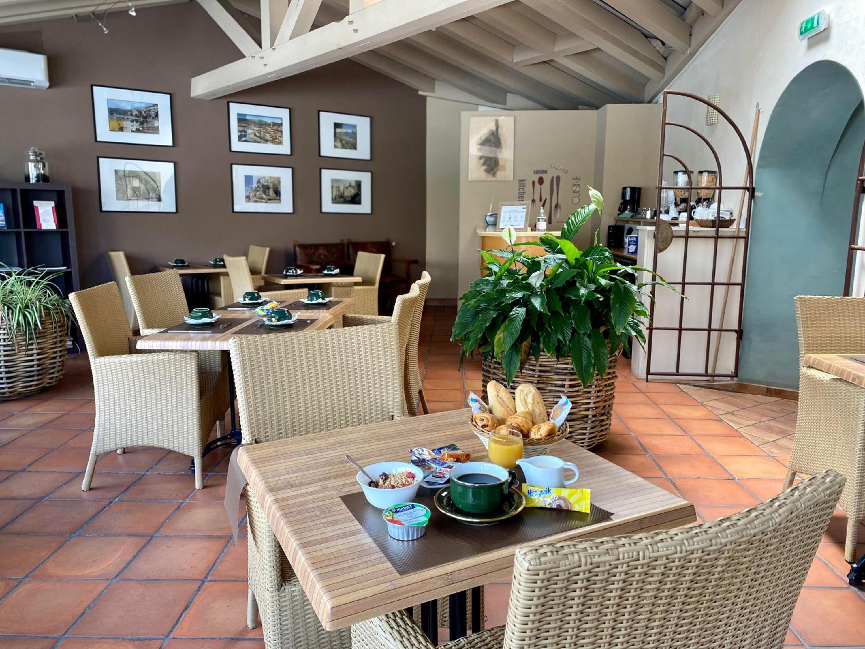 Start your day in the bright breakfast room with panoramic views of the Mediterranean sea. Additionally, the hotel offers a motorbike garage and a secure car park for a worry-free stay.