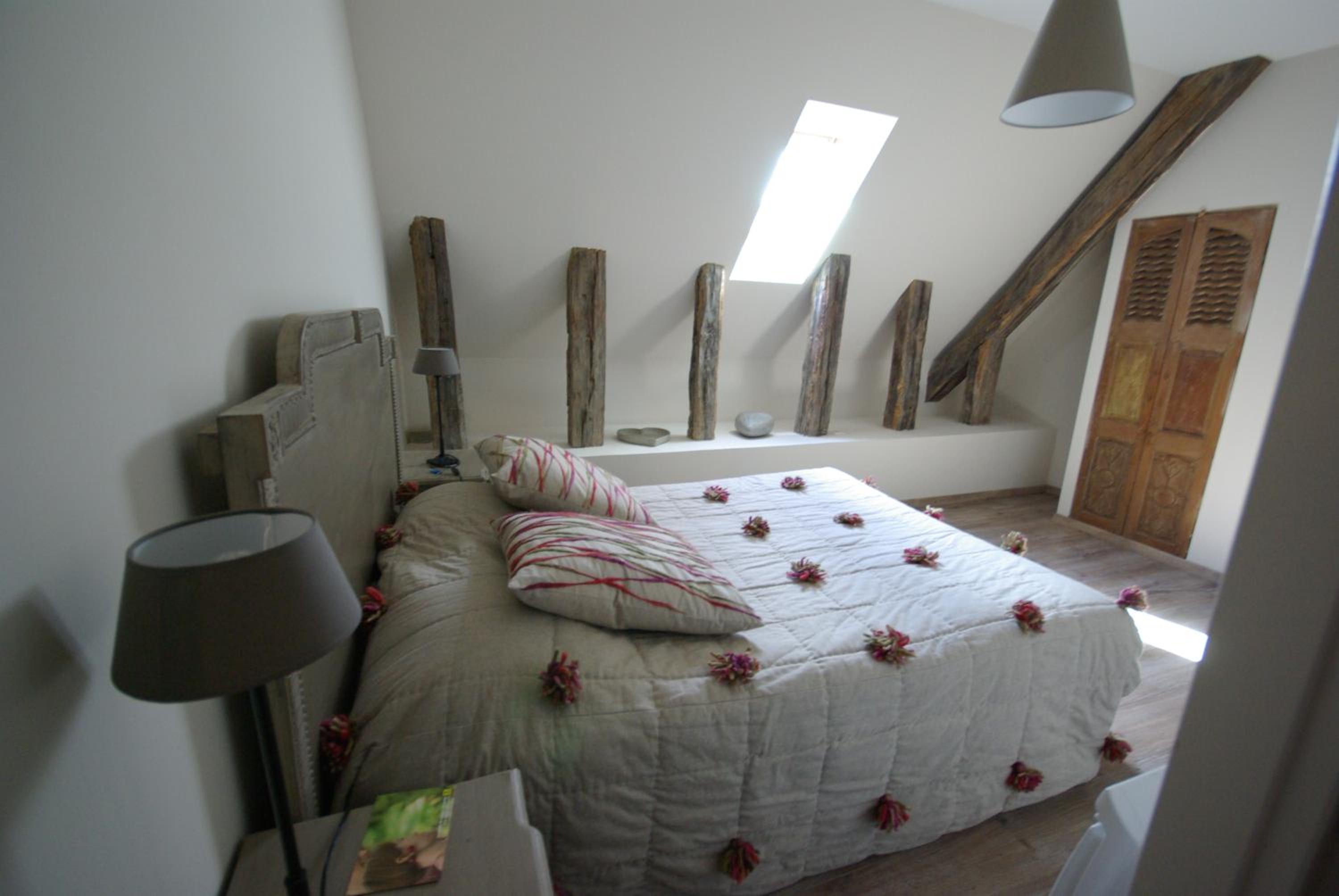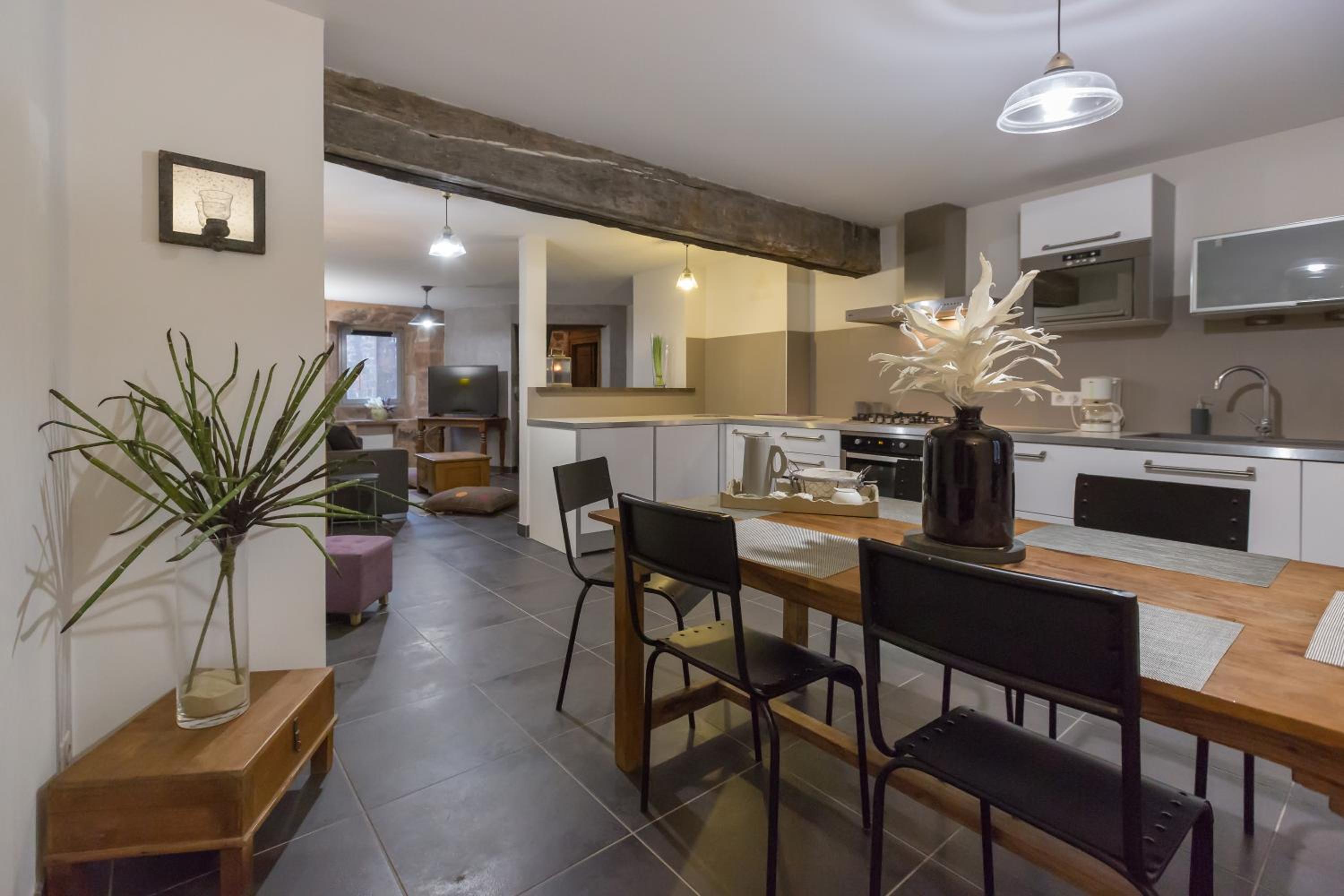 Cozy Guest Rooms: Experience comfort in elegantly decorated guest rooms featuring exposed wooden beams, tiled flooring, private bathrooms, and flat-screen TVs.