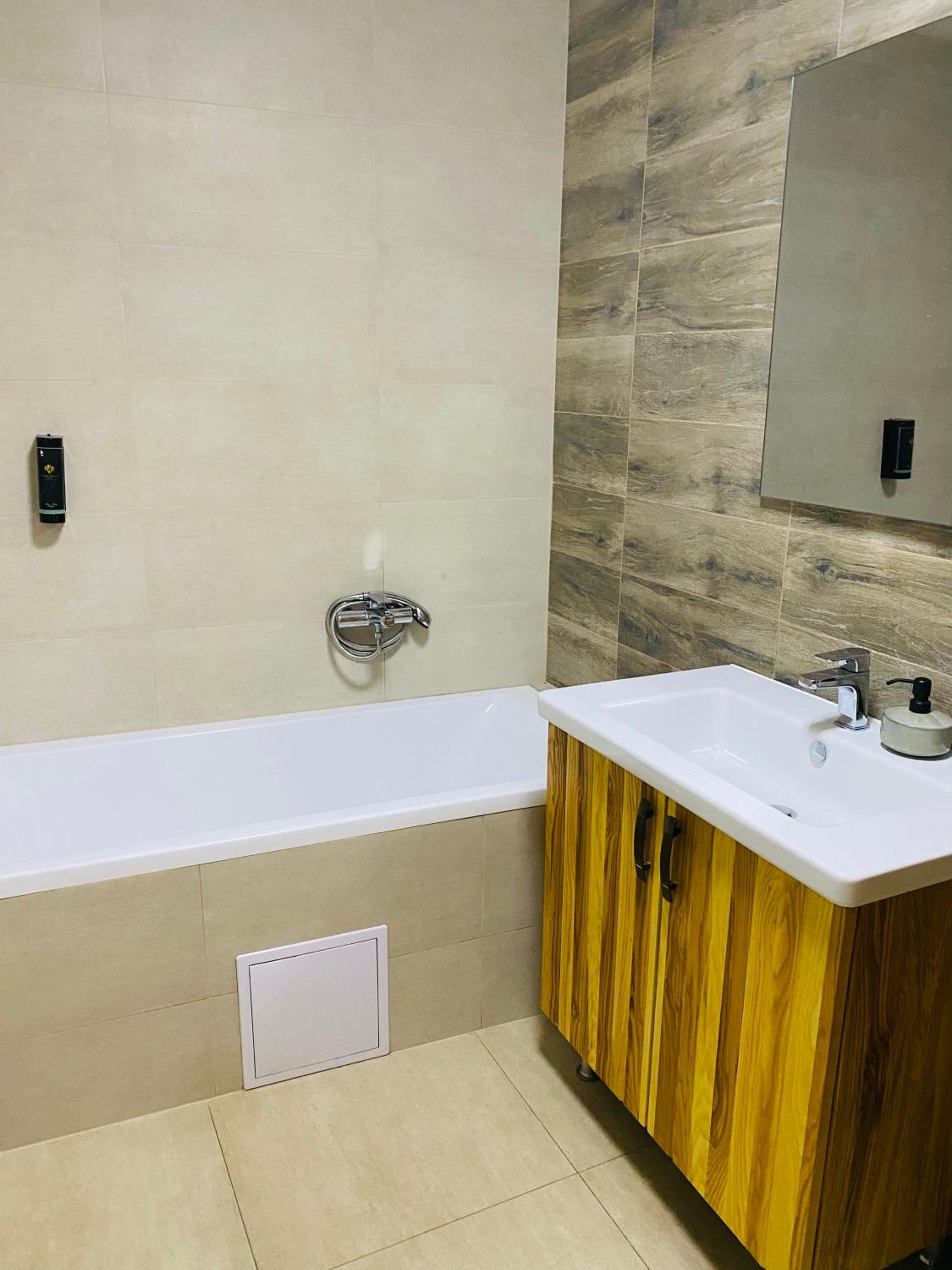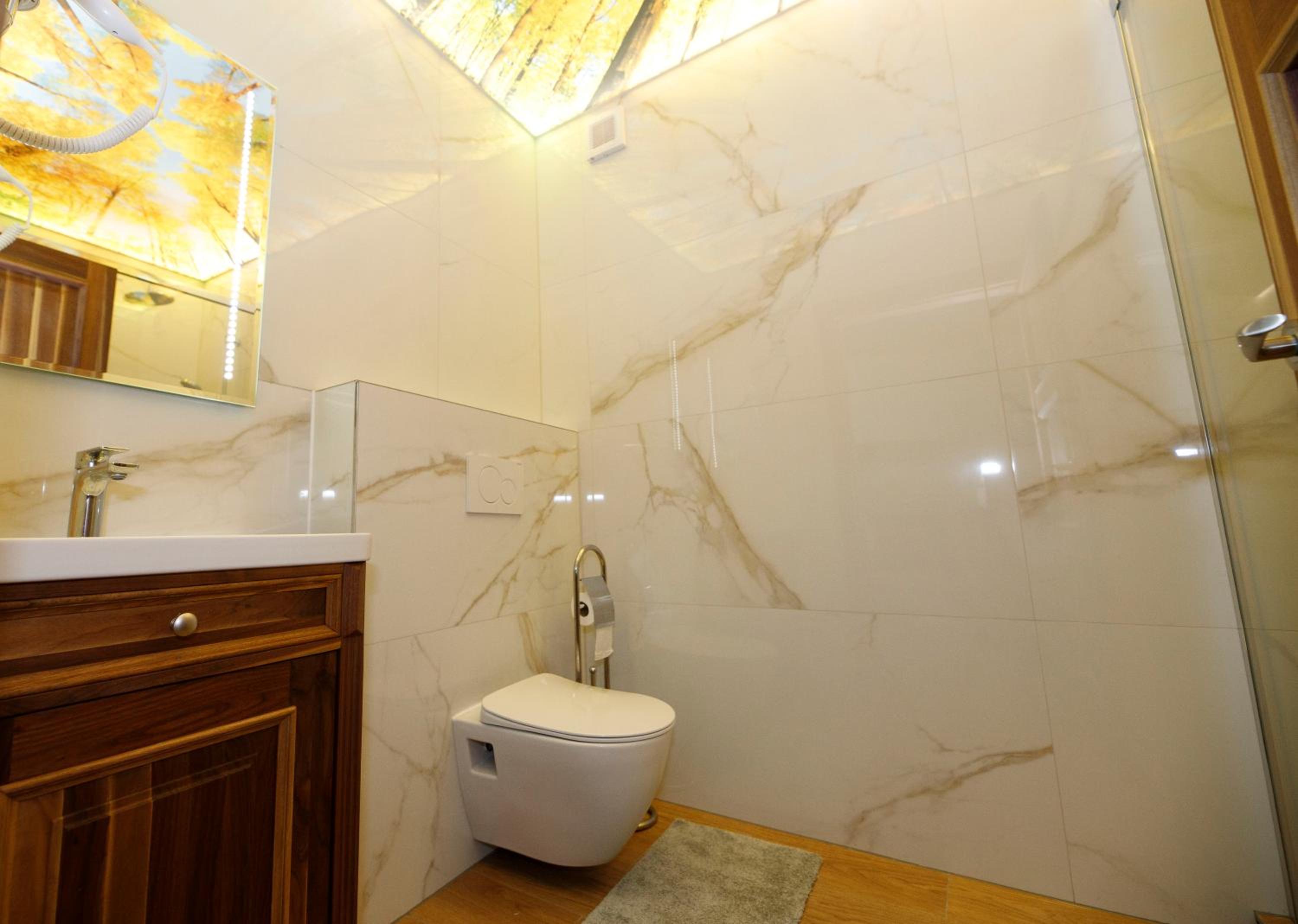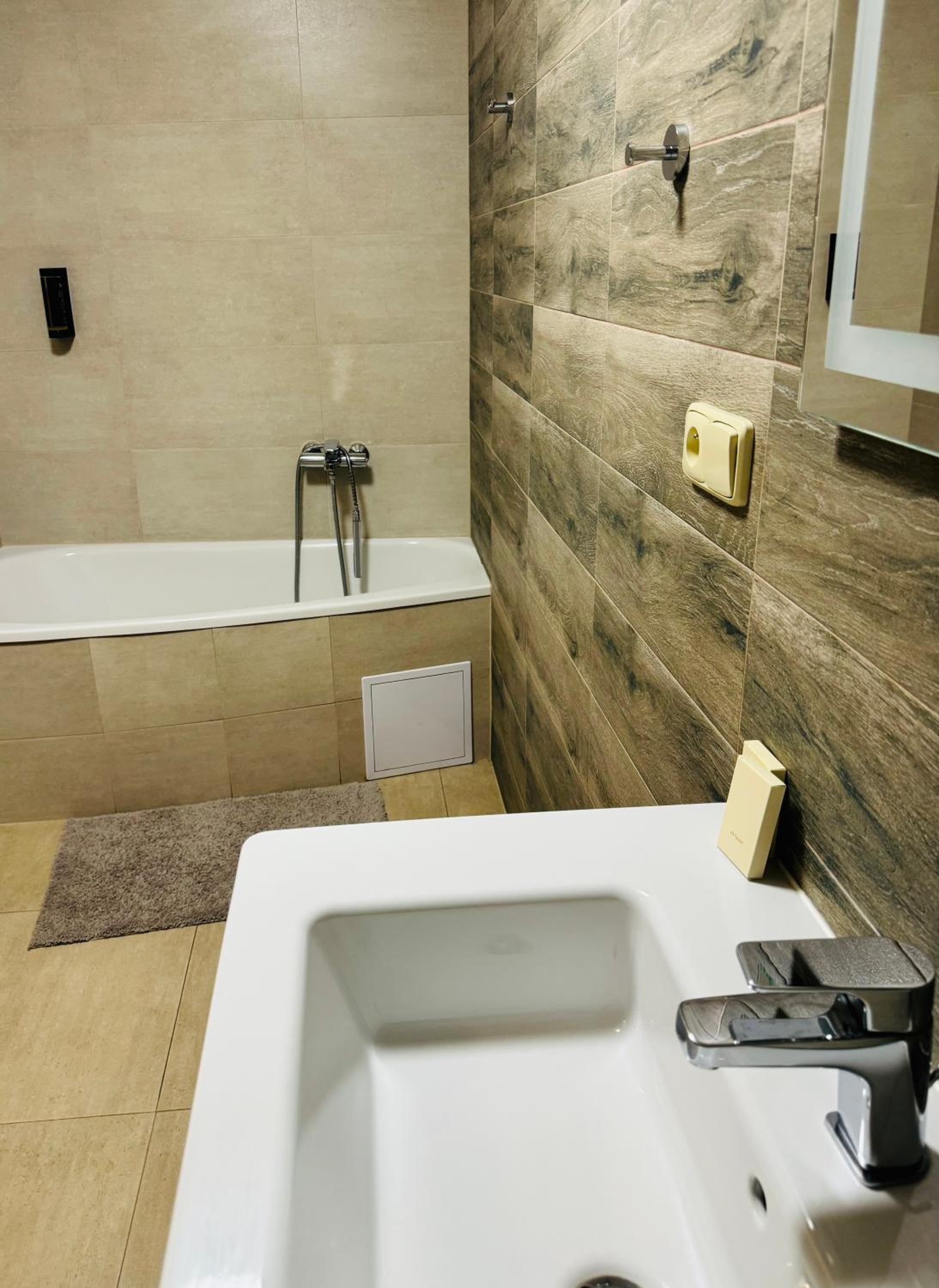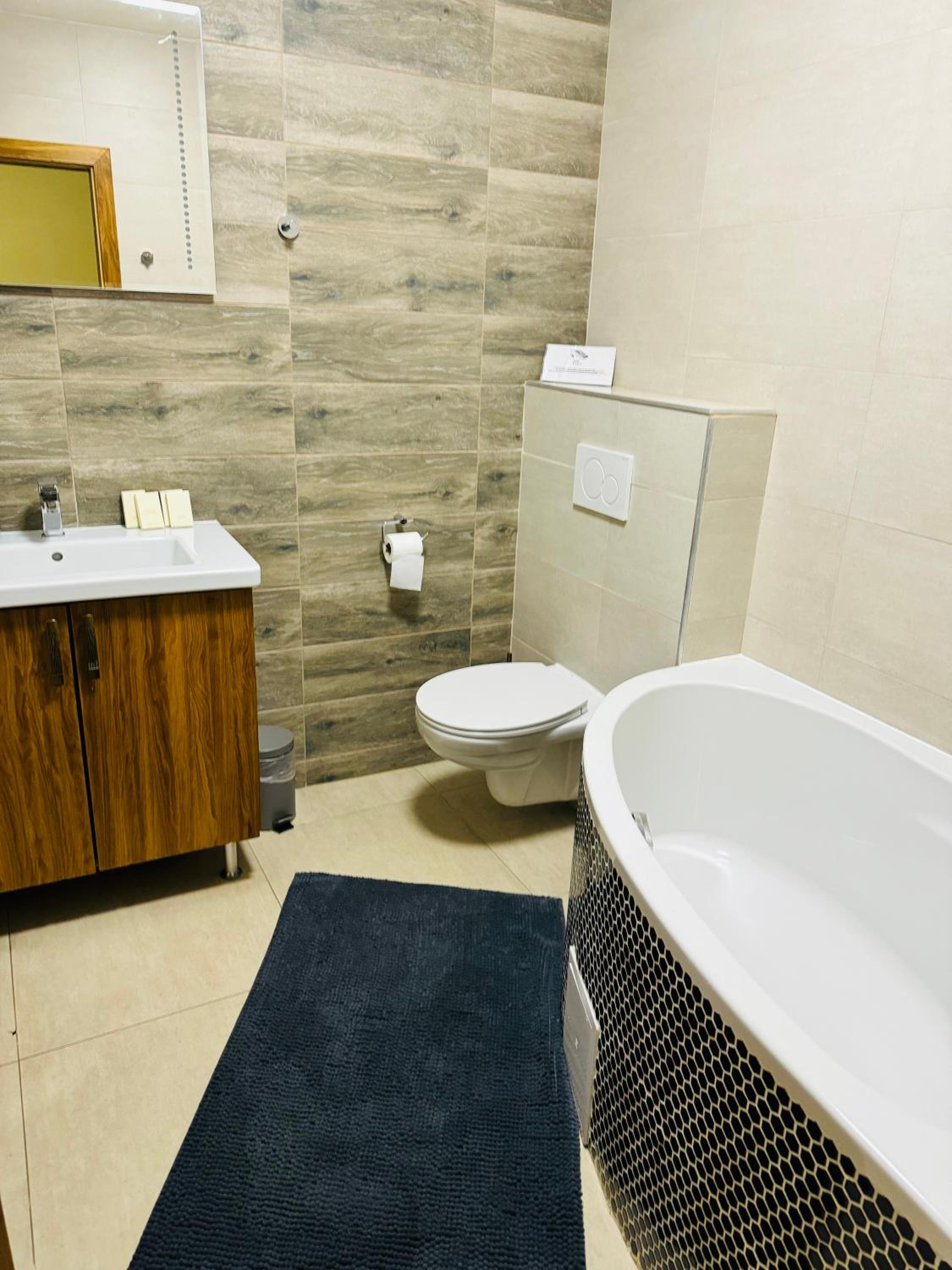 Navzdory použitých kvalitních materiálů není apartmá správně dokončen. Vířivá vana není stále obložena, vypadá to trochu lacině a navíc je bohužel obyčejnějšího charakteru. Po napuštění horké vody a zapnutí vířivých trysek se voda neohřívá, ale pouze víří vodu. Zhruba po třiceti minutách už voda není horká, ale spíše vlažná. Je nutné vanu vždy vypouštět. Navíc po napuštění jedné celé vany horkou vodou, dojde v apartmá teplá voda, například na sprchu v koupelně nebo ve dřezu v kuchyni. Vana je poměrně dost vysoká, uvítali bychom schůdky. Dalším nedostatkem jsou obrácené trubky ve zdi na teplou/studenou vodu, takže to funguje přesně naopak, uvolněné záchodové prkénko a baterie ve sprše nefunguje moc dobře. Celkově to na mě budí dojem, že instalatér nebyl moc šikovný, anebo to dělal nějaký známý známého.. Je to velká škoda, protože apartmá vypadá moc hezky a materiály taktéž. Ačkoliv snídaně byla dobrá, mám jednu výtku. Dostali jsme rohlíky, co byly 2 dny staré, bohužel.
