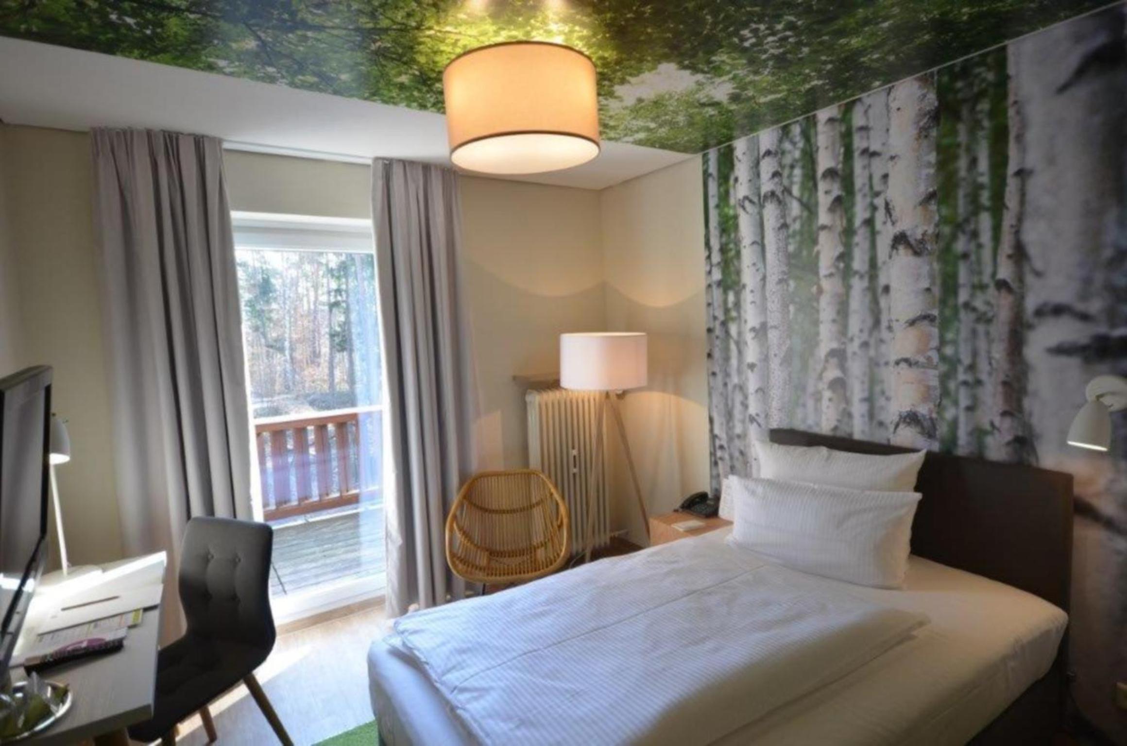 Ambiente des Zimmers, Waldmotiv, sehr ruhig, Buchung und spätes Einchecken sehr unkompliziert
