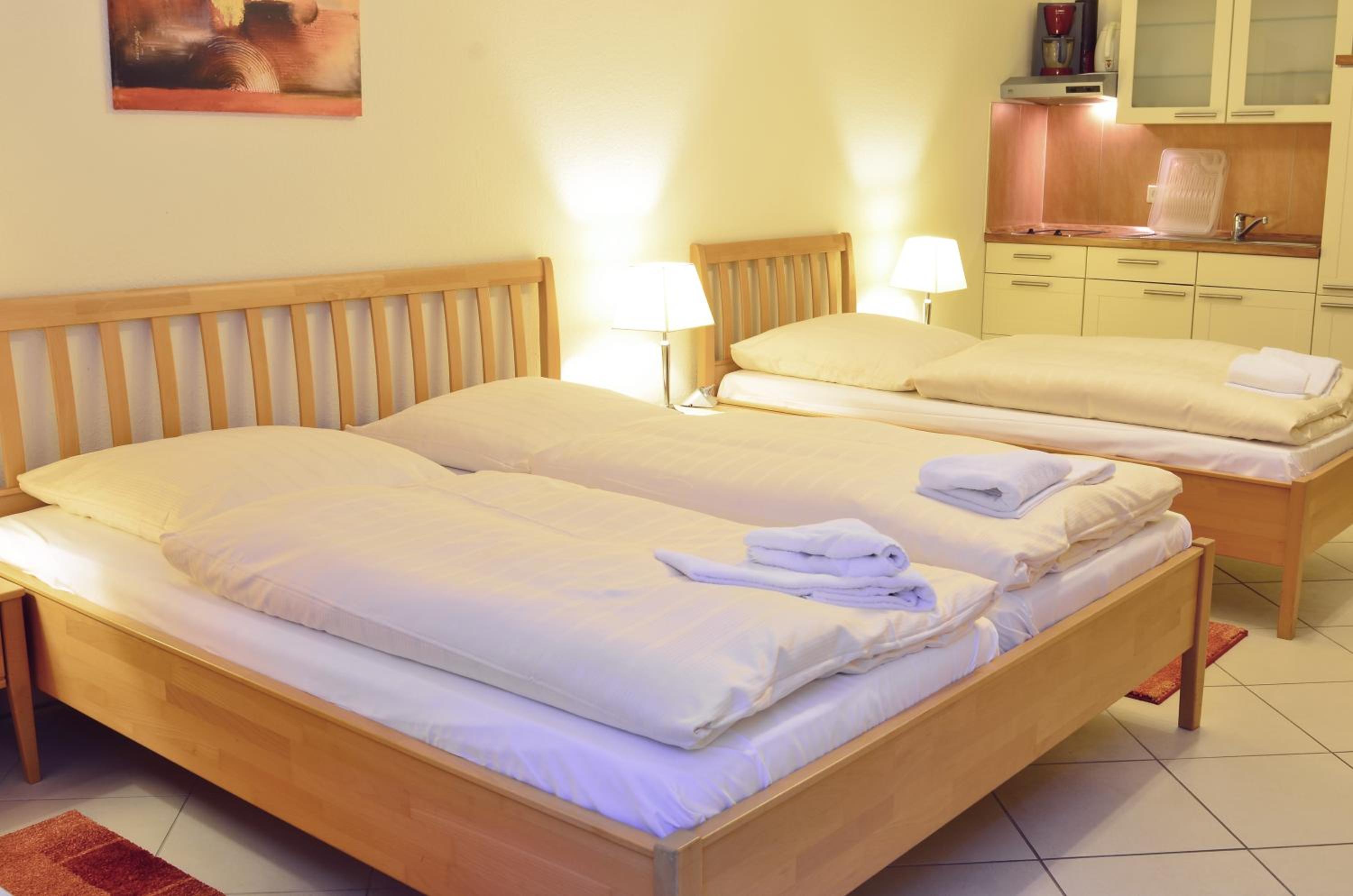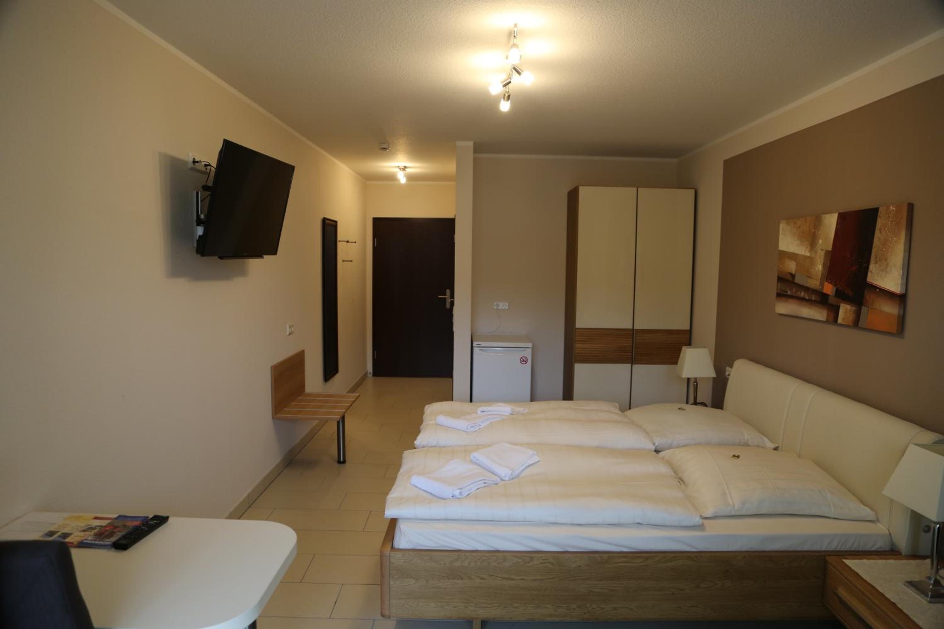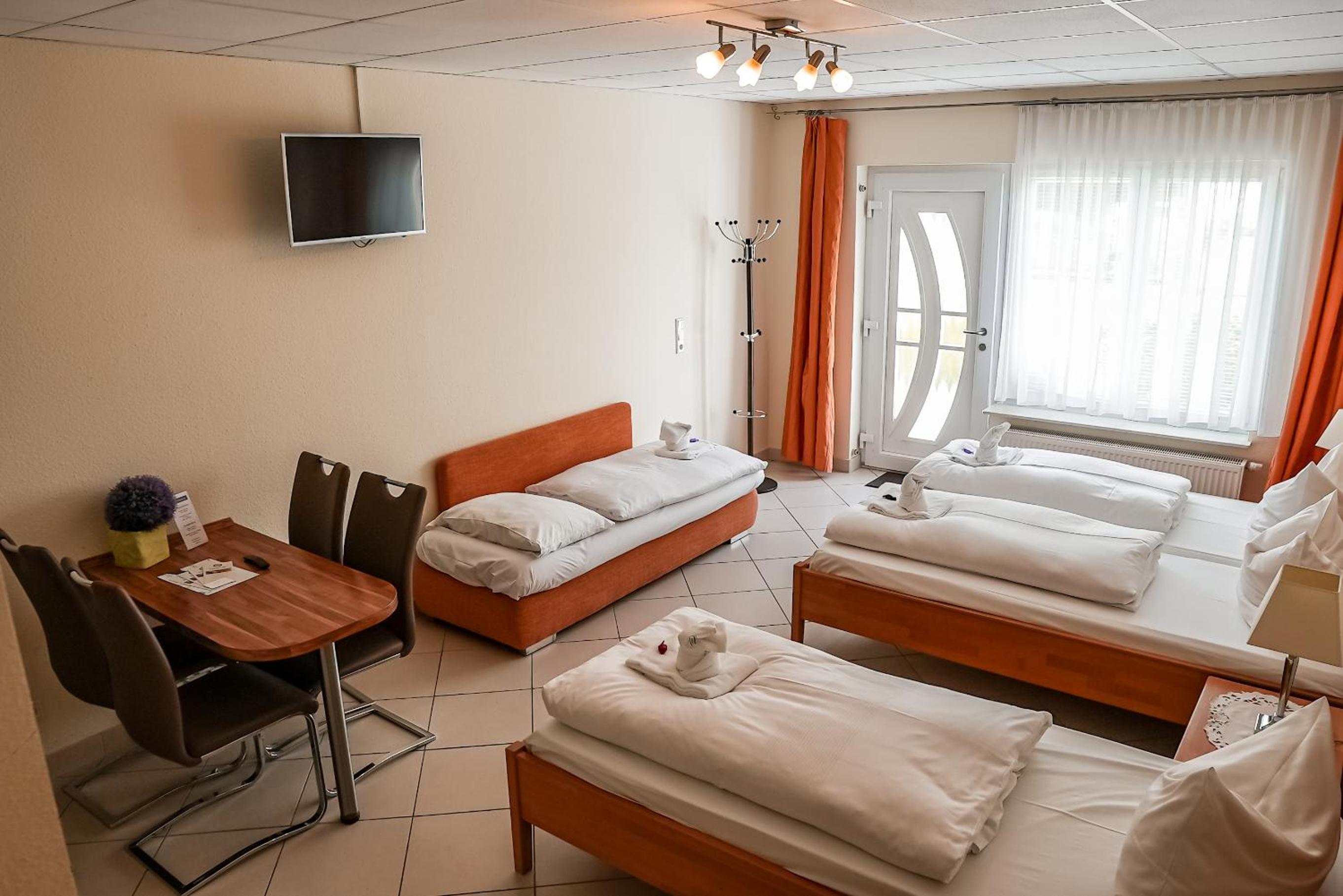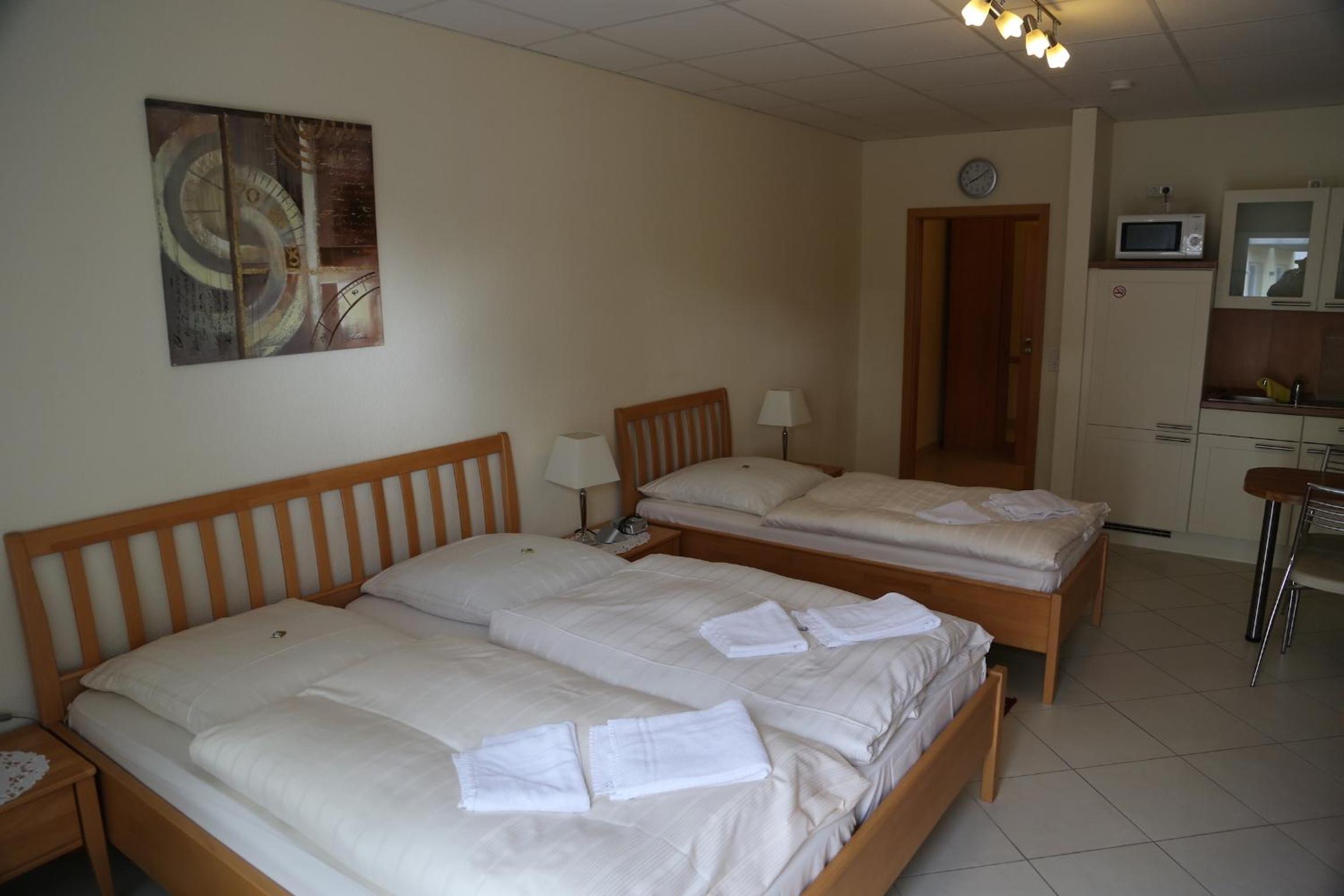 Sauberes, geräumiges Familienzimmer mit 4 Betten und kleiner Küchenzeile. Mit großem Parkplatz direkt vor der Tür.