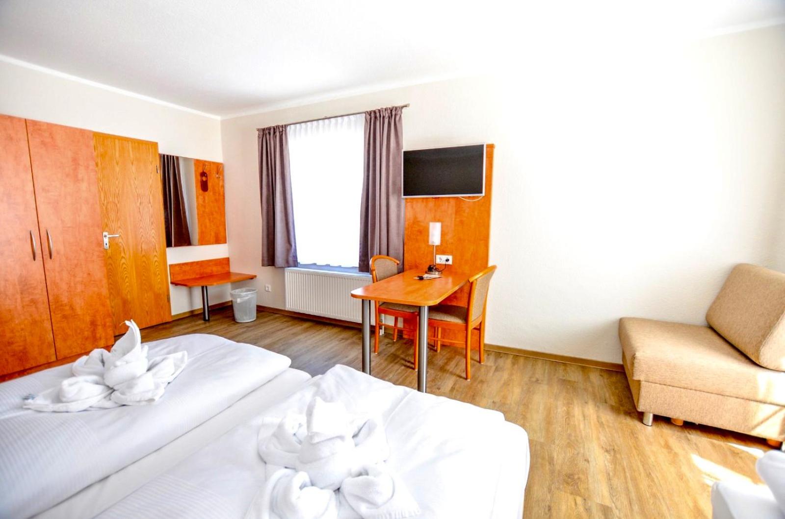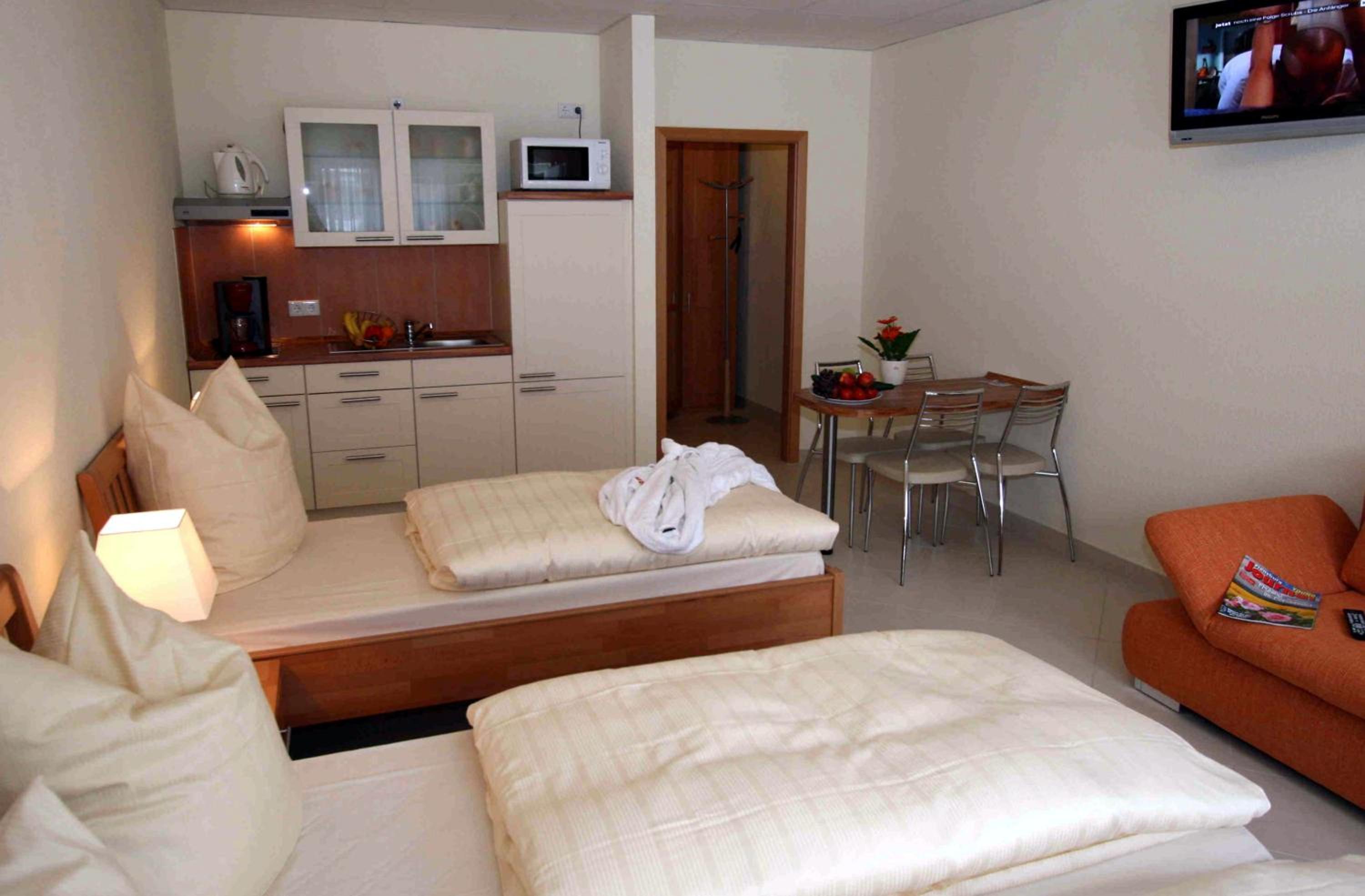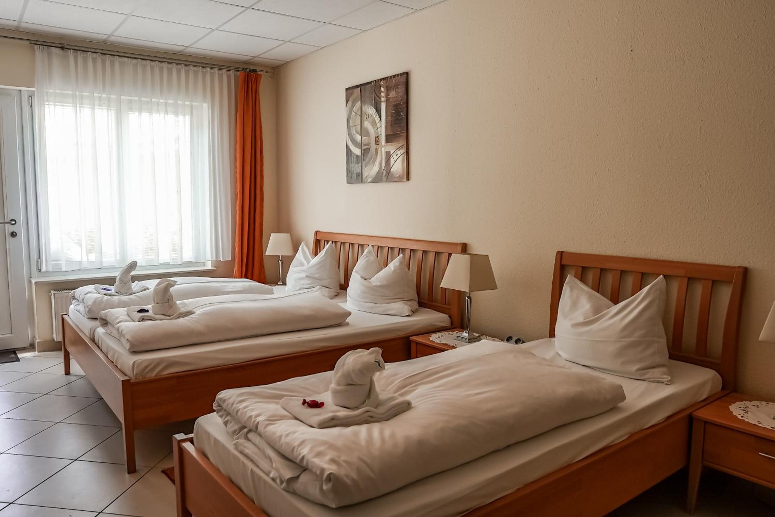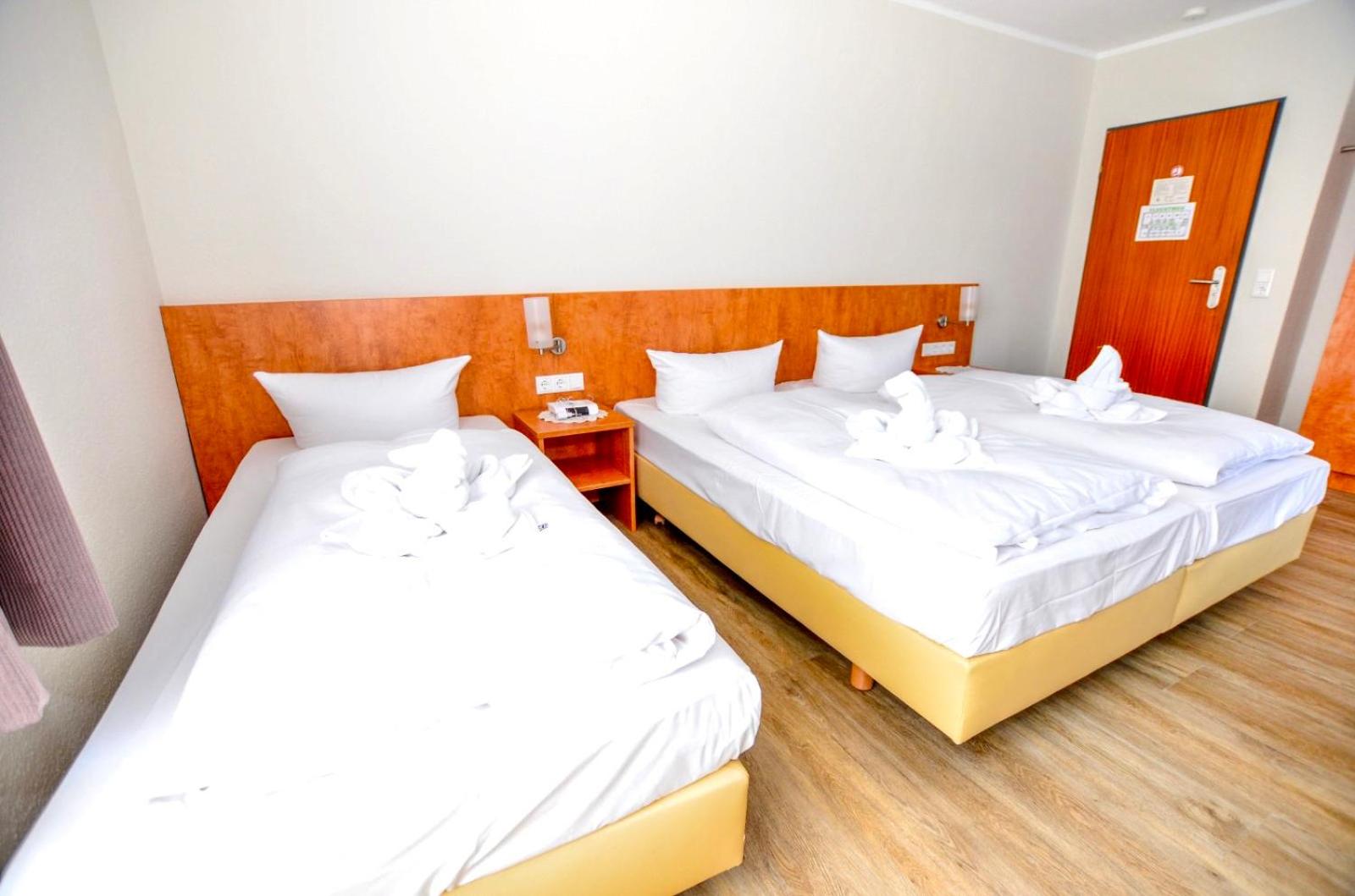 Sauberes, geräumiges Familienzimmer mit 4 Betten und kleiner Küchenzeile. Mit großem Parkplatz direkt vor der Tür.