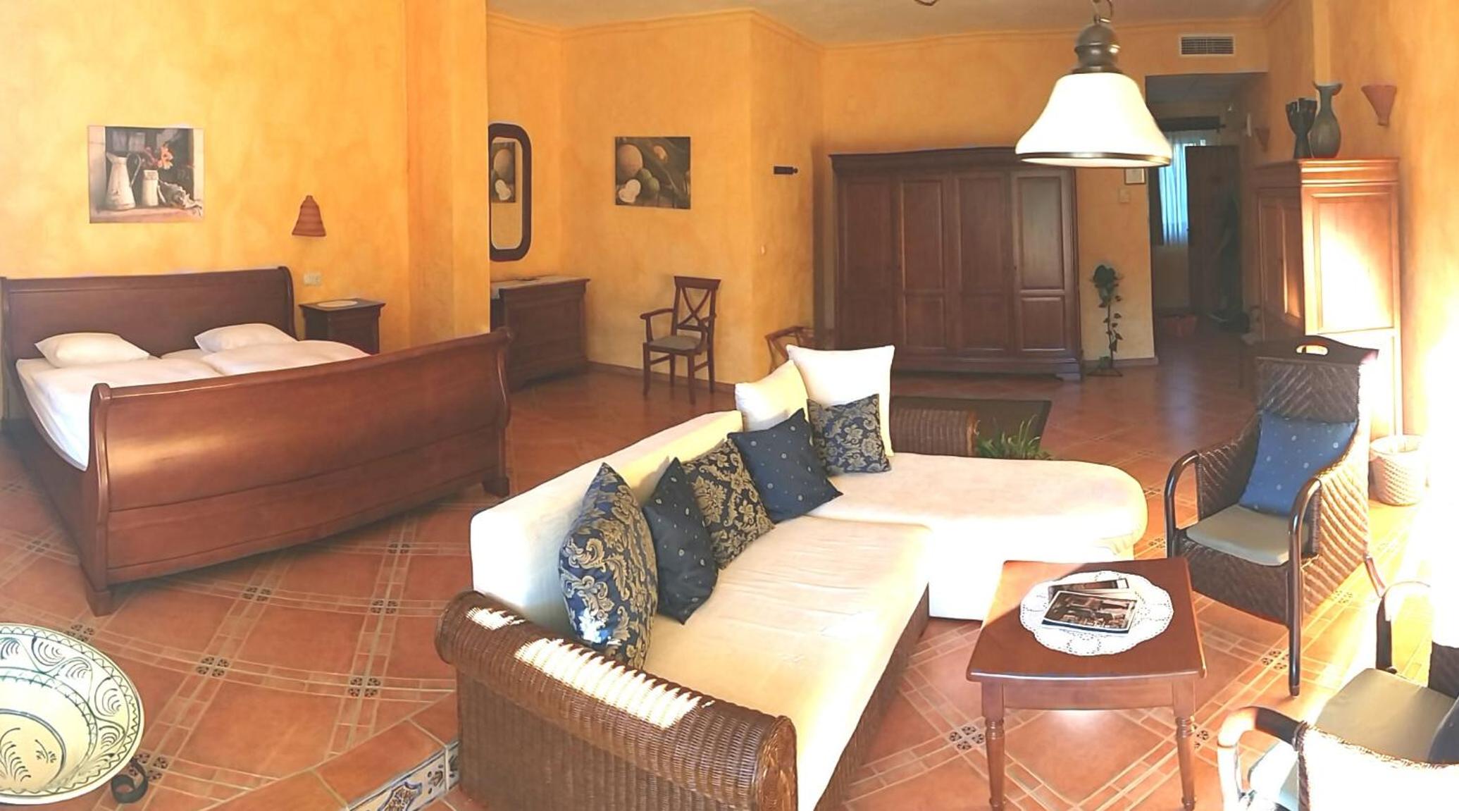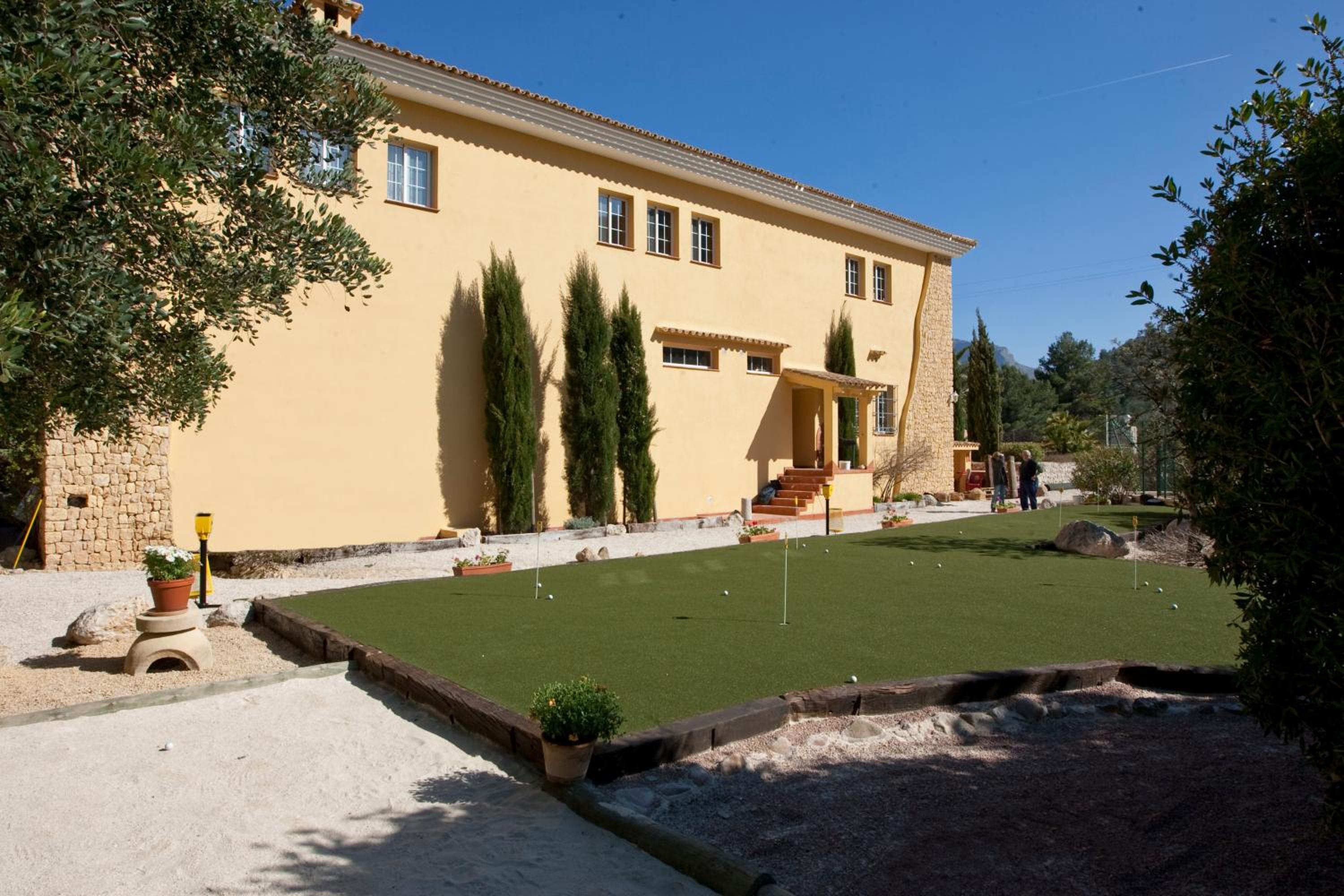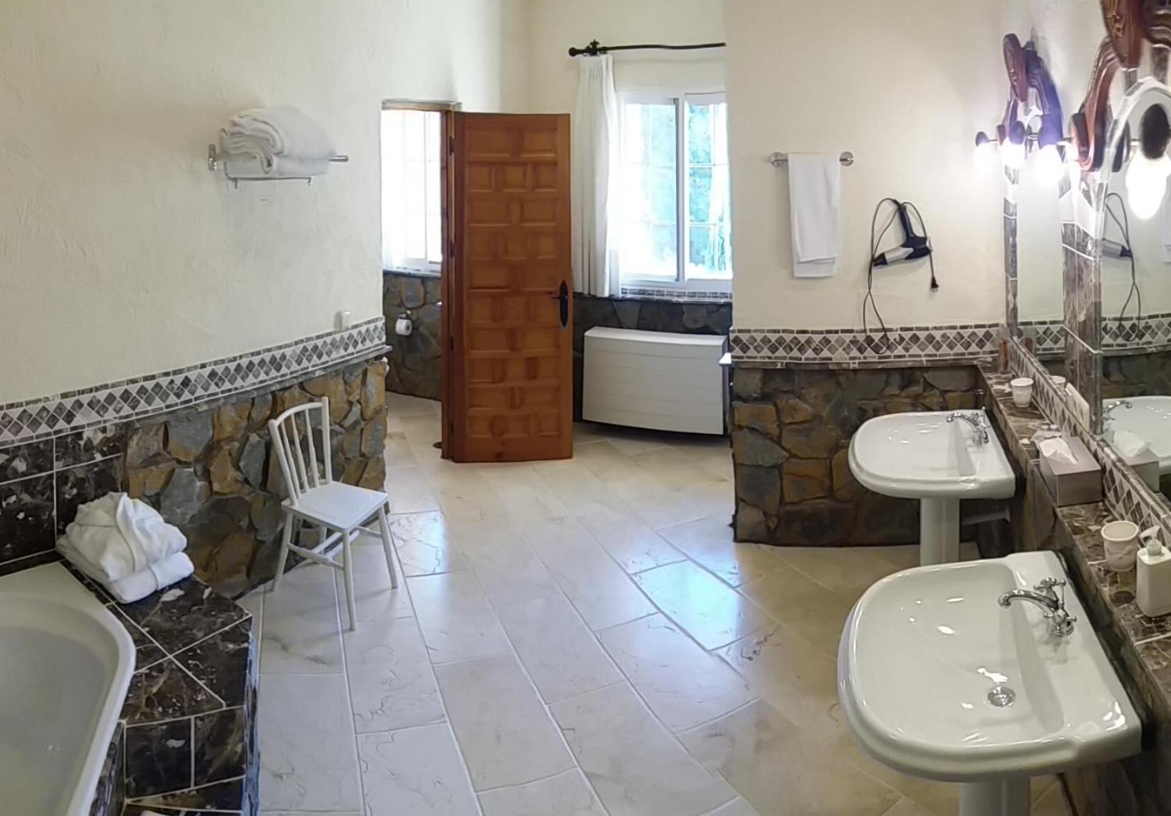 Llena de rincones donde poder sentarte y tomar un té, café o lo que te apetezca bajo un olivo, algarrobo o cualquier otro tipo de árbol . Diferentes entornos exteriores llenos de vegetación autóctona y multitud de espacios interiores donde , según la época del año, disfrutar de una piscina exterior fantástica , otra pero en este caso cubierta , sauna, gimnasio y varios salones , con chimenea , con barra de bar, etc. Todo ello regentado por una pareja encantadora y profesional .