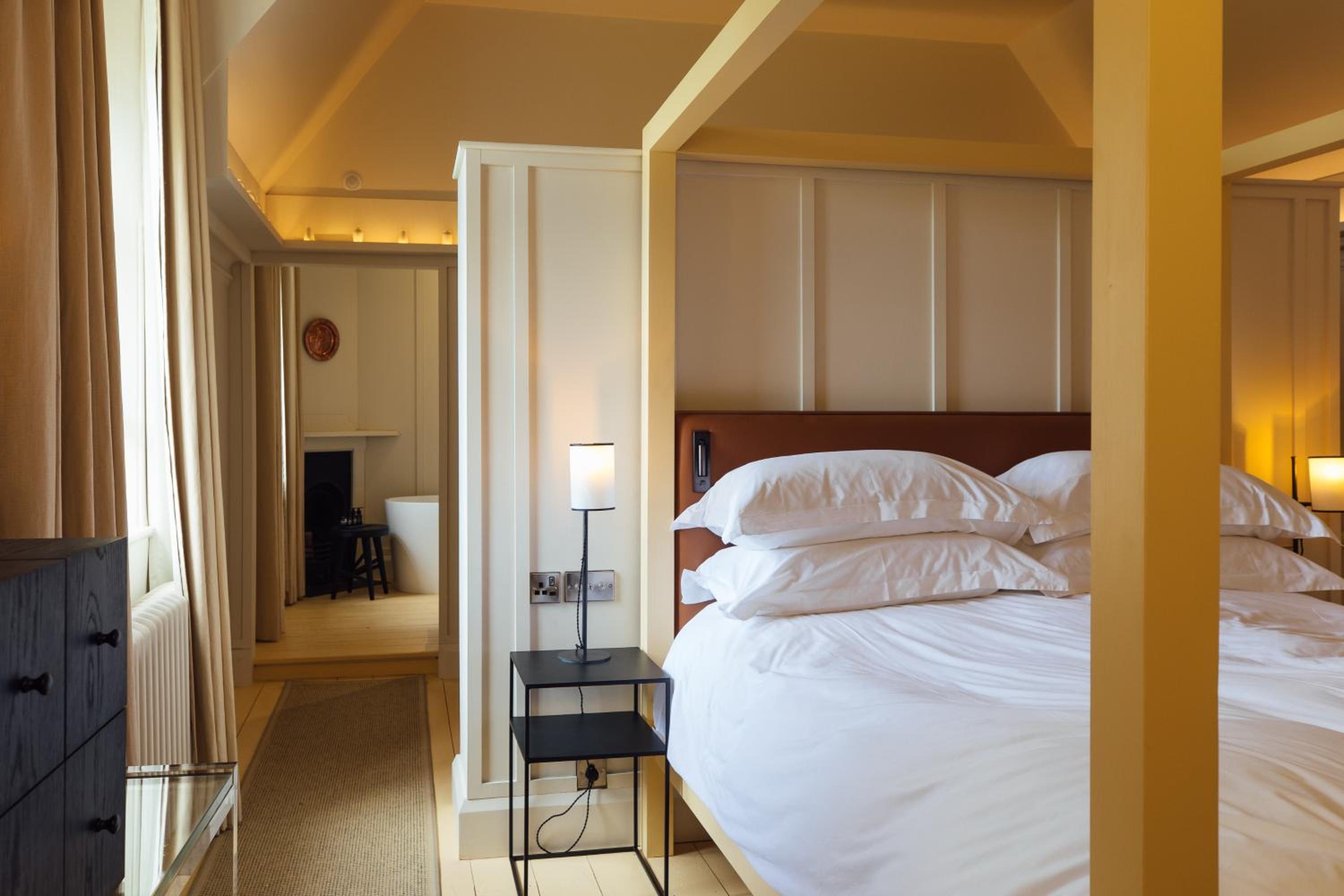 The Grove offers elegantly decorated bedrooms with ornate fireplaces and modern art, along with spacious bathrooms featuring deep iron baths, under-floor heating, and designer toiletries. Each room includes modern amenities like a flat-screen TV and free wired internet. In-room massages can also be arranged for ultimate relaxation.