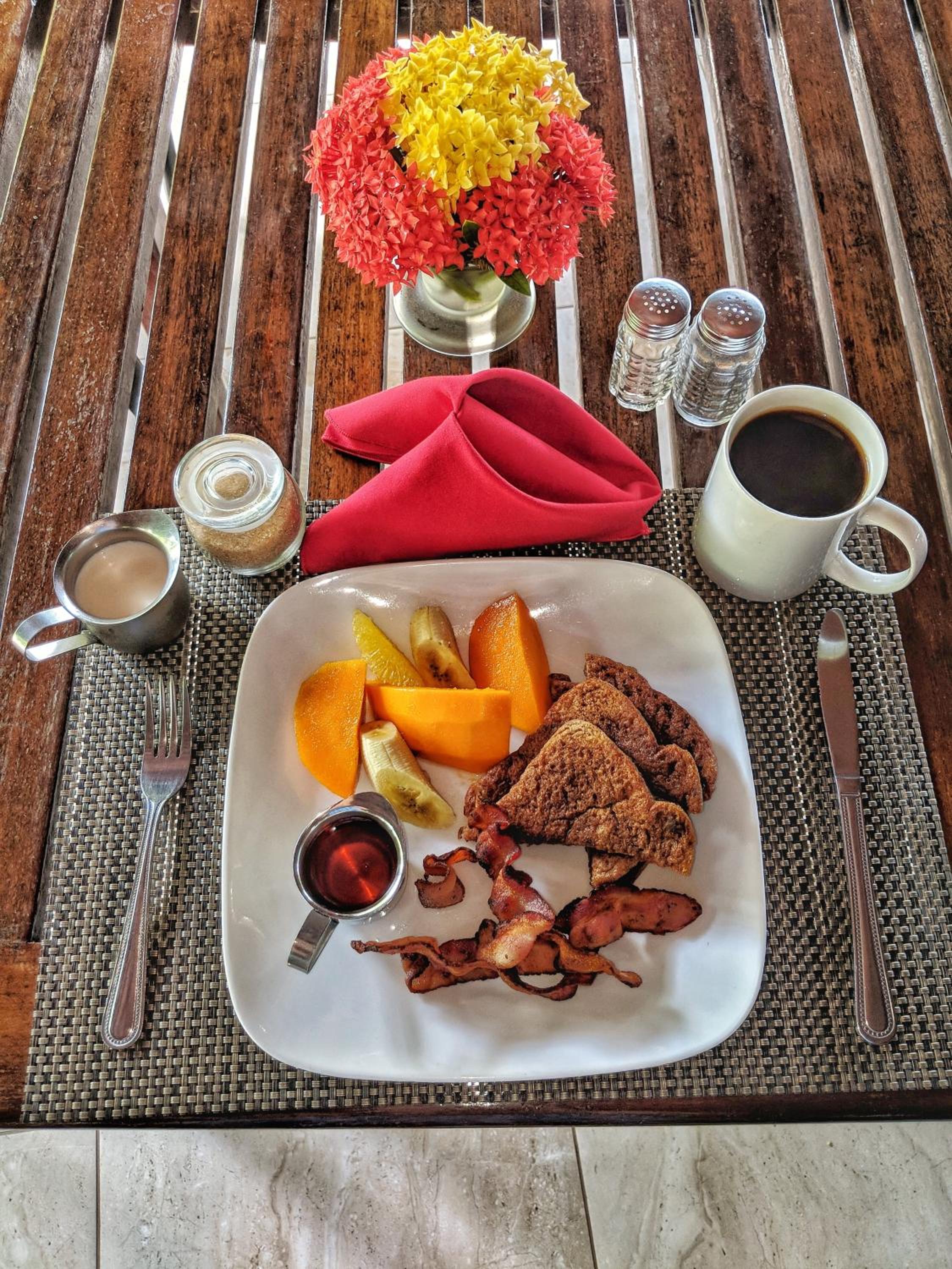 Frühstück wurde als Auswahl verschiedener Varianten angeboten und als Portion serviert. Kaffee oder Tee konnte nachbestellt werden und Extras wie z.B. Bacon gegen Aufpreis dazugestellt werden. Portionen waren ausreichend.