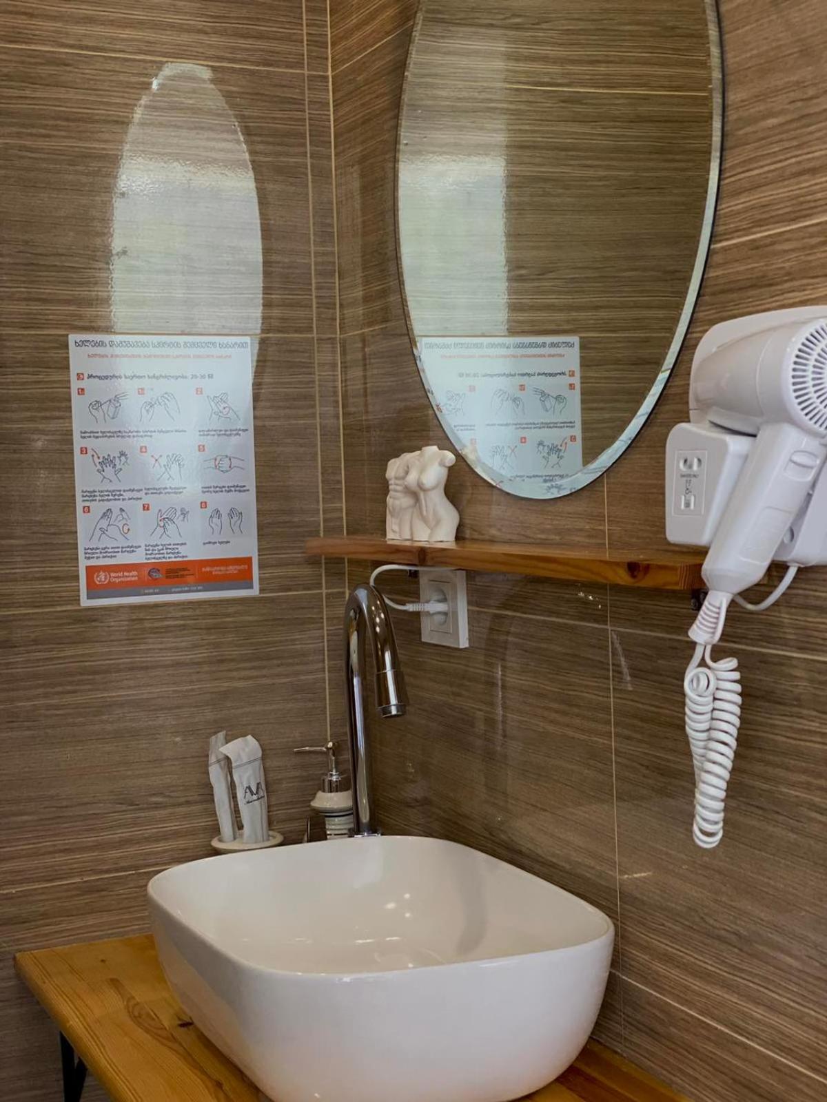 Die Inhaberin ist nur auf „Lari“ fixiert. Wir hatten bereits die Anzahlung von 50% überwiesen und parallel dazu hat das Hotel die anderen 50% des Hotelpreises von meiner Kreditkarte eingezogen, so dass das Hotel bei unserer Anreise komplett bezahlt war. Die Inhaberin fuchtelte mit einem Blatt Papier vor uns herum und sagte:“Lari und dann Schlüssel“. Da ich gehbehindert bin und nicht so lange stehen konnte, musste ich mich dann auf die Treppe setzen. Obwohl wir alle Überweisungsbelege und Abbungsbelege mit hatten und vorlegten, dauerte es über 20 min. bis unser deutsprachiger georgischer Fahrer und meine Frau die Zimmerschlüssel erhielten und die Frau begriffen hatte, dass sie bereits das gesamte Geld erhalten hatte. Das war die Begrüßung. Danach haben wir uns ins Restaurant begeben und fragte, ob wir 2x Ostri bekommen könnten. Die Inhaberin bejahte unsere Frage und meinte es dauert aber etwas. Nach ca. 1 Stunde bekamen wir dann unseren Ostri, frisch aus dem Gefrierfach, so hat er auch geschmeckt! Das Frühstück war mäßig.