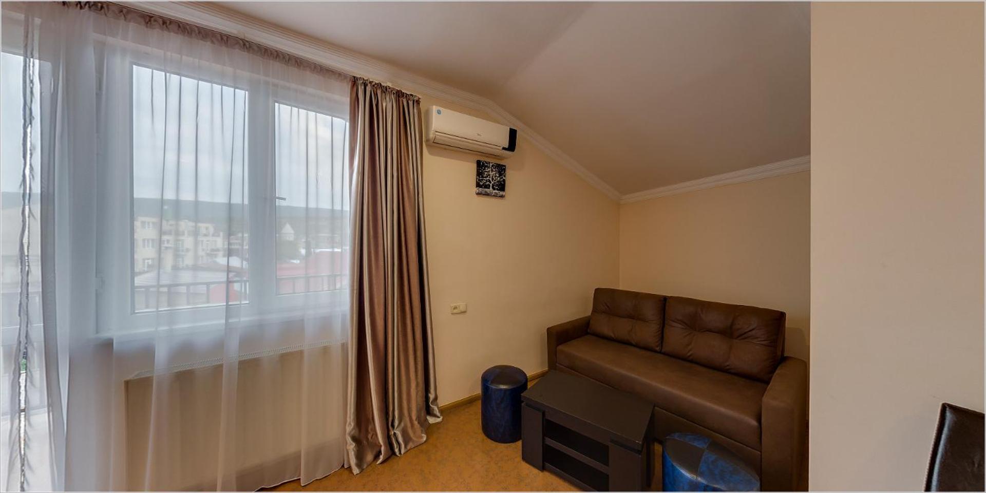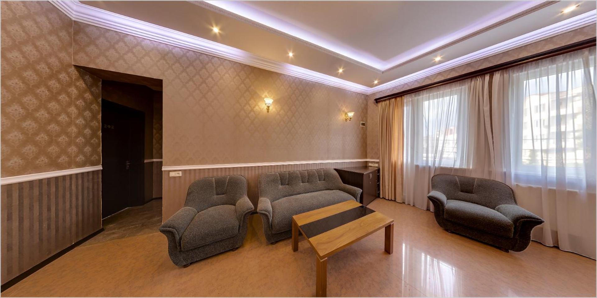 Hotel Avlabari in Tbilisi offers elegantly designed rooms with modern amenities such as free WiFi, air conditioning, and private bathrooms. Each room features a comfortable sofa, a TV, and a balcony overlooking the city, providing a perfect setting for relaxation.