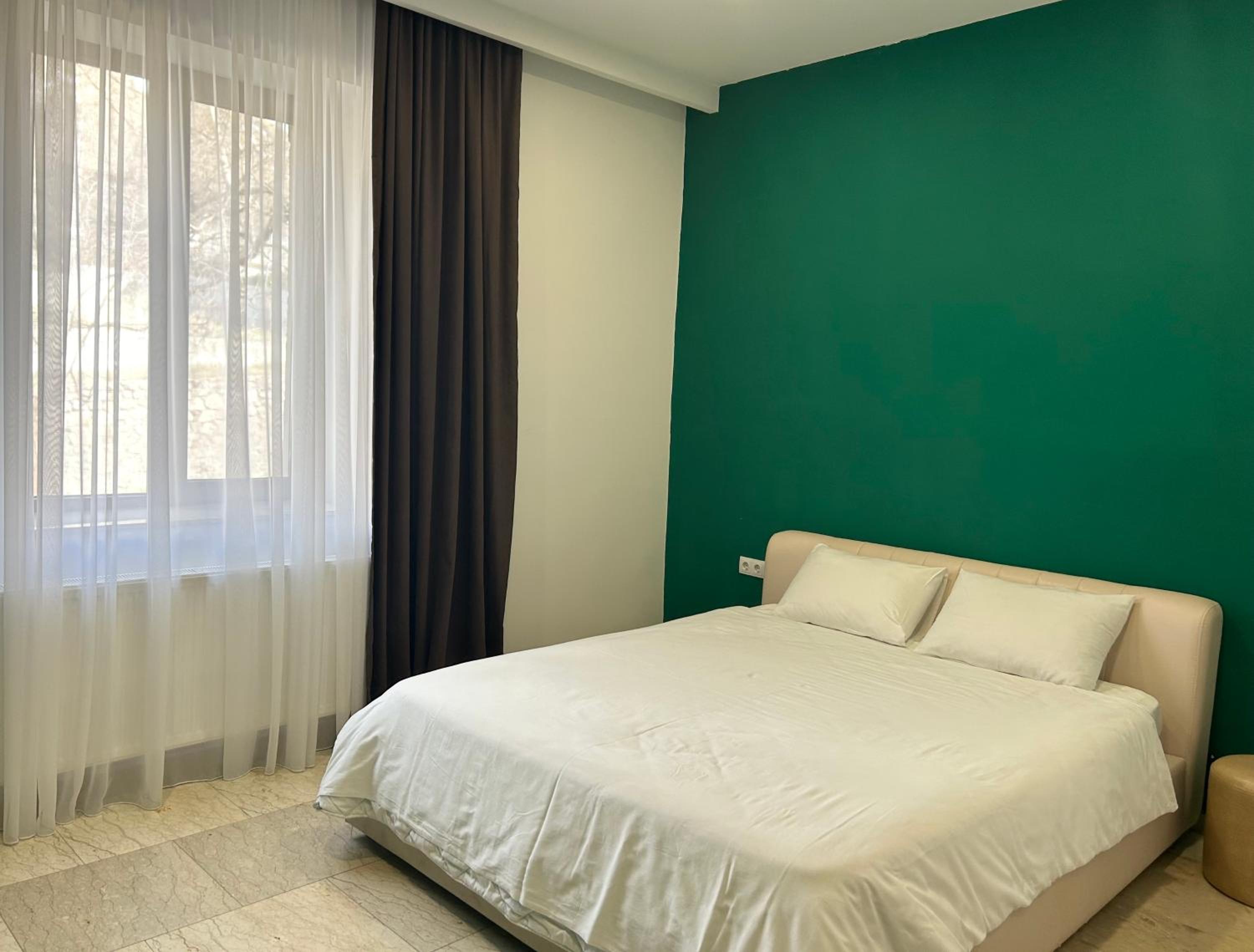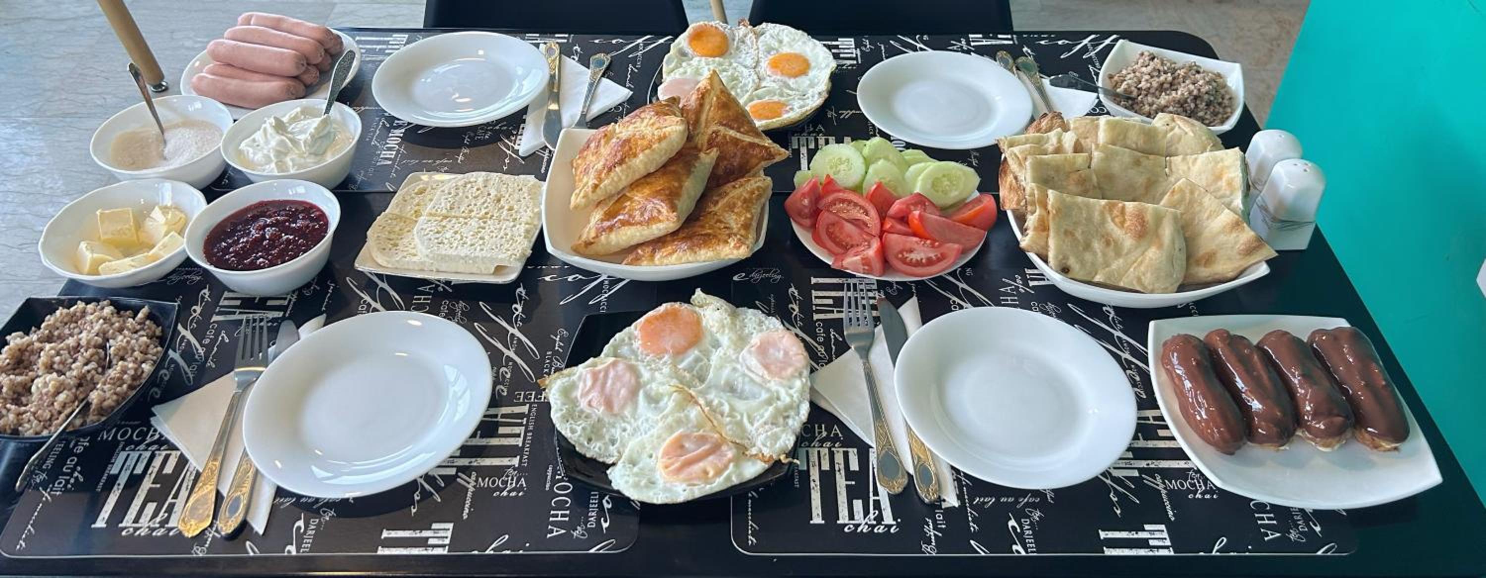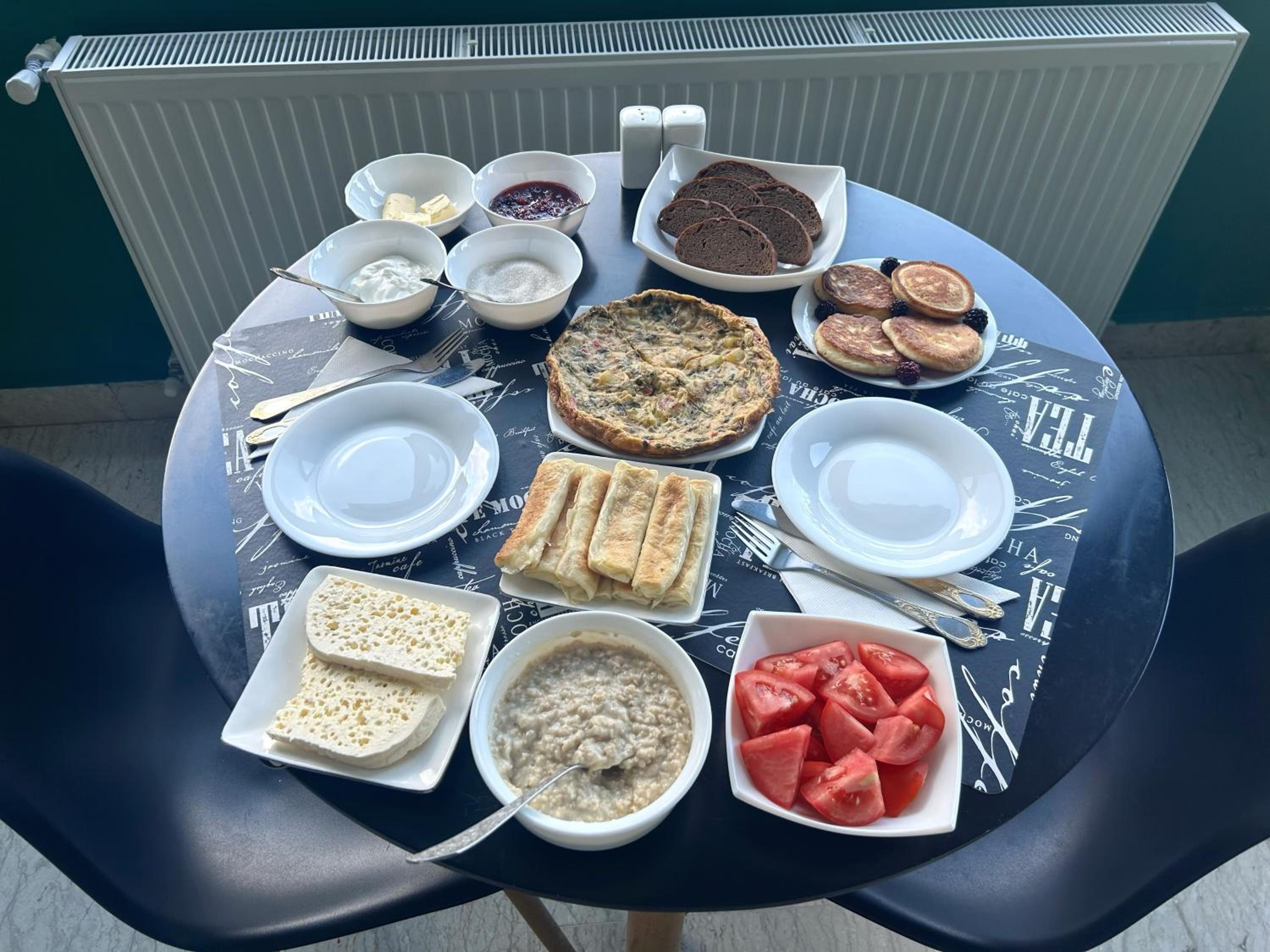 Очень хороший завтрак с красивым видом. Удобные кровати, хорошо выспались. Доброжелательная хозяйка, готовая помочь. Парковка на улице возле отеля, этот номер с видом на другие горы, не Казбек, холодильника нет