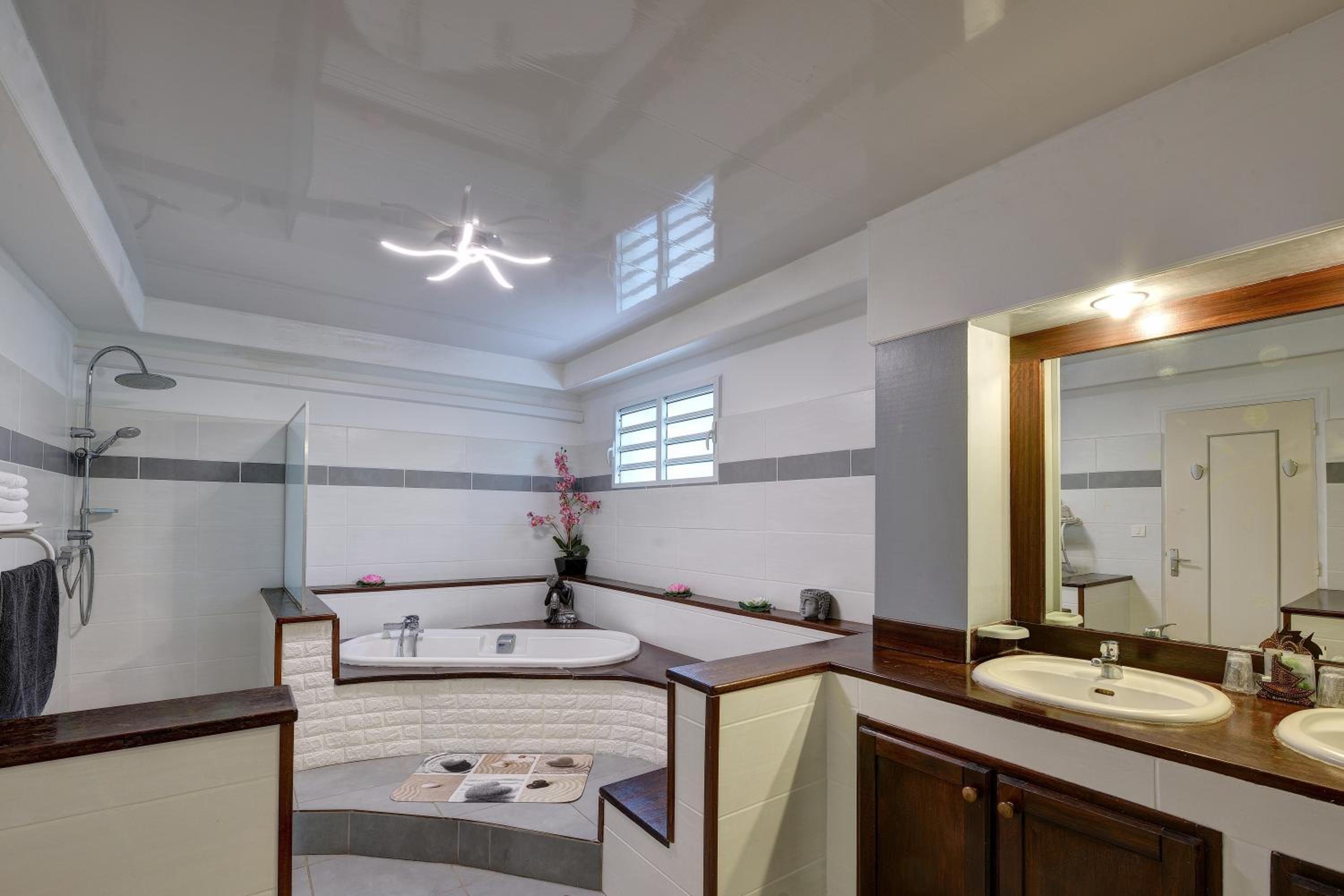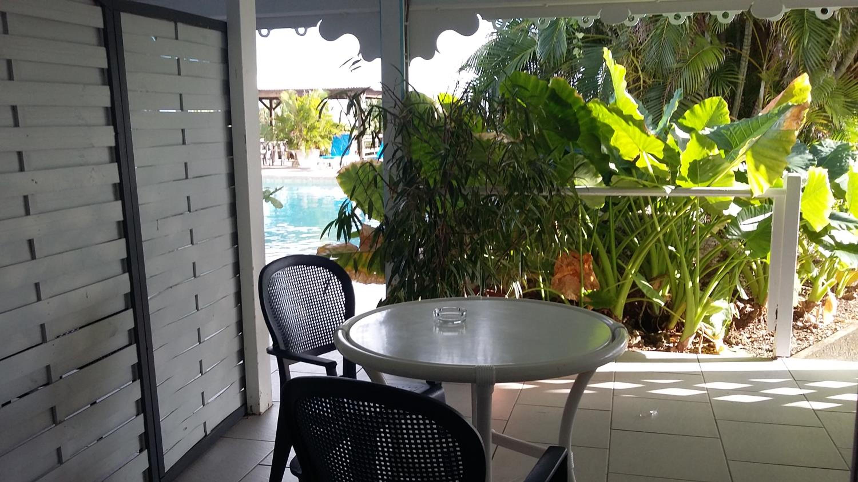 Chambre spacieuse avec petite terrasse privative donnant sur la piscine. Salle de bains spacieuse avec douche et baignoire. Piscine avec belle végétation.