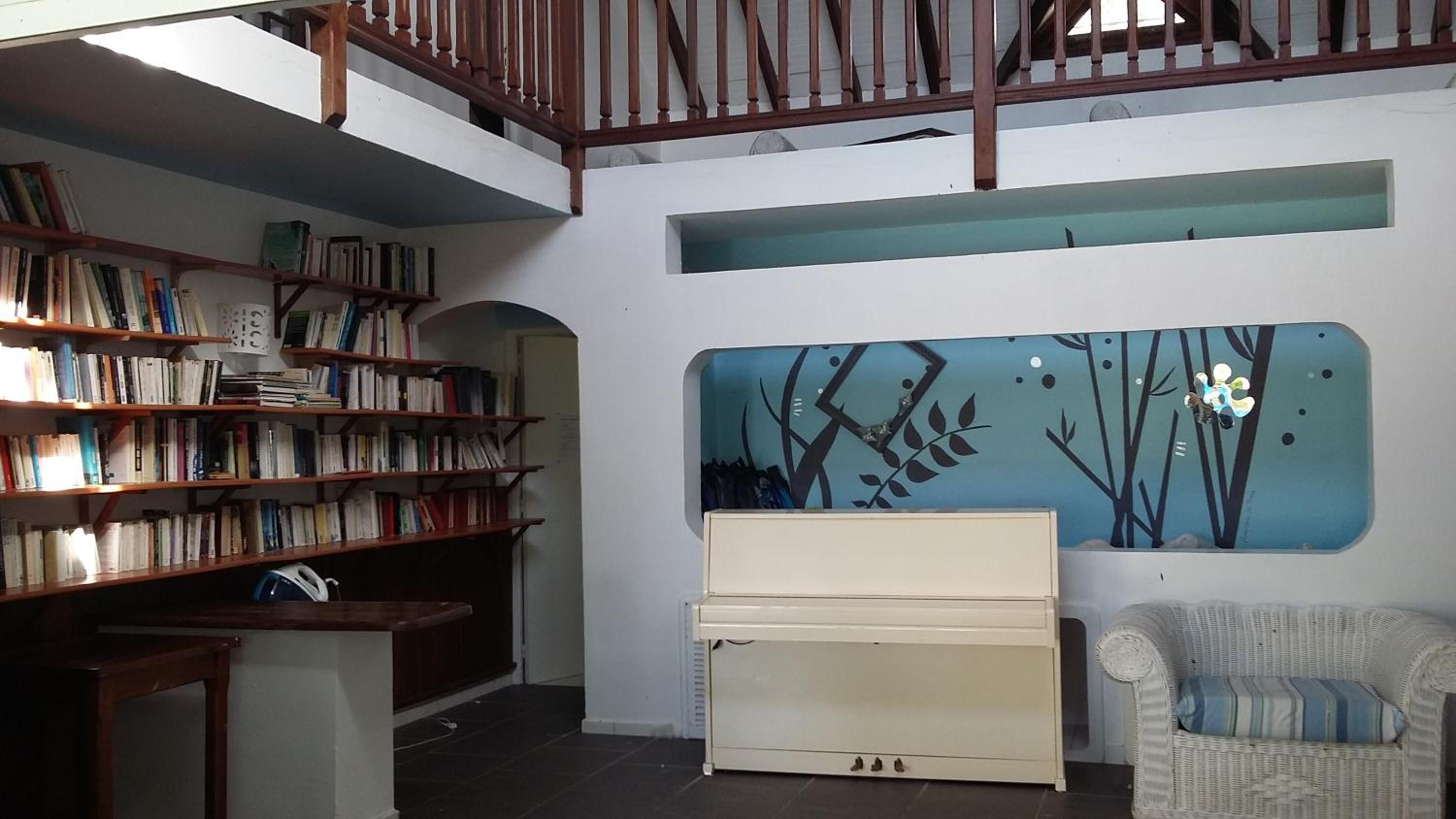 Le coin salon, la bibliothèque, la fontaine d’eau fraiche