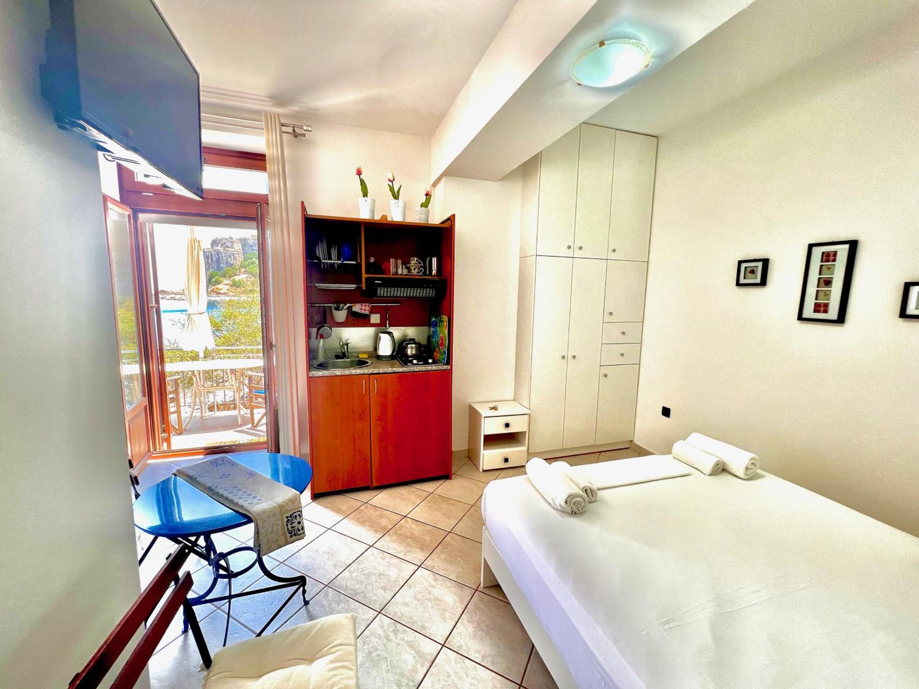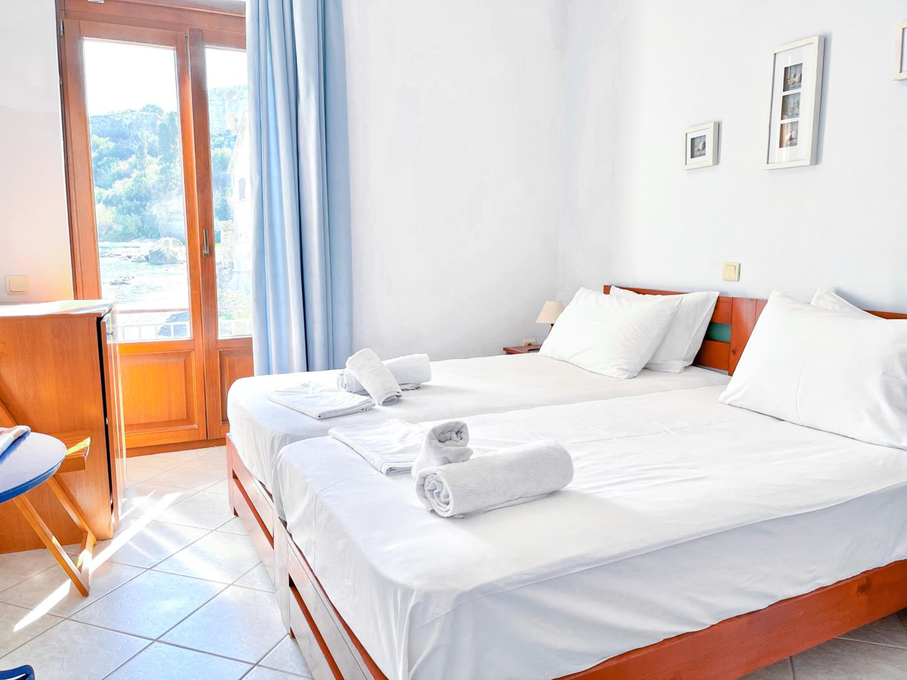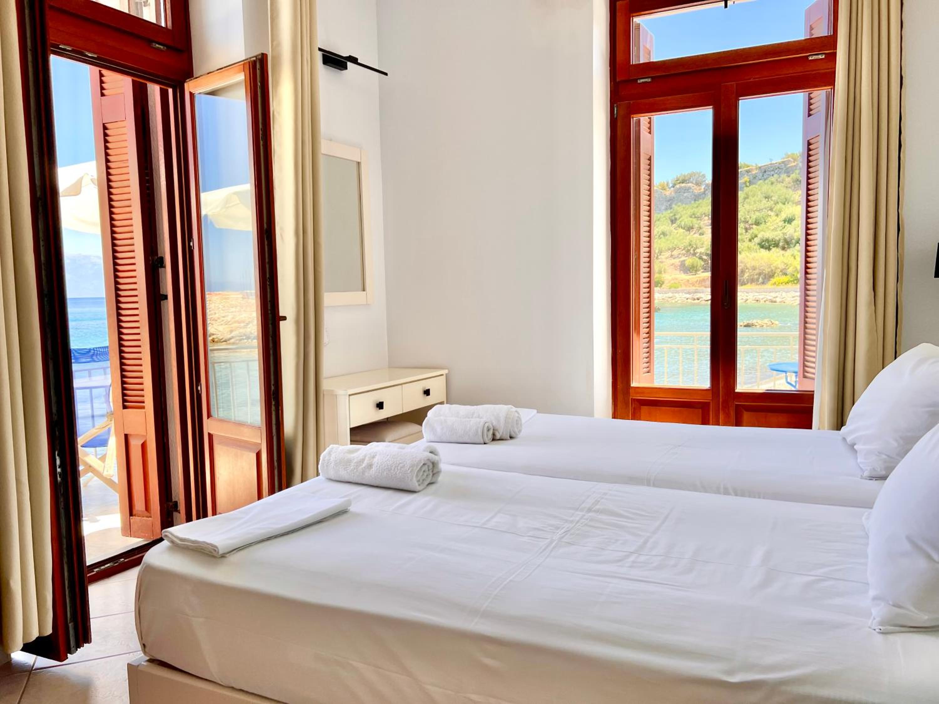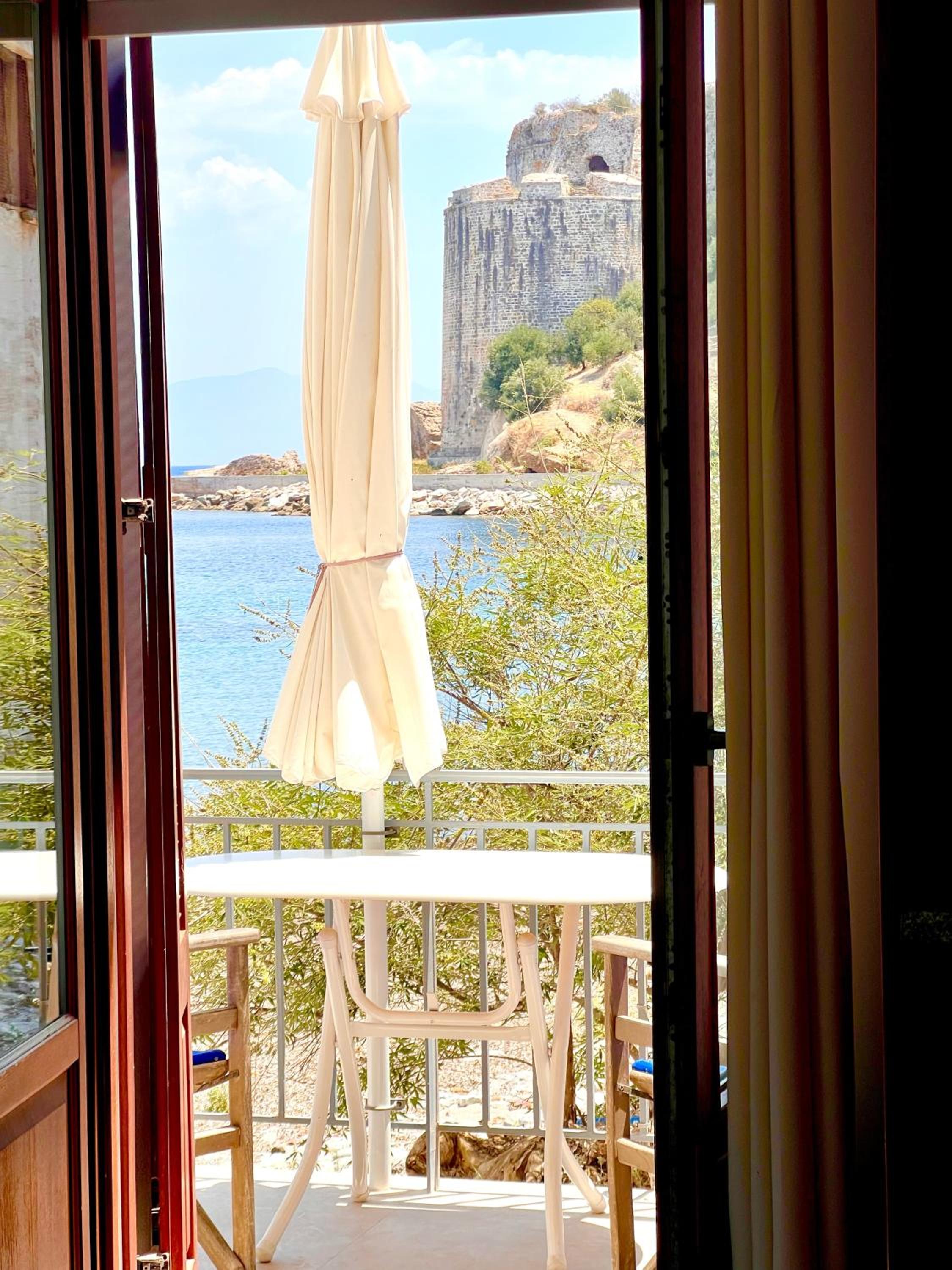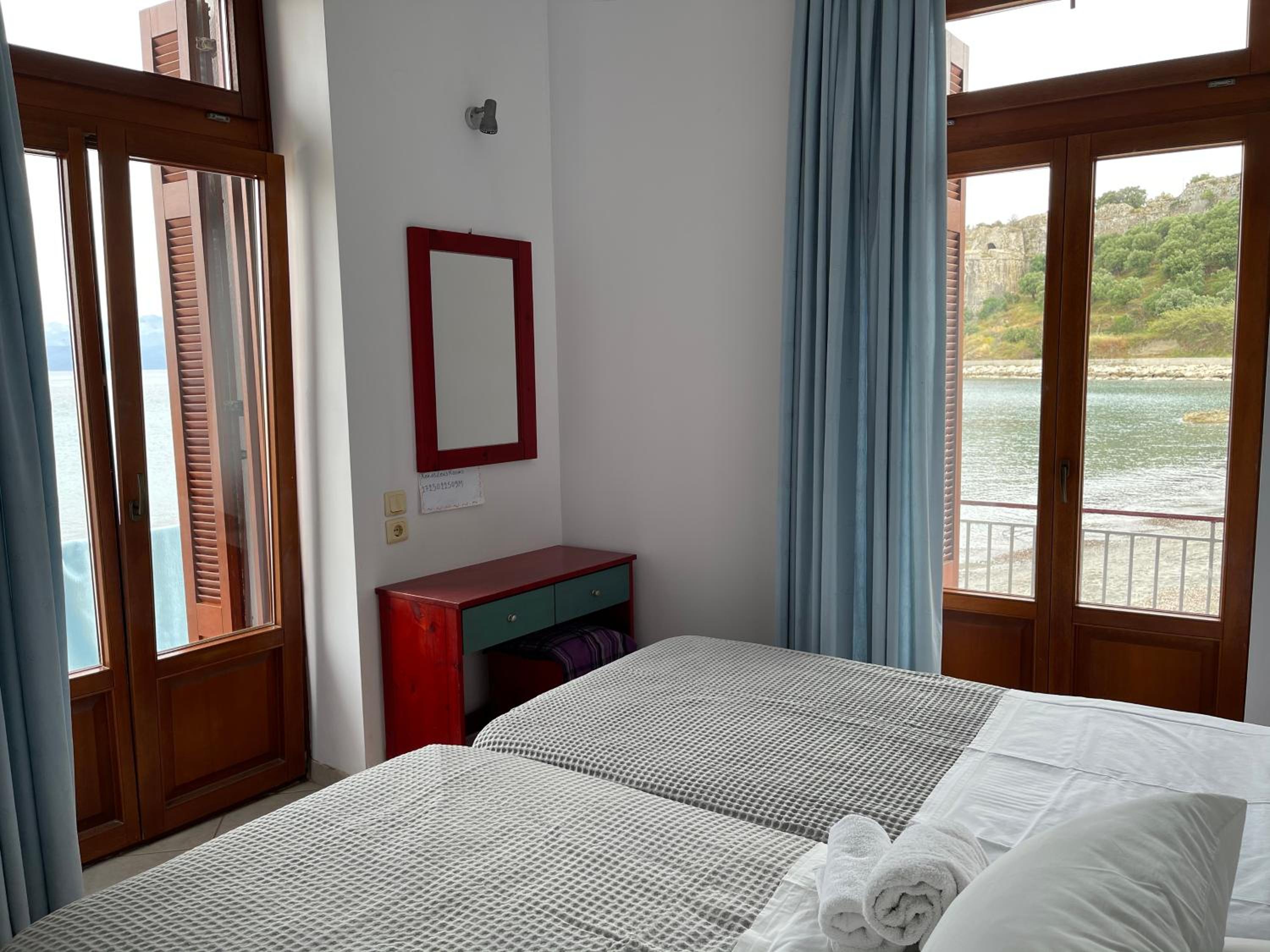 Location was fab and my room had a wrap around balconyliterally 2 ft from beach - could hear the lapping waves all night - clean and bright and fab bathroom couldn’t fault it at all- right net to the bet restaurant in Koroni beginning of harbour pathway - what not to like ??