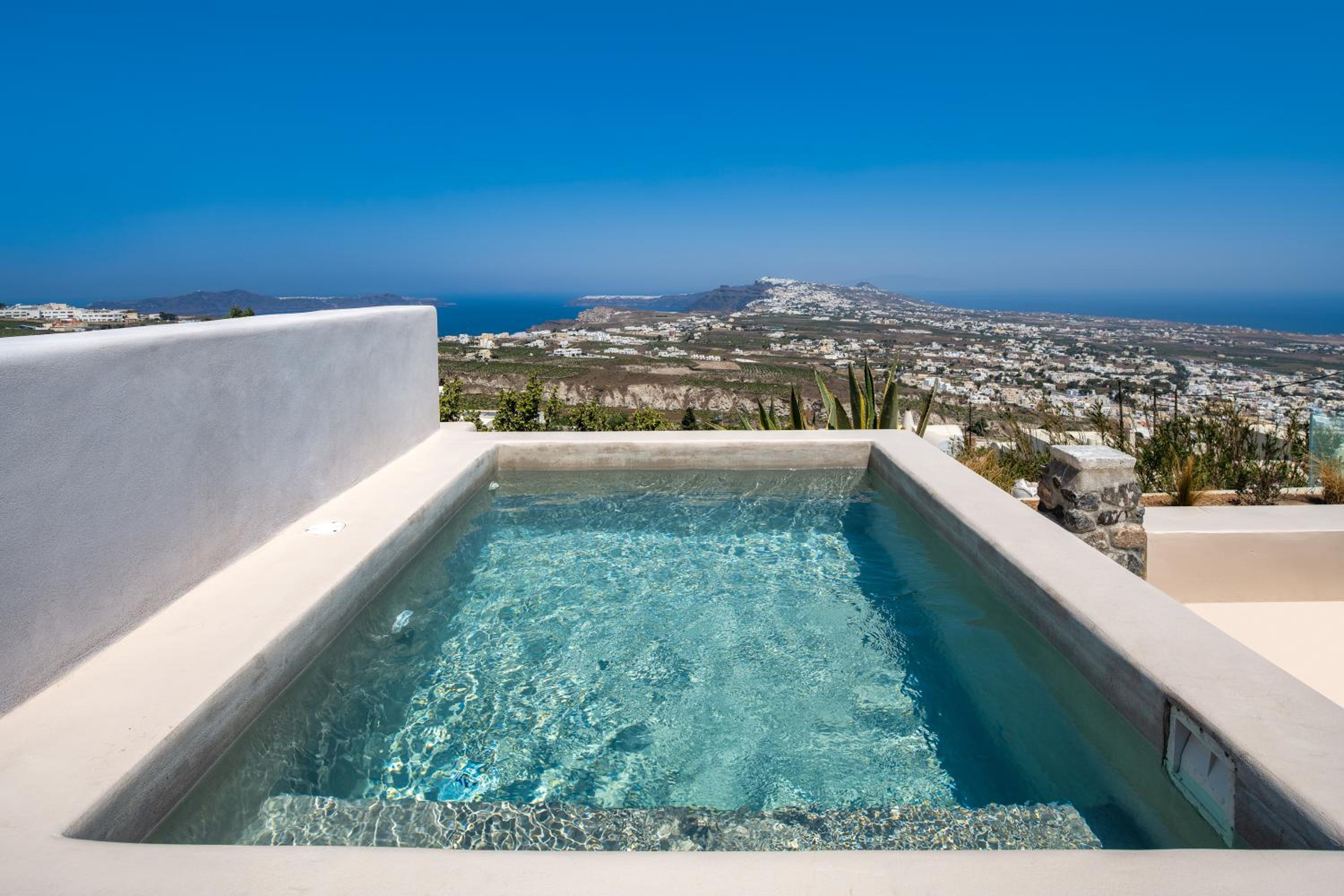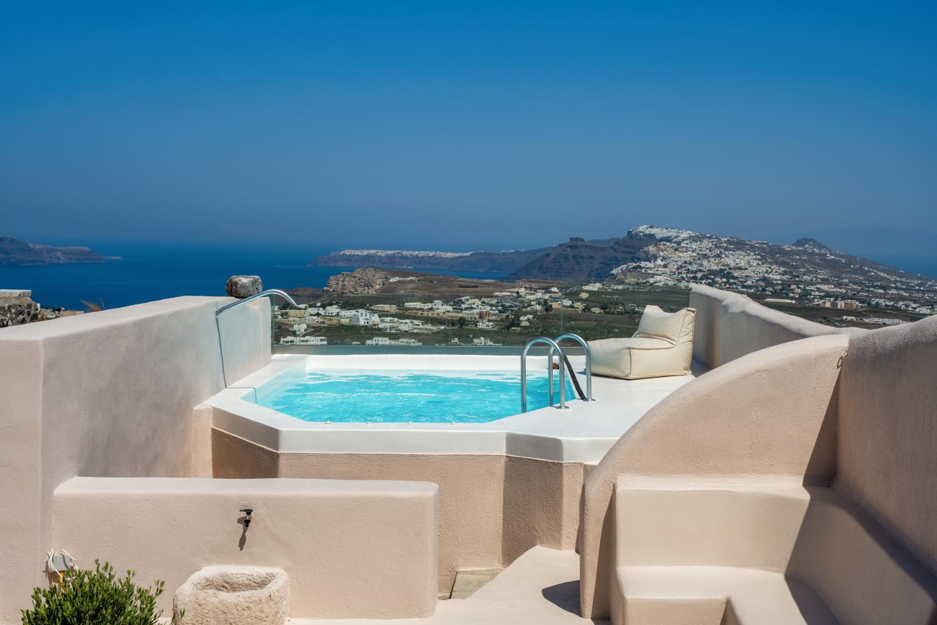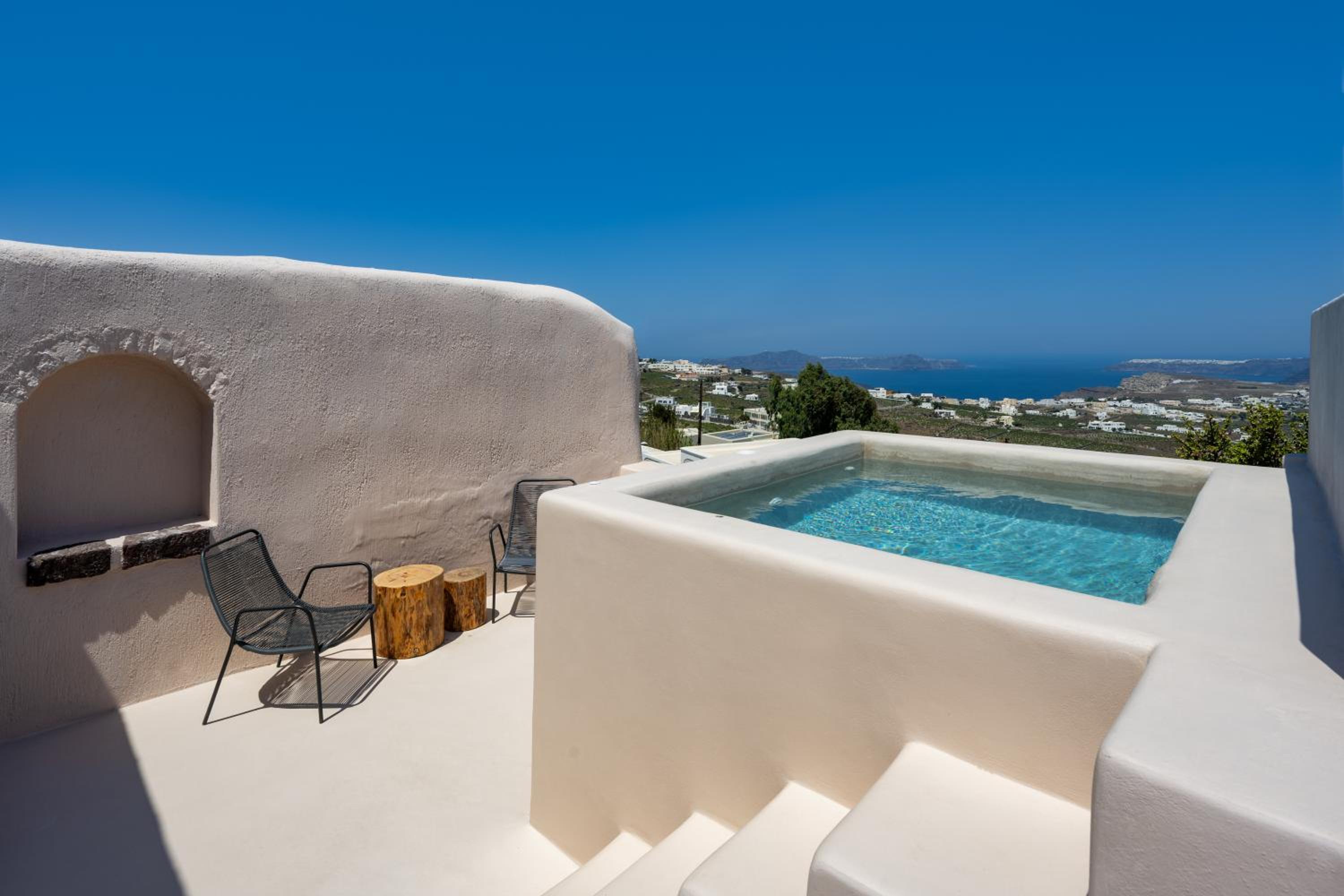 Experience stunning sea, Caldera, and volcano views from the comfort of your private balcony at Phaos 1870, a beautifully restored Winery in Pirgos.