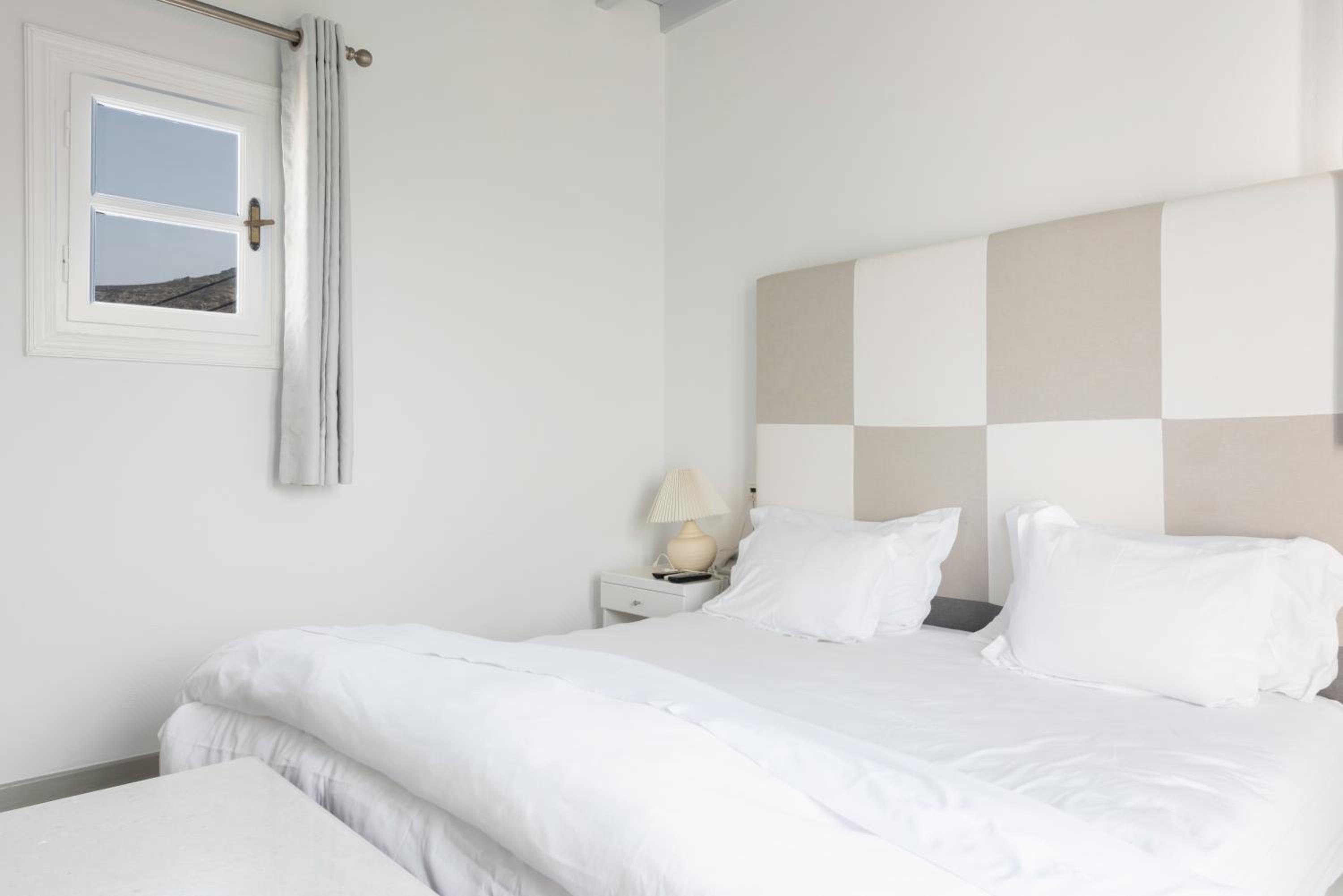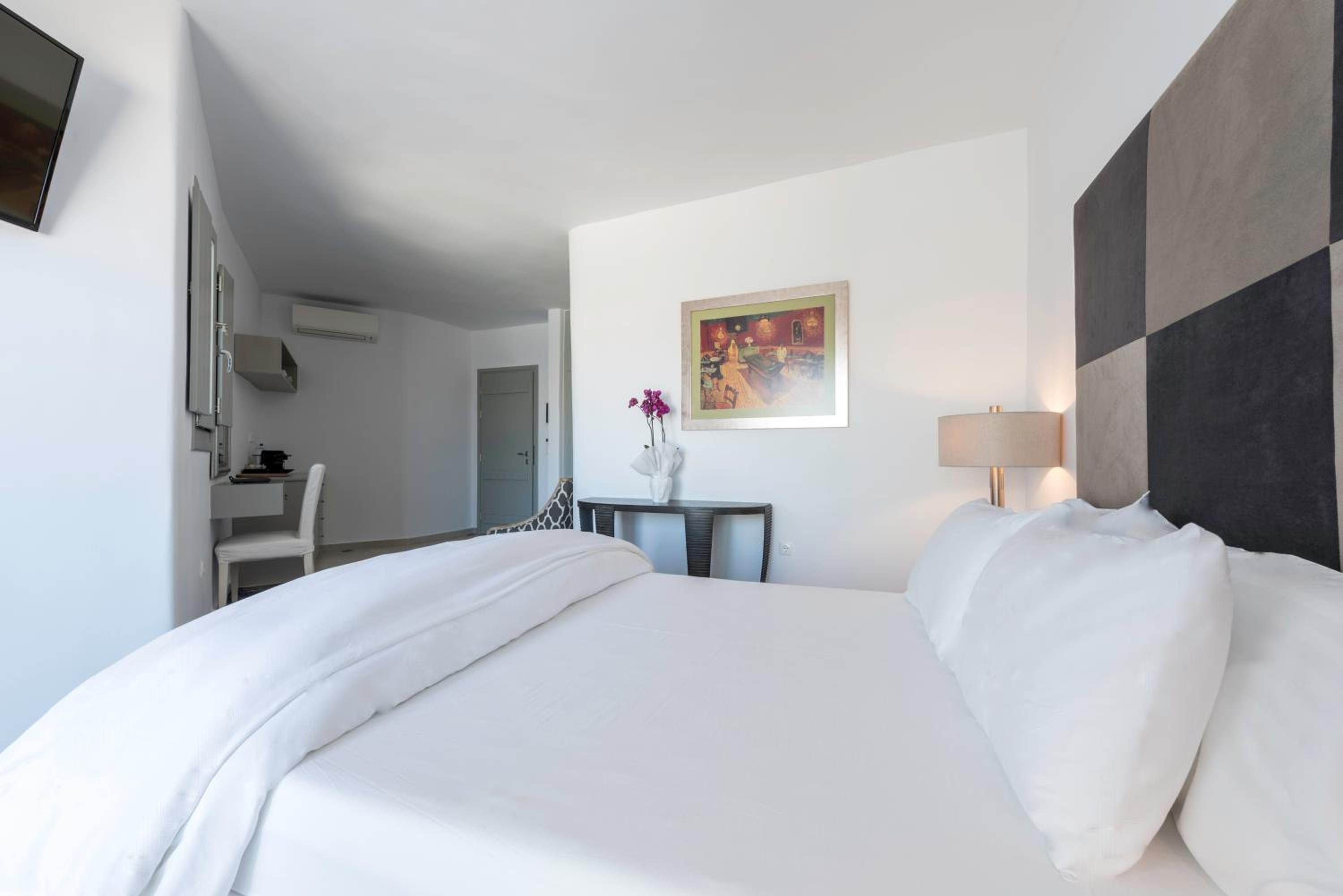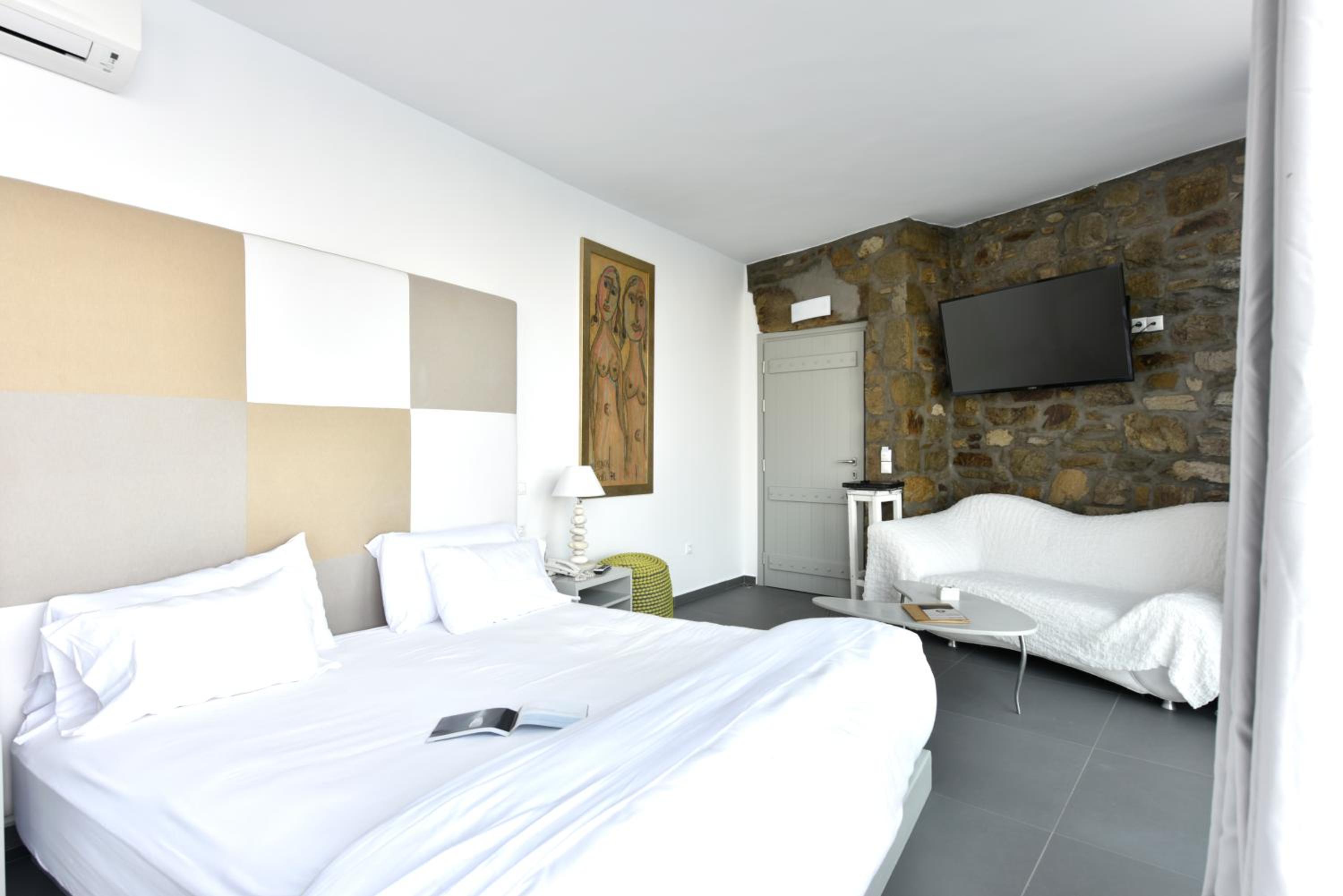 The room we were first given had a v-shaped sunken mattress with a dirty cover, the staff changed the cover but could not change us to another room for the first night as the manager had already left for that day, it was very dissapointing, we couldnt rest at all that night. However next day the manager was very kind and apologetic and changed us to a lovely room with breathtaking views, which saved our Mykonos experience.
