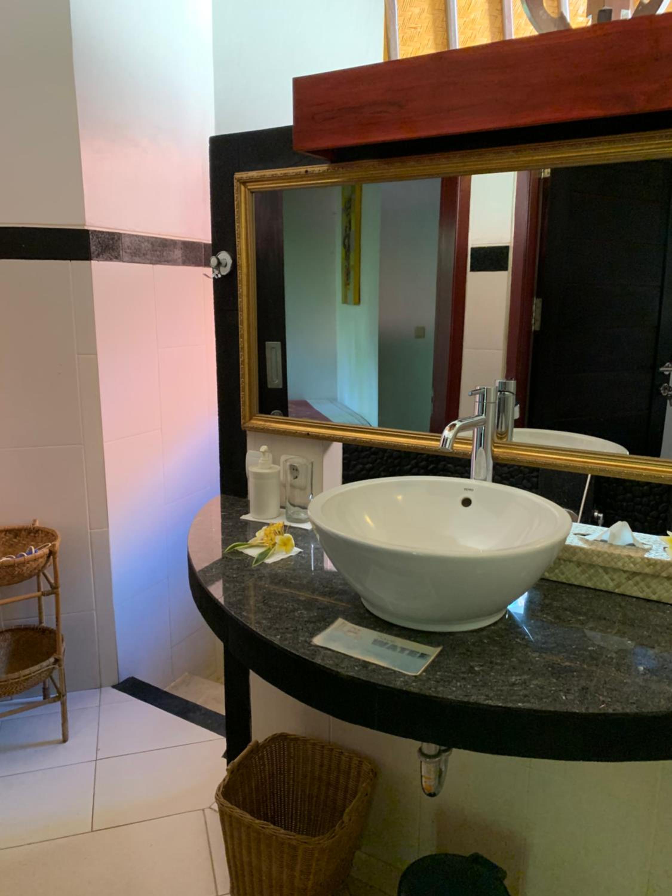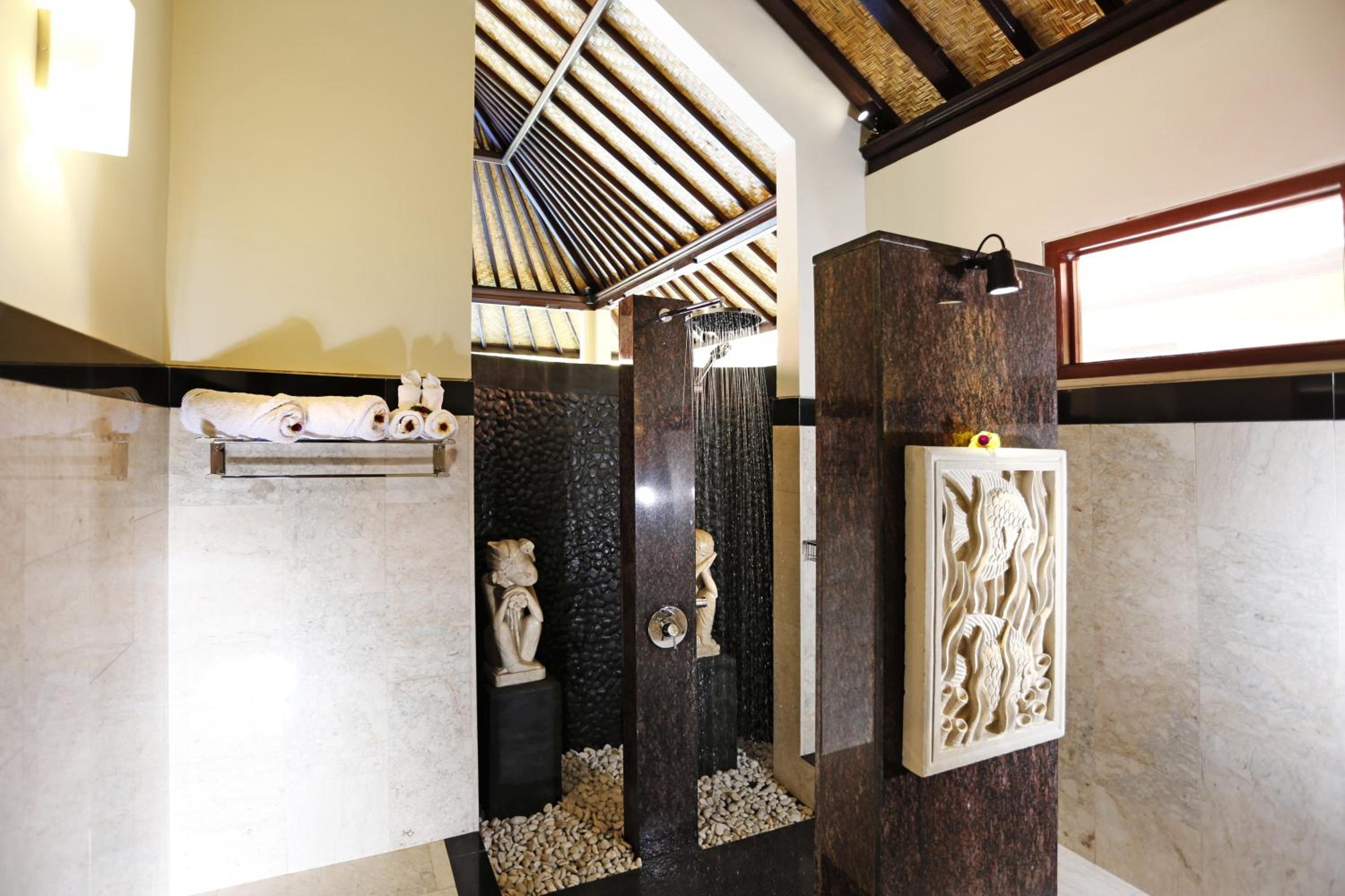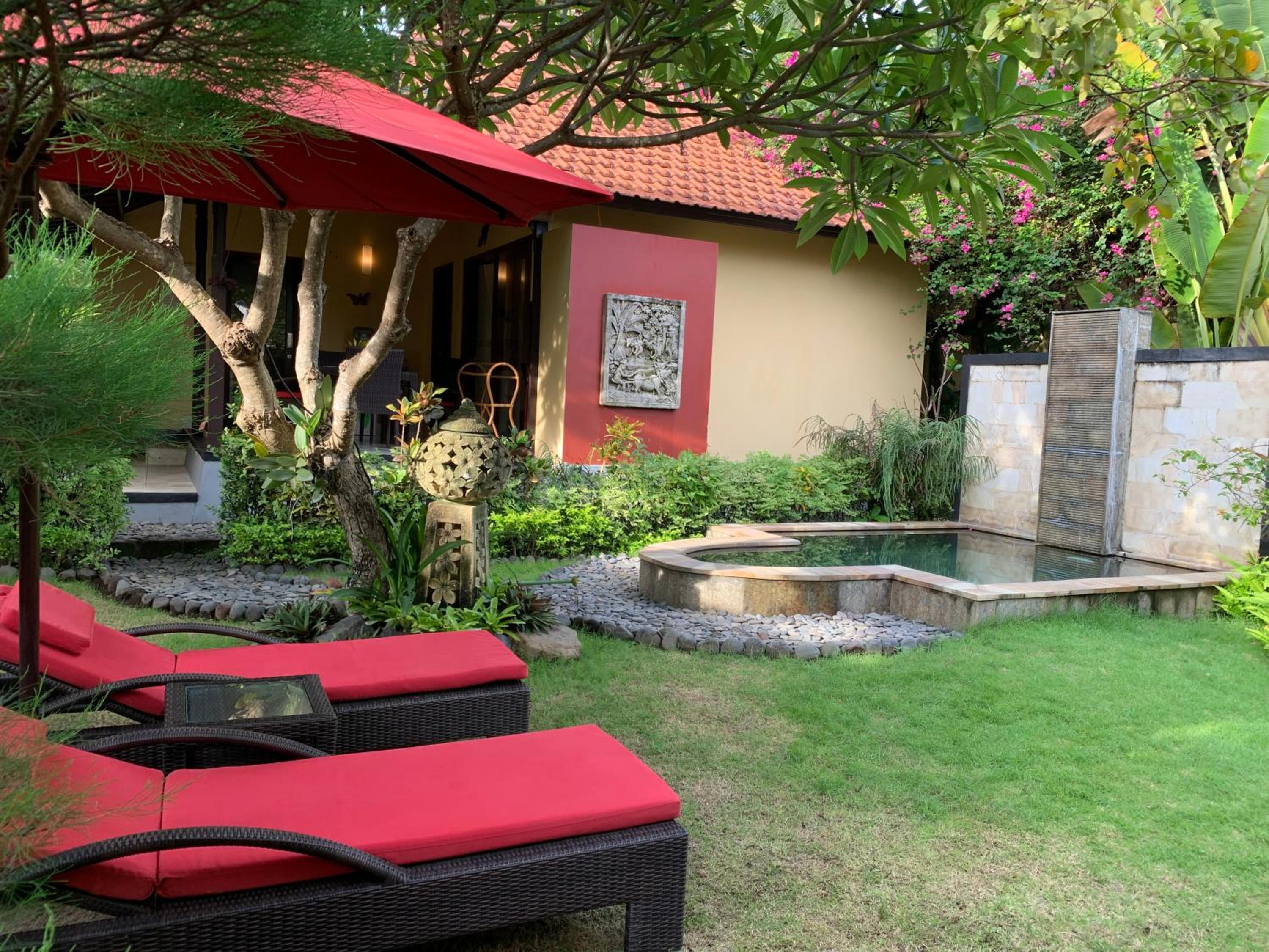 Green and natural setting right near the beach. Hugh rain shower rose in bathroom very Balinese style and beautifully structured. The private seating area outside the room affords privacy and promotes great relaxation enjoying being outside.