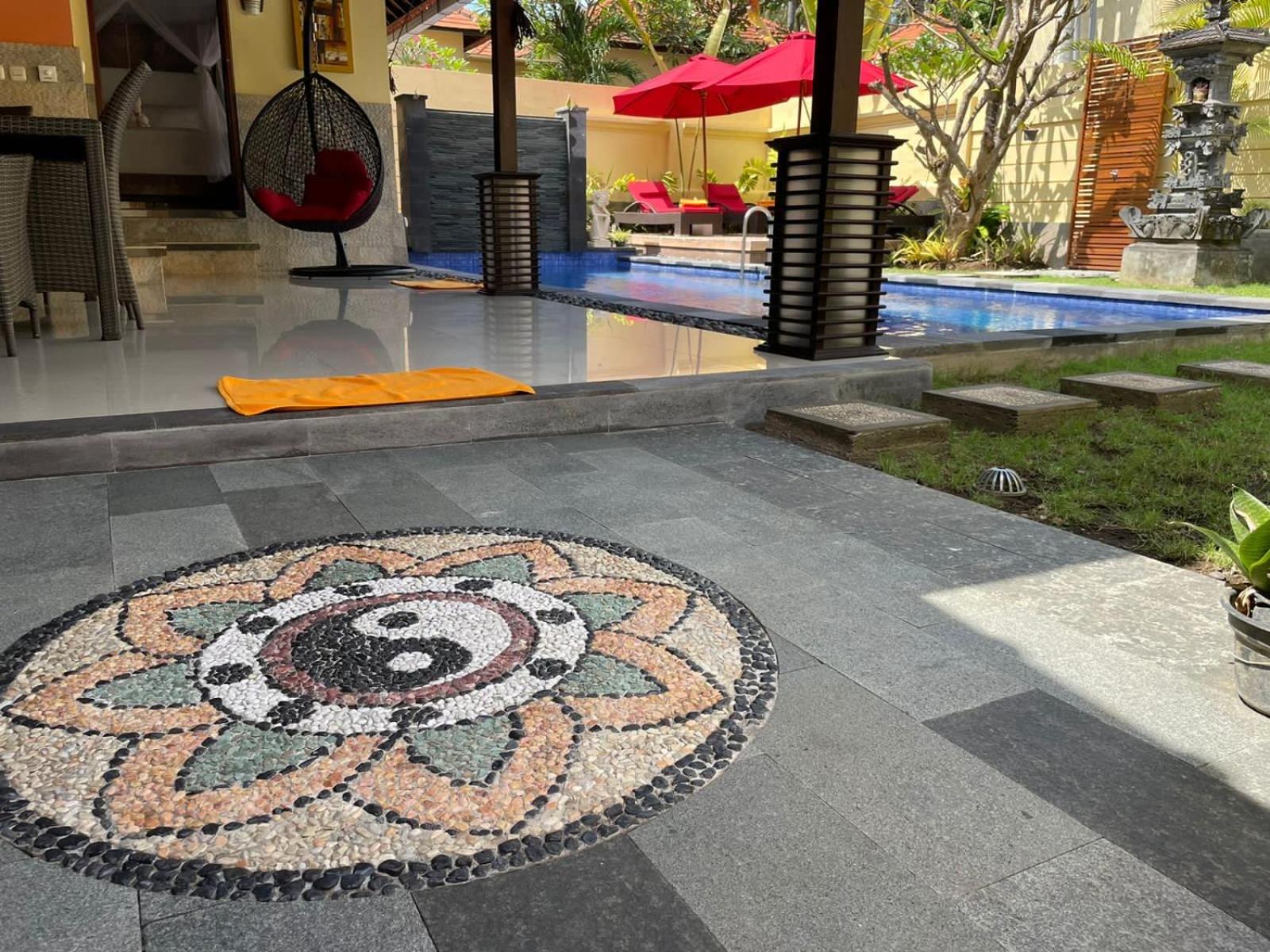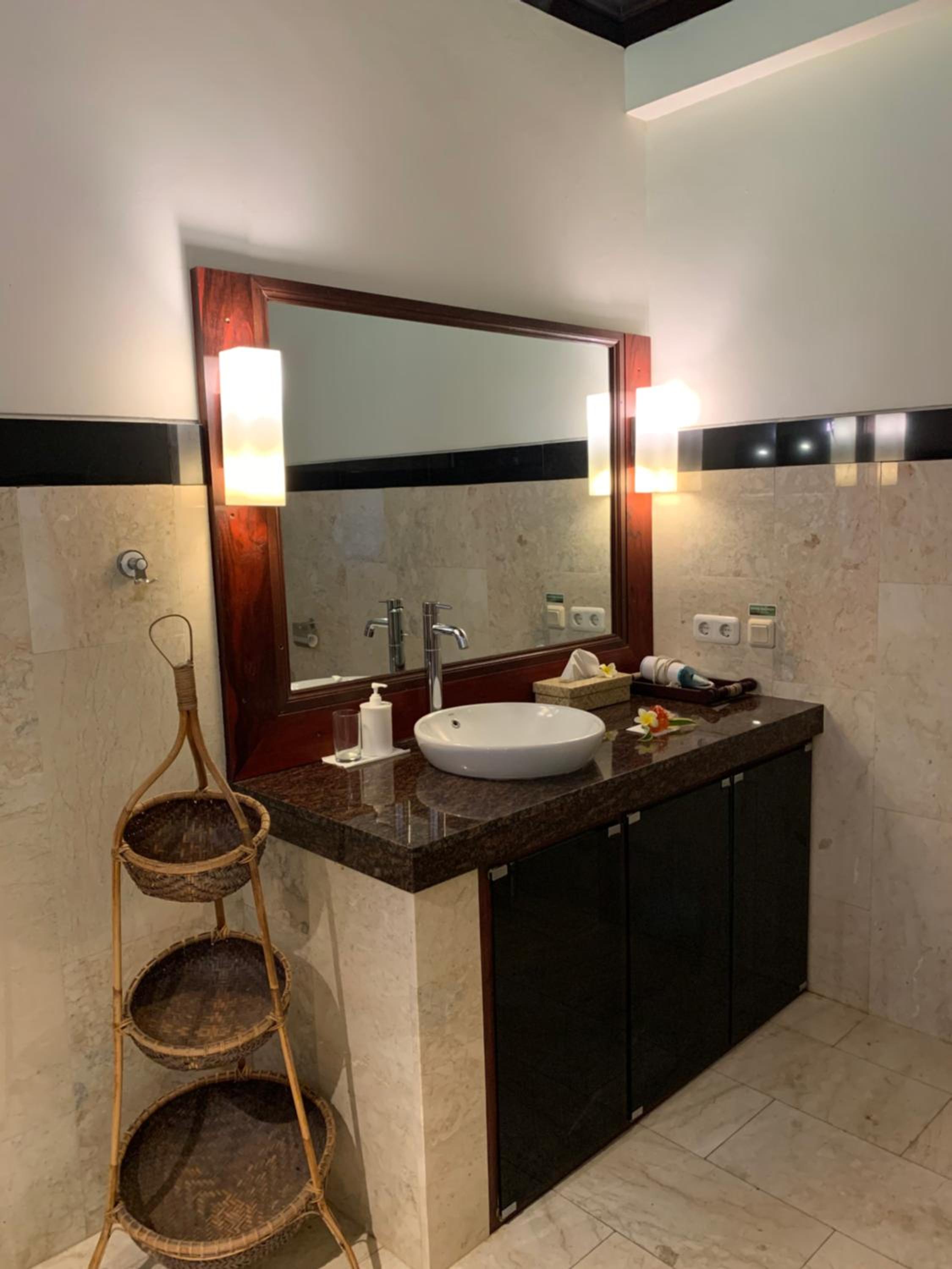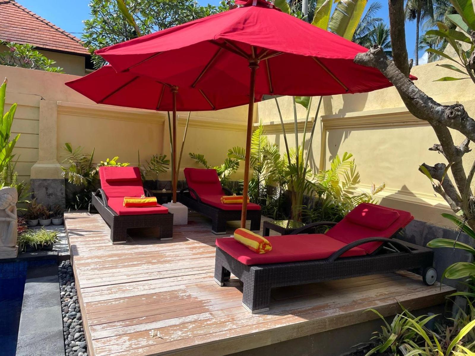 Green and natural setting right near the beach. Hugh rain shower rose in bathroom very Balinese style and beautifully structured. The private seating area outside the room affords privacy and promotes great relaxation enjoying being outside.