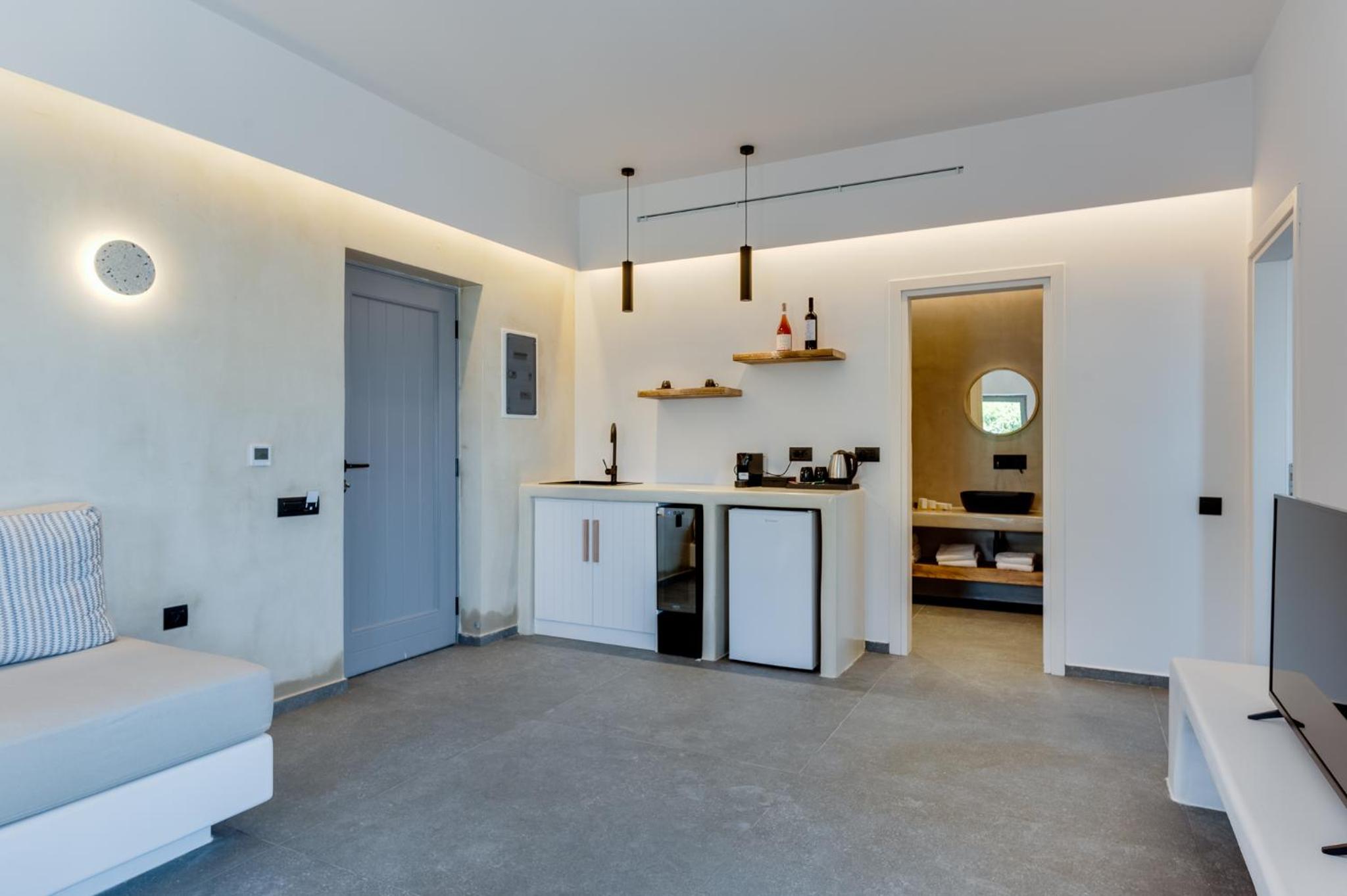 Elements Cozy Suites Pyrgos offers air-conditioned rooms equipped with modern amenities such as a coffee machine, minibar, and flat-screen TV. Guests can enjoy the comfort of a private bathroom and some rooms even boast stunning sea views.