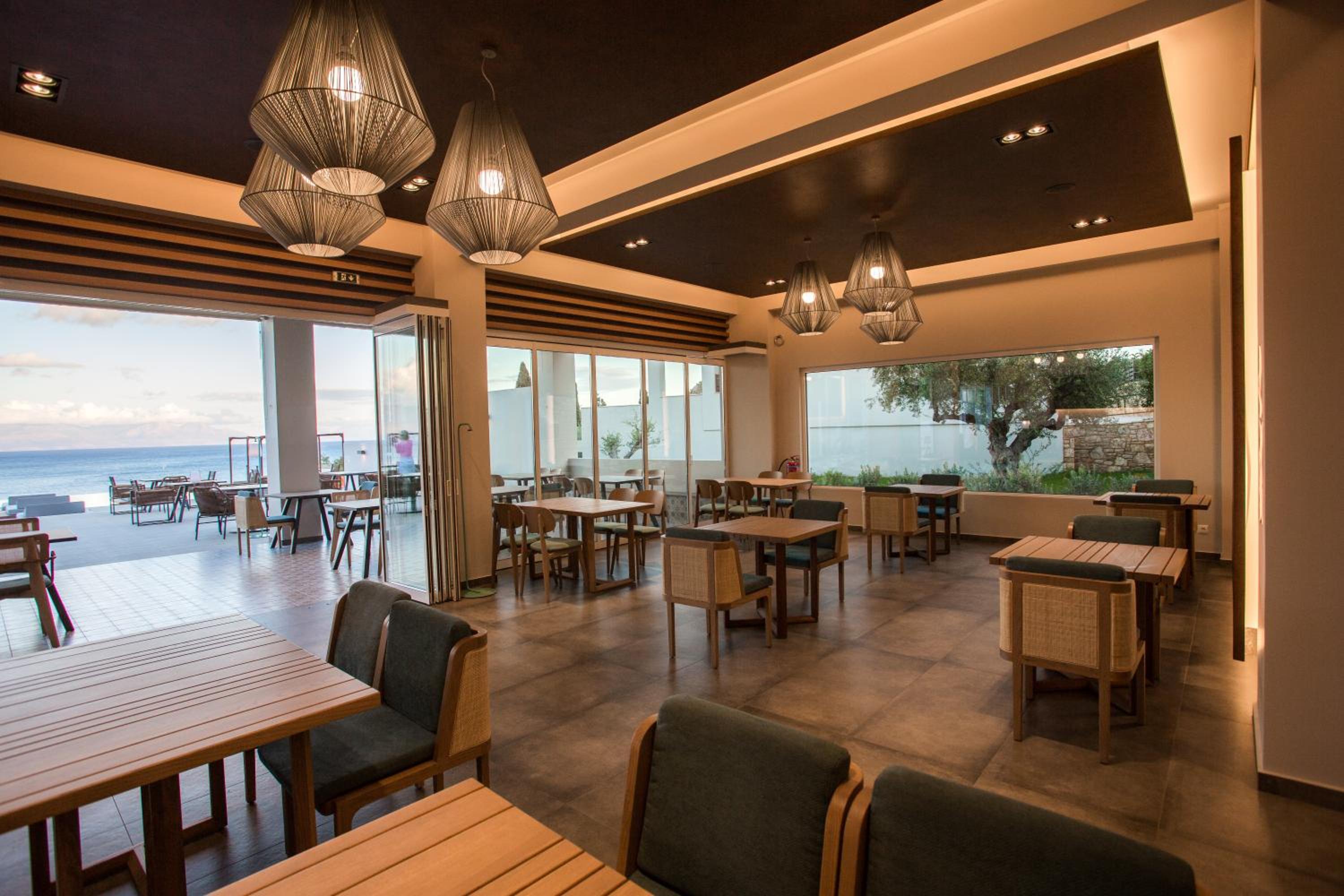 Frühstücksraum mit Sicht auf pool und Meer