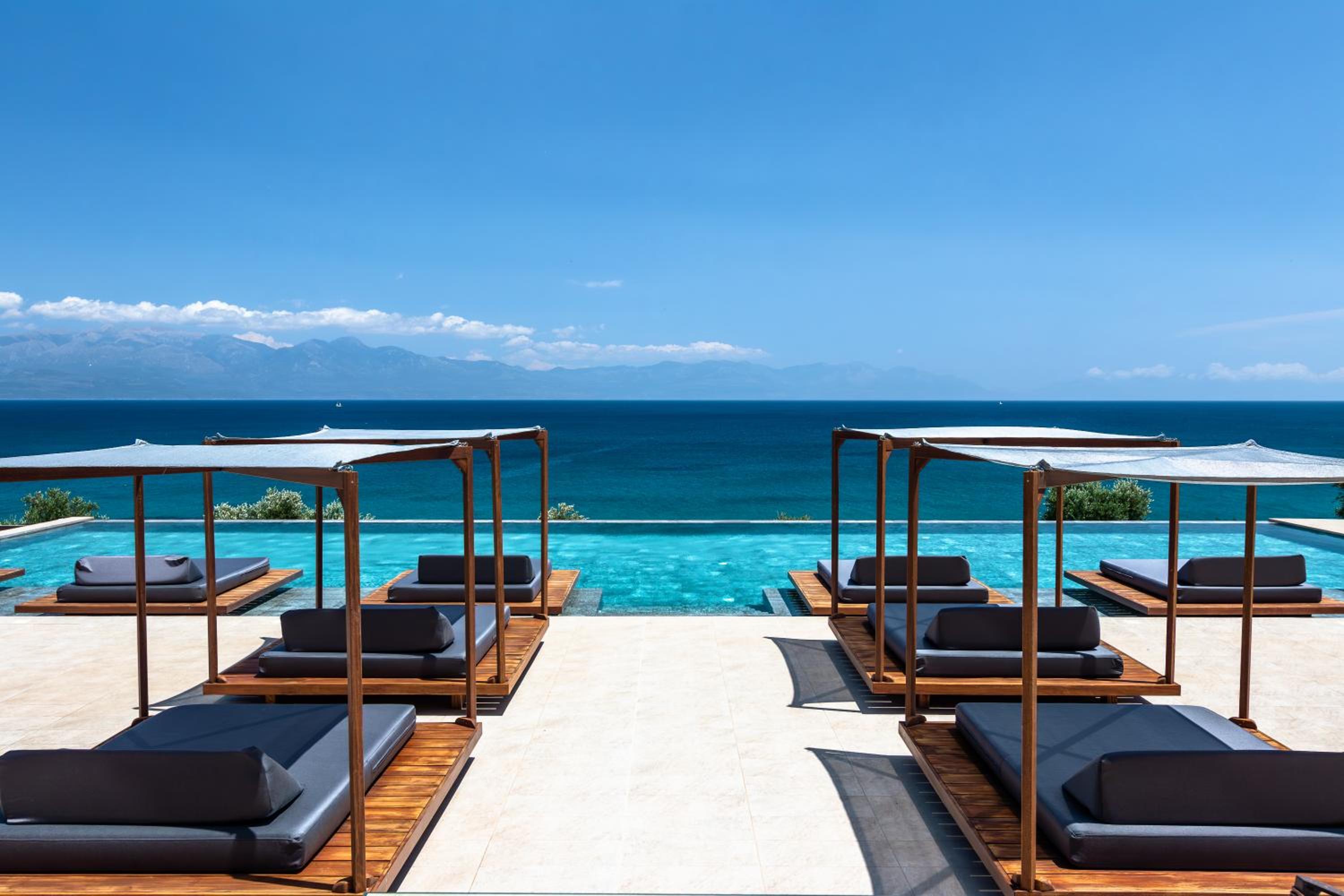 Erst im Meer schwimmen, dann Frühstücken am Pool mit Blick über die gesamte Bucht von Kalamata