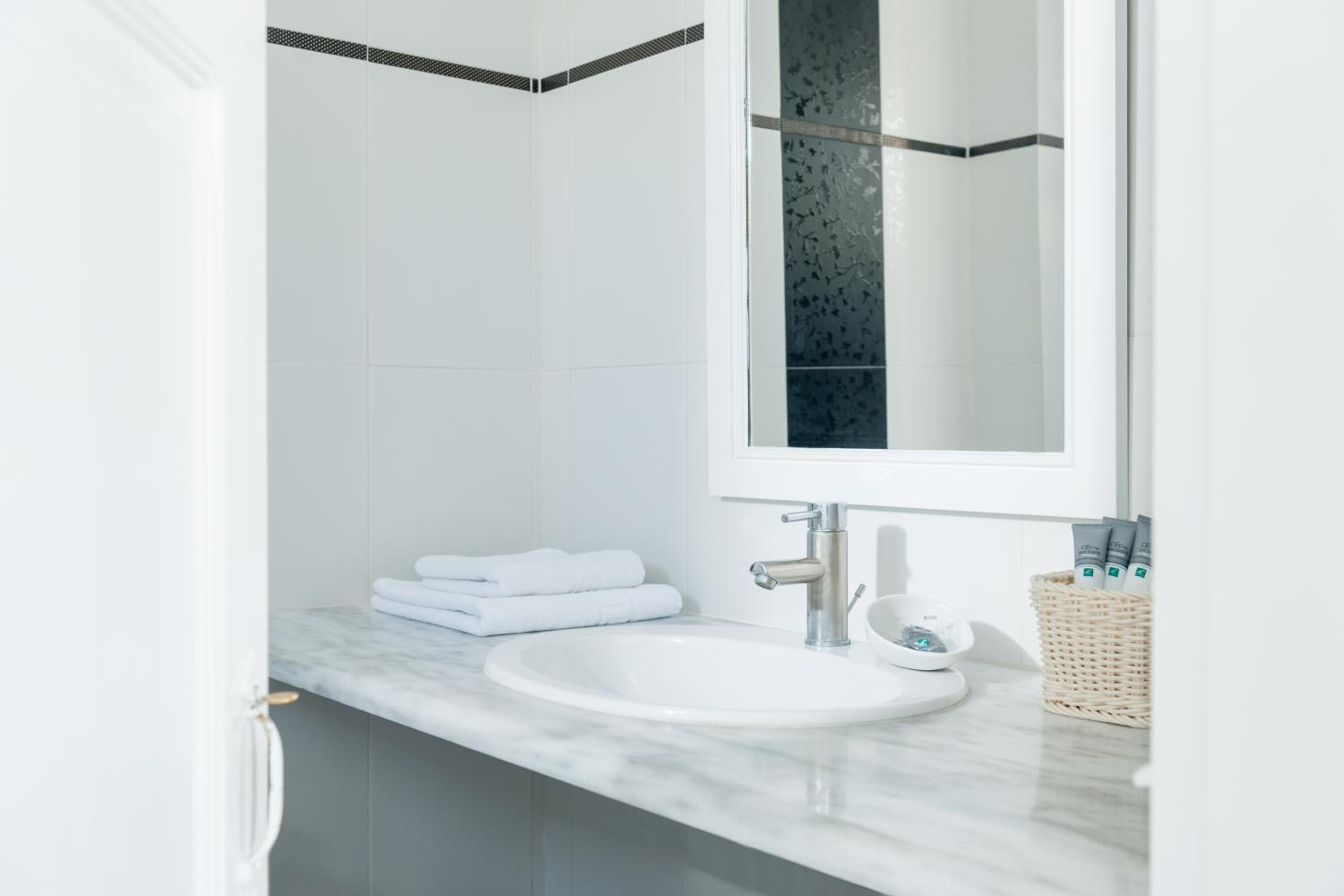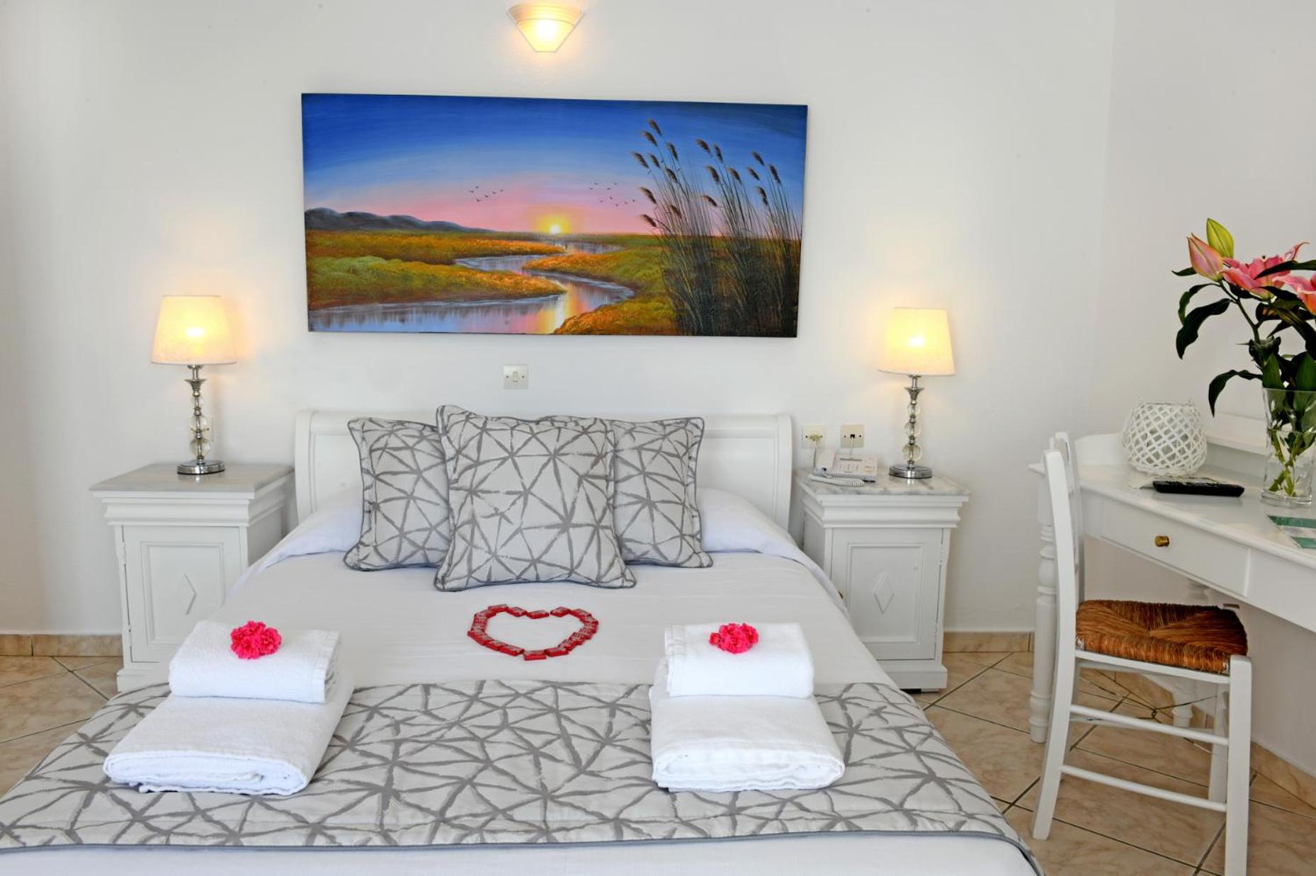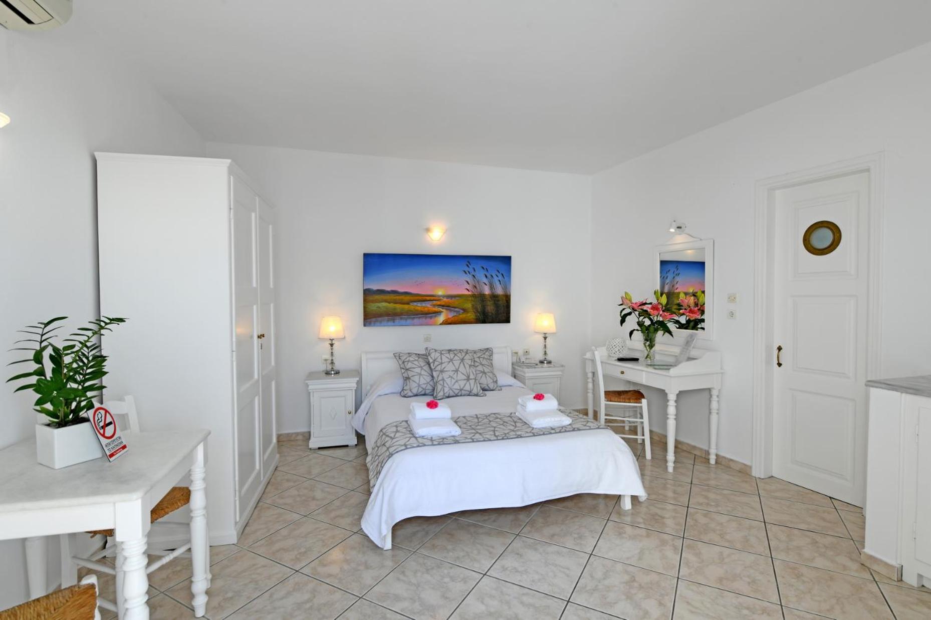 Friendly spotless hotel, typical Greek style. All staff so kind. Our party arrived and departed at different times and the hotel facilitated early check in and late departure for my daughter. Beautiful room and cute breakfast served to the room each morning