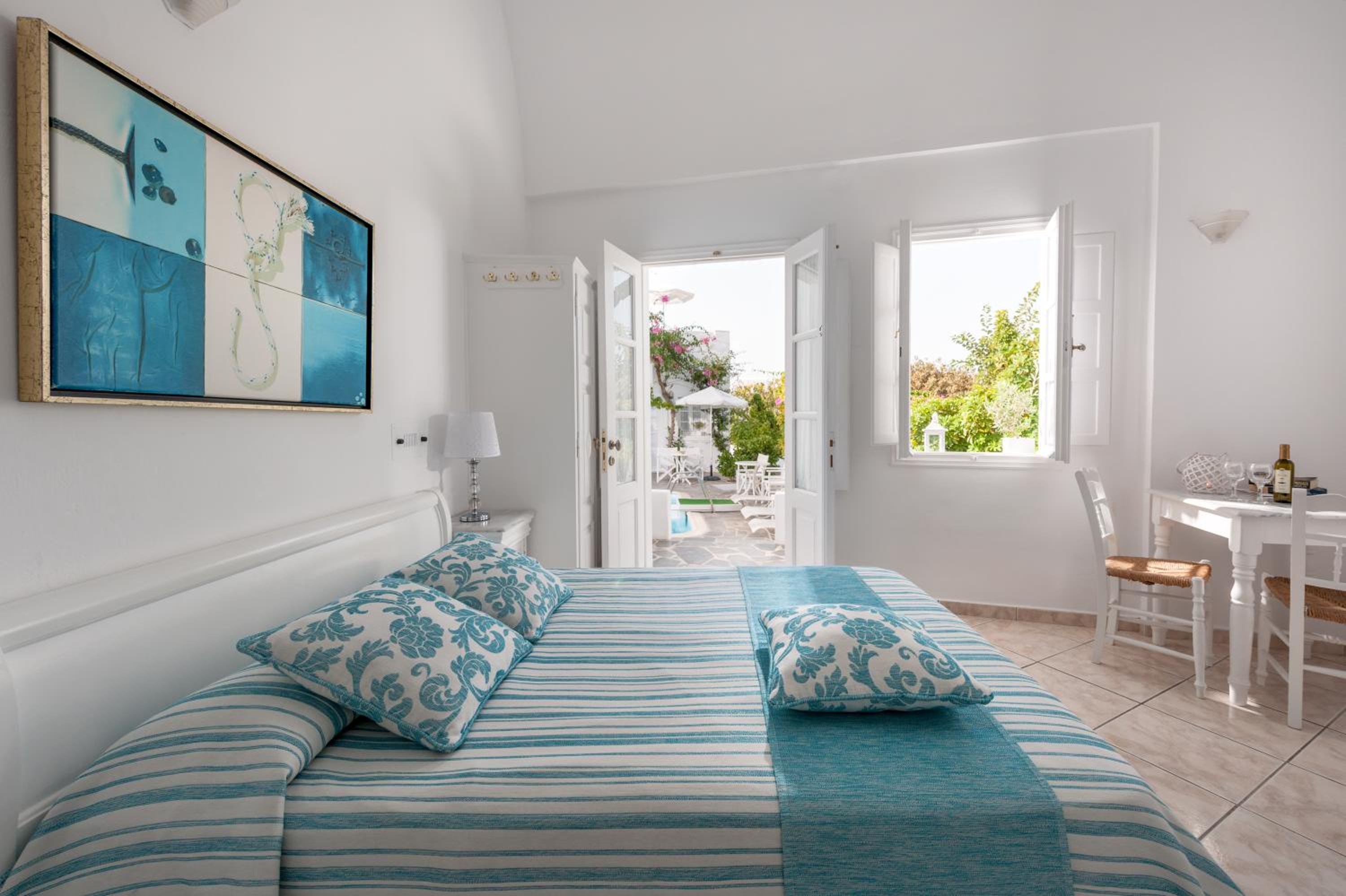 The pool area is serene and relaxing. The beds are comfortable and the room has everything in it you need. It's only a few minutes walk to the amazing caldera views in one direction, shop, restaurants and the bus stop in the other and a few steps to a small supermarket.